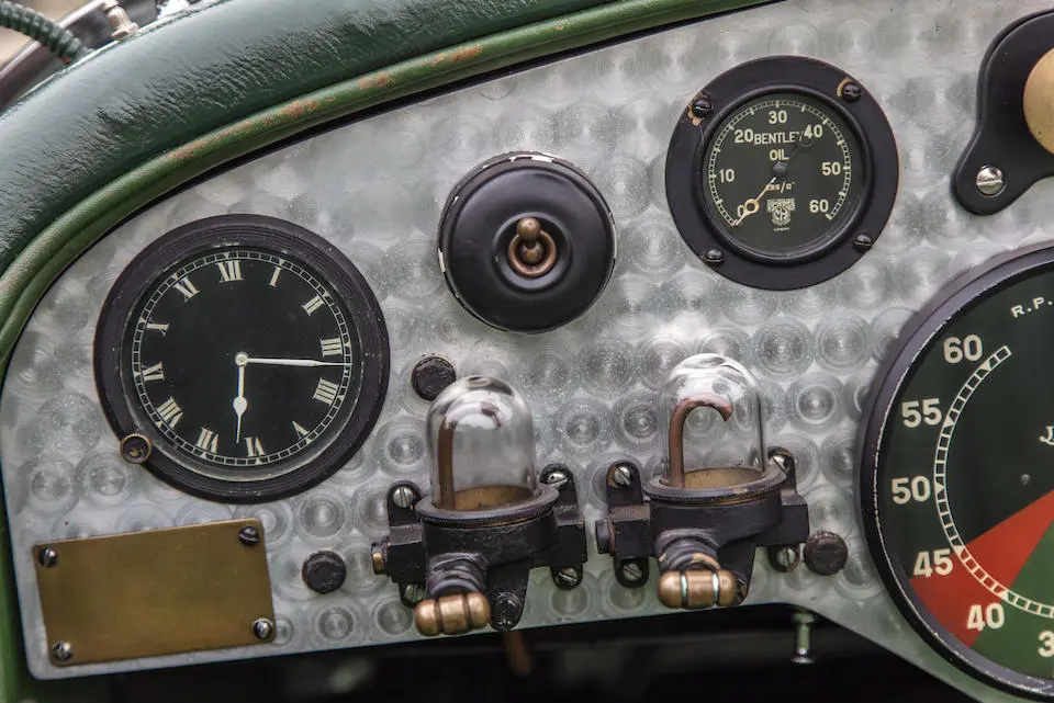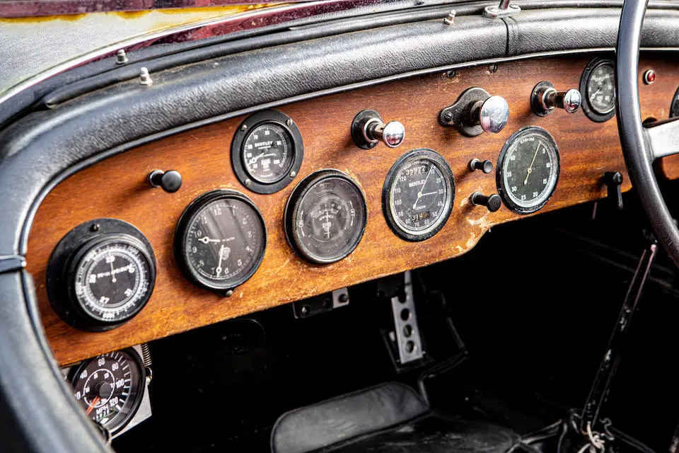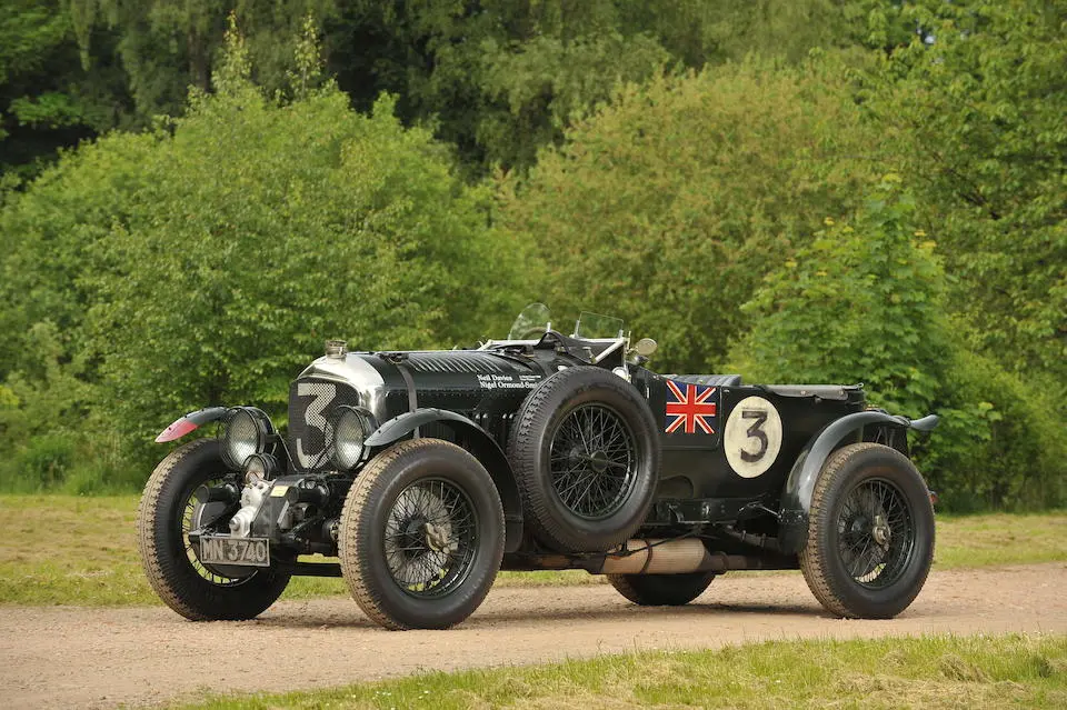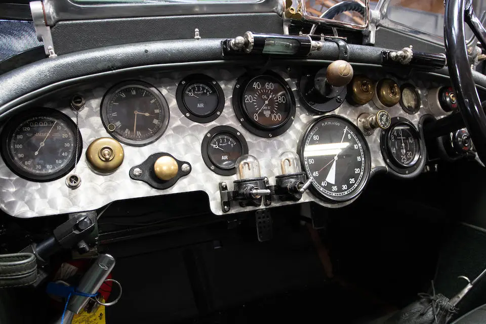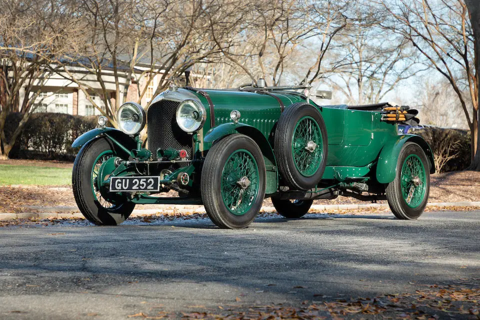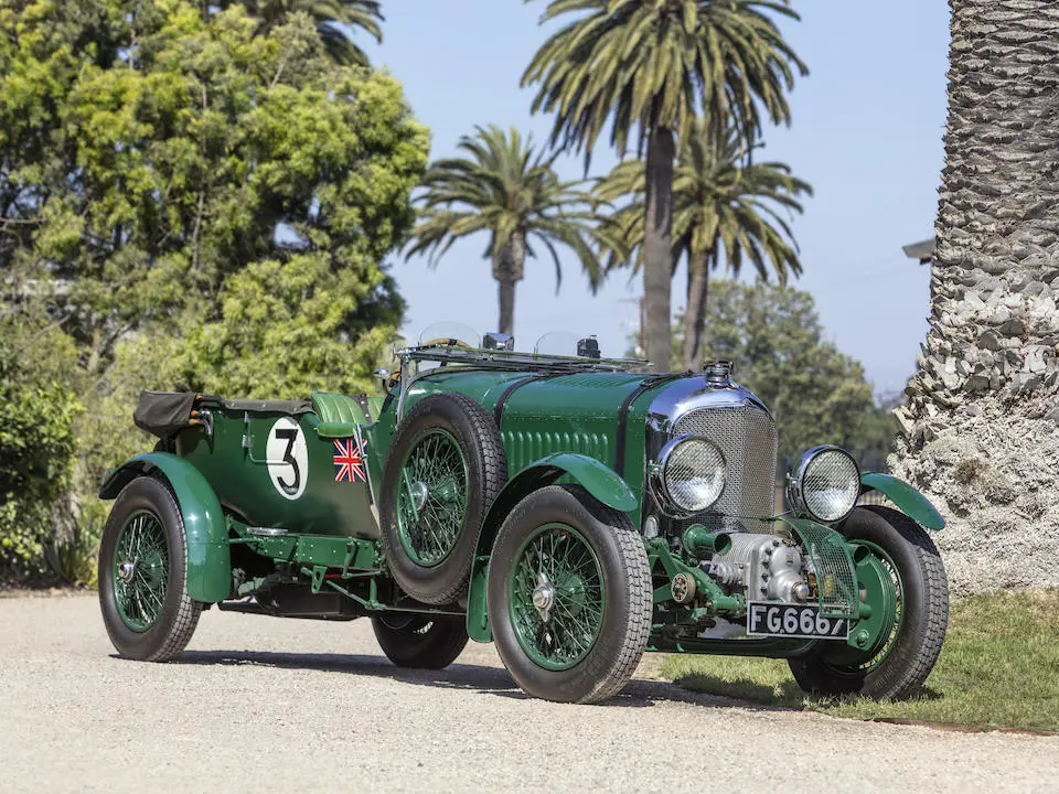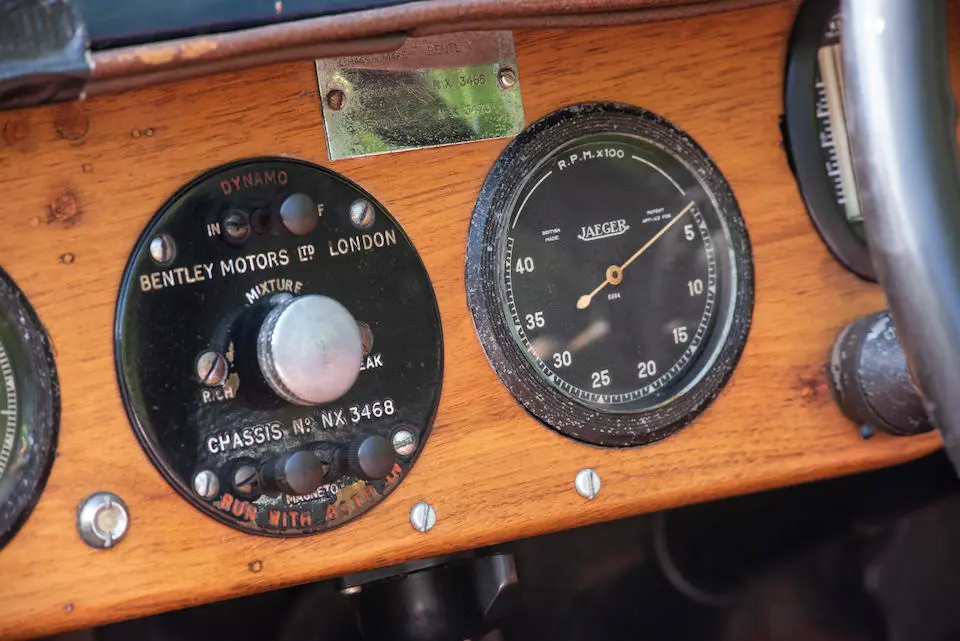 MS 3941 : 1931, 4 ½ l compresseur, Tourer 4 places 2 portes par Vanden Plas, 1/3 châssis aux spécifications Le Mans, taux de compression 5,1 :1, boîte de vitesses Type D, rapport de pont 13/46, échappement avec silencieux Pullswell, réservoir essence 25 gallons, compte-tours, 2 amortisseurs hydrauliques supplémentaires Bentley & Draper sur le pont arrière, pare-brise fixe en une partie, roue de secours latérale côté conducteur, barre supplémentaire à l’avant recevant un 3e phare central, tableau de bord avec 2 lumières d’éclairage supplémentaires et une montre Jaeger, gris clair, cuir gris.