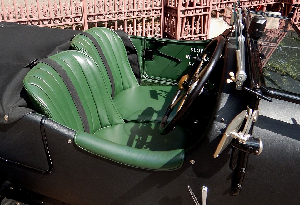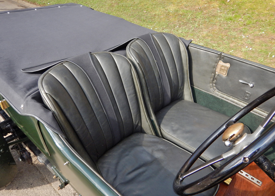 ST 3015 : 1927, Tourer 3 portes 4 places par Vanden Plas (caisse 1428), LWB, Thornly & Knight Grey n°6, ailes se prolongeant par un marchepied, ailes et châssis noir, cuir marron, pare-brise en 3 parties et serrures de portes en nickel noir, essuie-glace Smiths devant le conducteur, jantes pleines, serrures de capot, roue de secours à l’arrière, tonneau-cover.