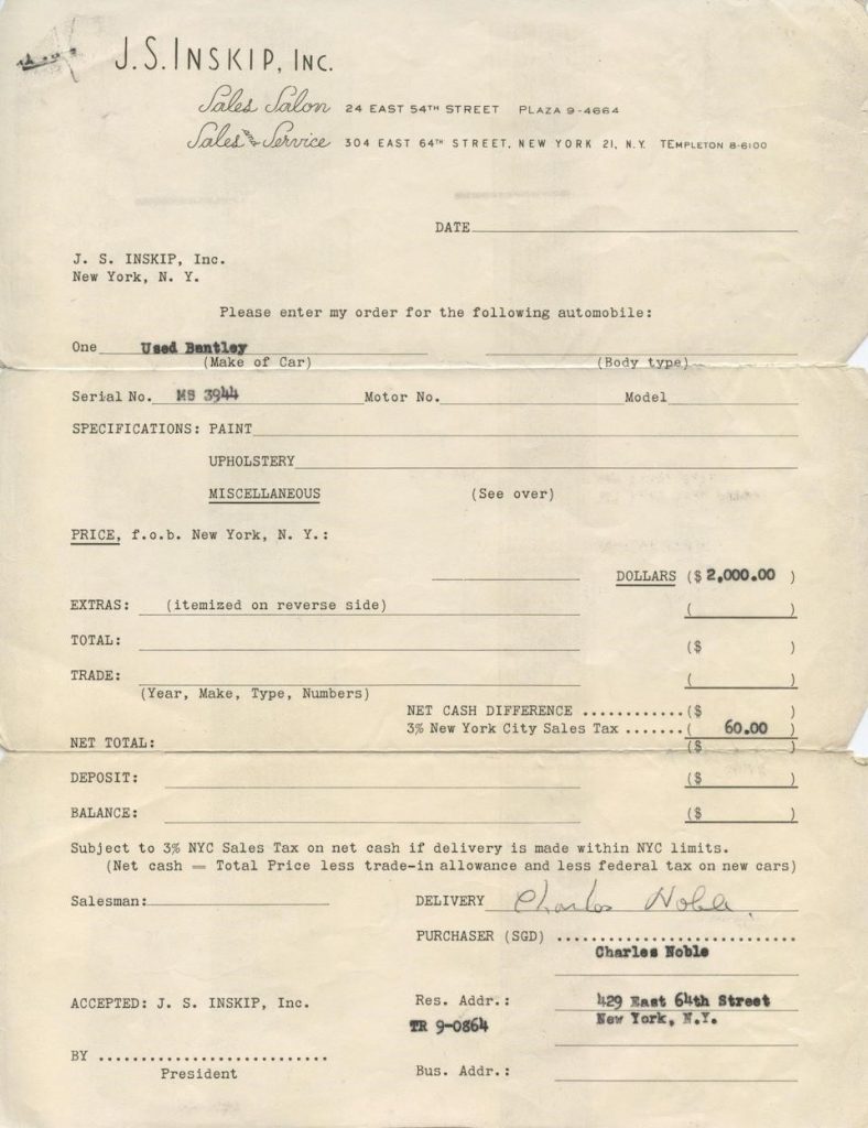 23/10/1957 : Vendue Charles Noble (USA), via Inskip, New-York City (USA), US$ 2.000.