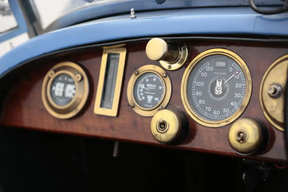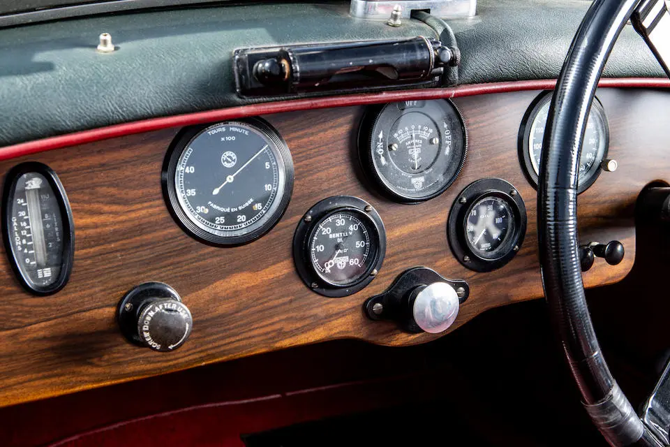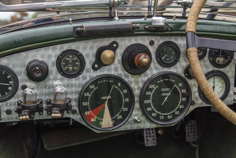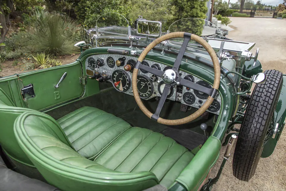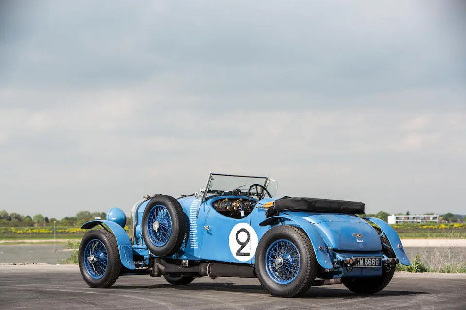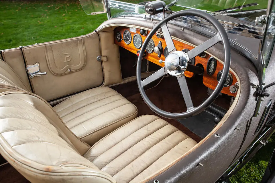 MS 3944 : 1931, 4 1/2 l compresseur, Le Mans 2 Door 4 Seater par Vanden Plas, moteur MS 3941, 1/3 aux spécifications Le Mans avec châssis allégé, roue de secours sur l’aile côté conducteur, pare-brise droit rabattable, 3e feu de route central monté sur une barre, pistons haute compression, taux de compression : 5,1 :1, boîte de vitesses Type D à rapports rapprochés, rapport de pont : 13/46, silencieux Pullswell, amortisseurs hydrauliques Bentley & Draper à l’arrière, compte-tours, montre Jaeger, éclairage, réservoir 45 gallons, Gris clair, cuir gris.