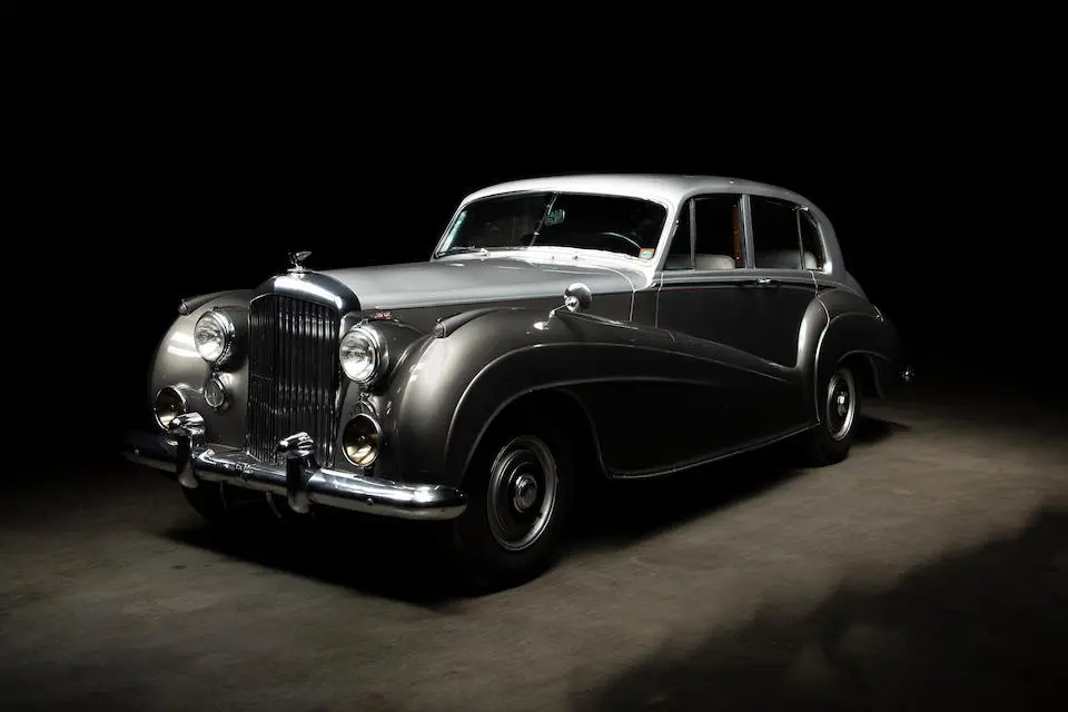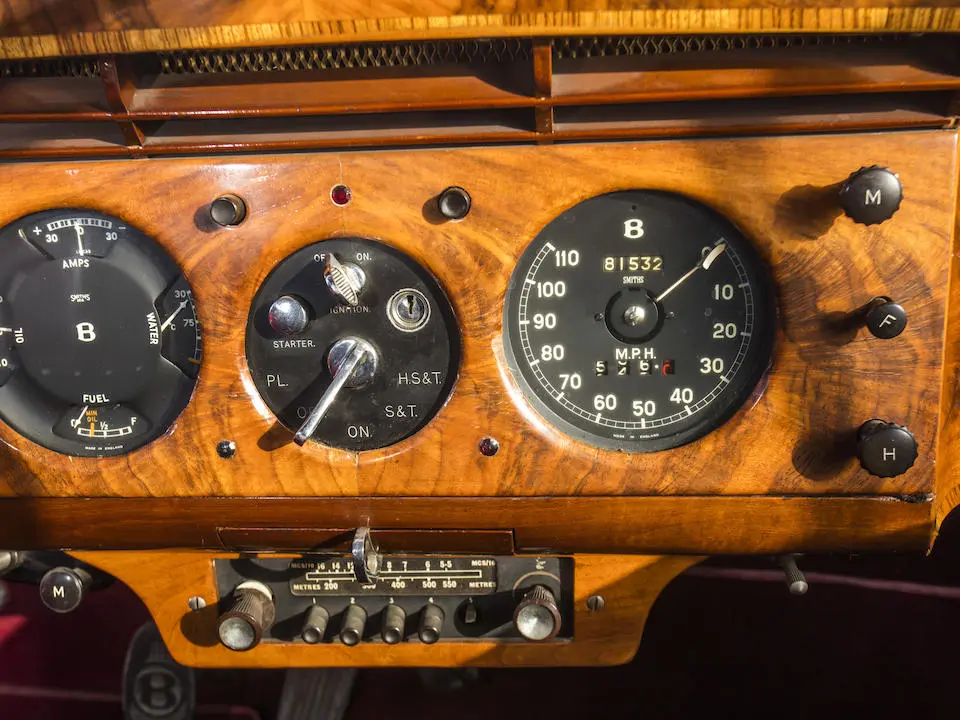 B 6 L XF : 1954, R Type Saloon par H.J. Mulliner, caisse acier, CAG, moteur B3X, boîte de vitesses automatique, réservoir essence plat, rapport de pont 12/41, pare-chocs Pyrene, phares antibrouillard, clignotants, antenne électrique, antivol sur portières avant, Metallic Tudor Grey, cuir rouge.