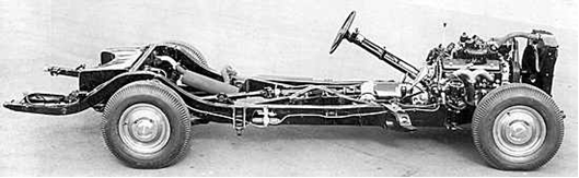 Châssis à longerons et double renfort central en X. Structure en échelle renforcée par des croisillons et traverses.