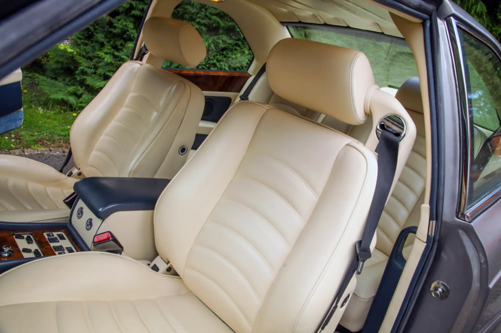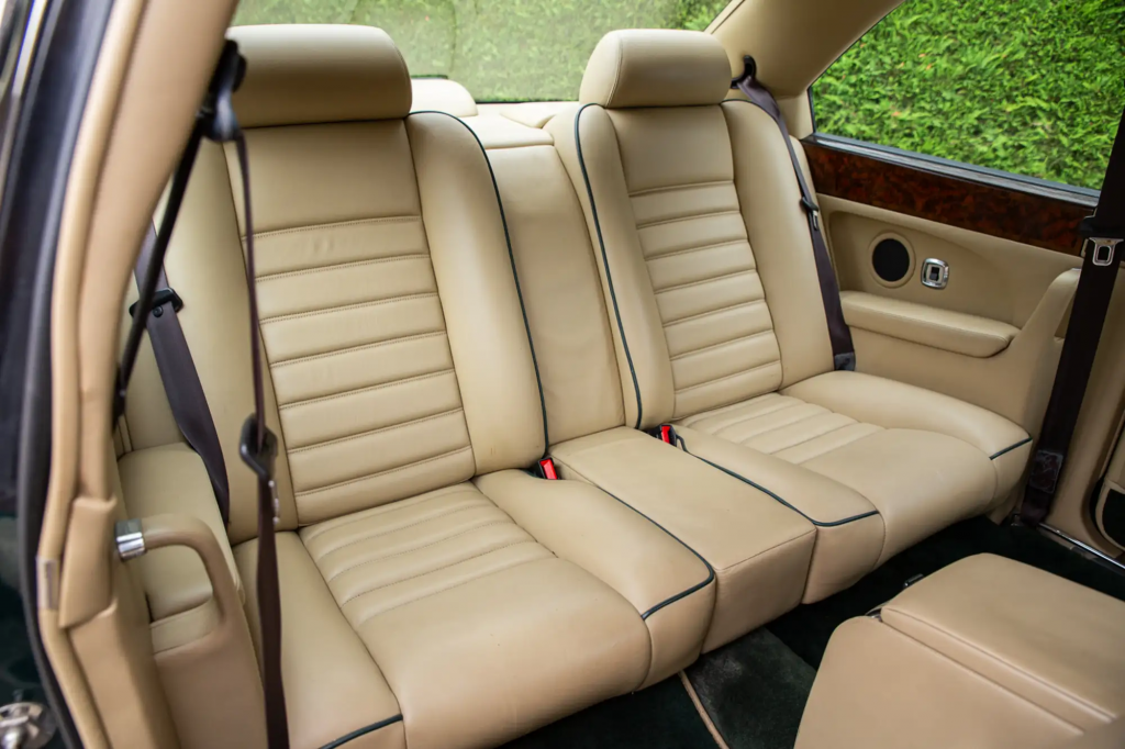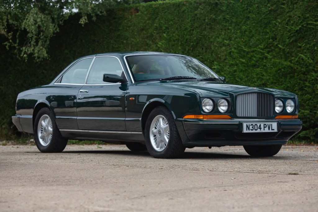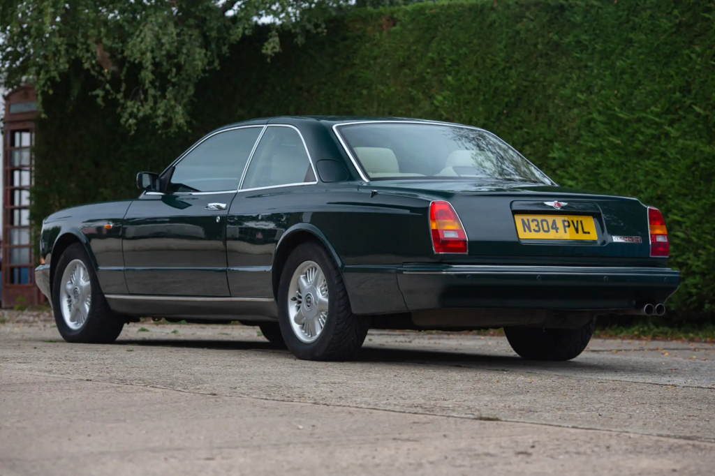 WCH 63113 : 24/02/1998, R Type Continental, la seule aux spécifications T : moteur 420 chevaux n° 89492L410M/TTW, Ascot Green, cuir sable, prises d’air sur le spoiler avant et sur les ailes, jantes 18 pouces à 5 bâtons, calandre grillagée, entourages de phares chromés, pommeau de levier de vitesses en noyer, boiseries latérales ronce de noyer, cerclage des compteurs chromés, volant spécial cuir et bois, sièges spéciaux, appuie-têtes au logo Bentley, store arrière électrique, GPS et 2 écrans TV, 2e téléphone dans l’accoudoir arrière.