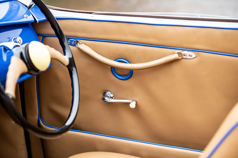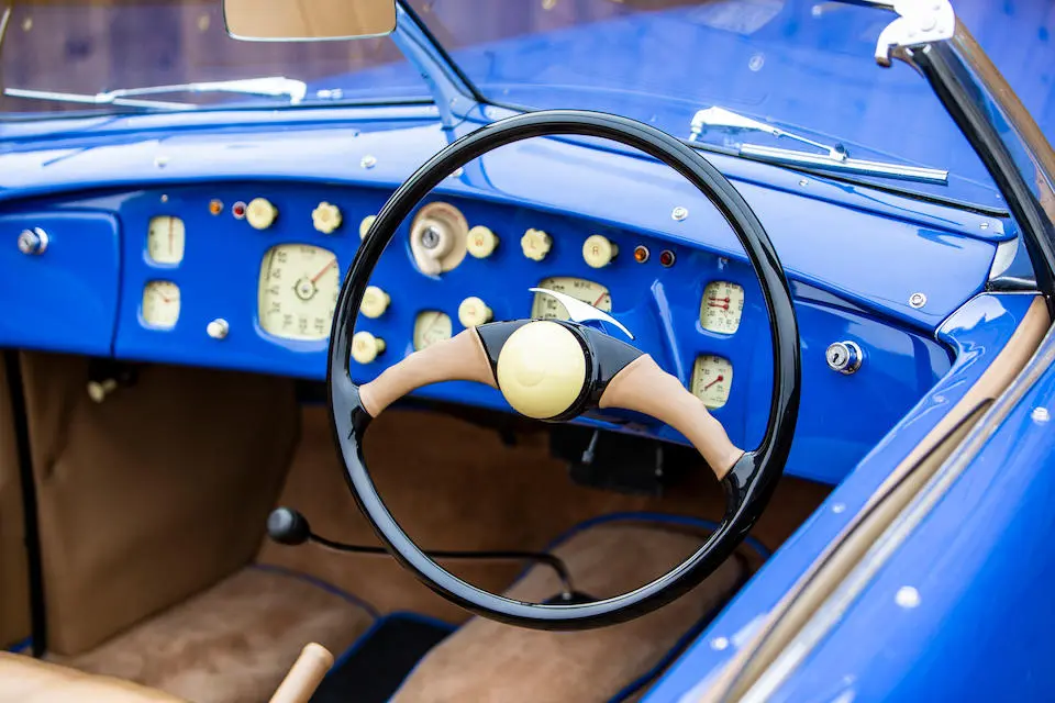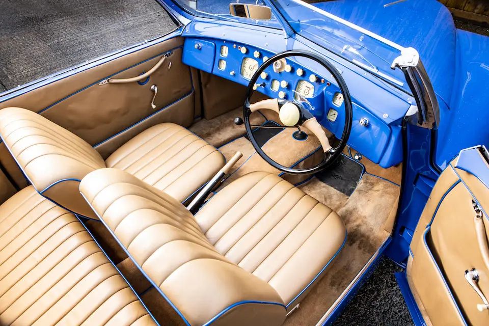 673 : 1950, 401, moteur 85C/1524, gris métallisé, cuir crème, ¼ avec tableau de bord en métal nickelé style Art Déco.