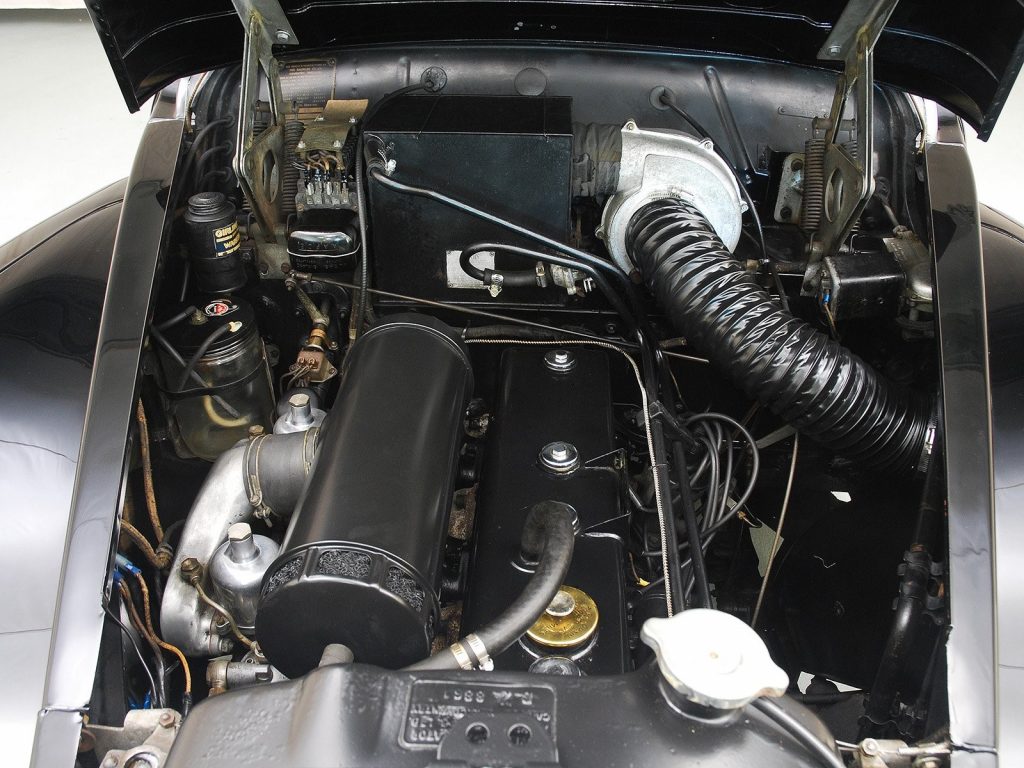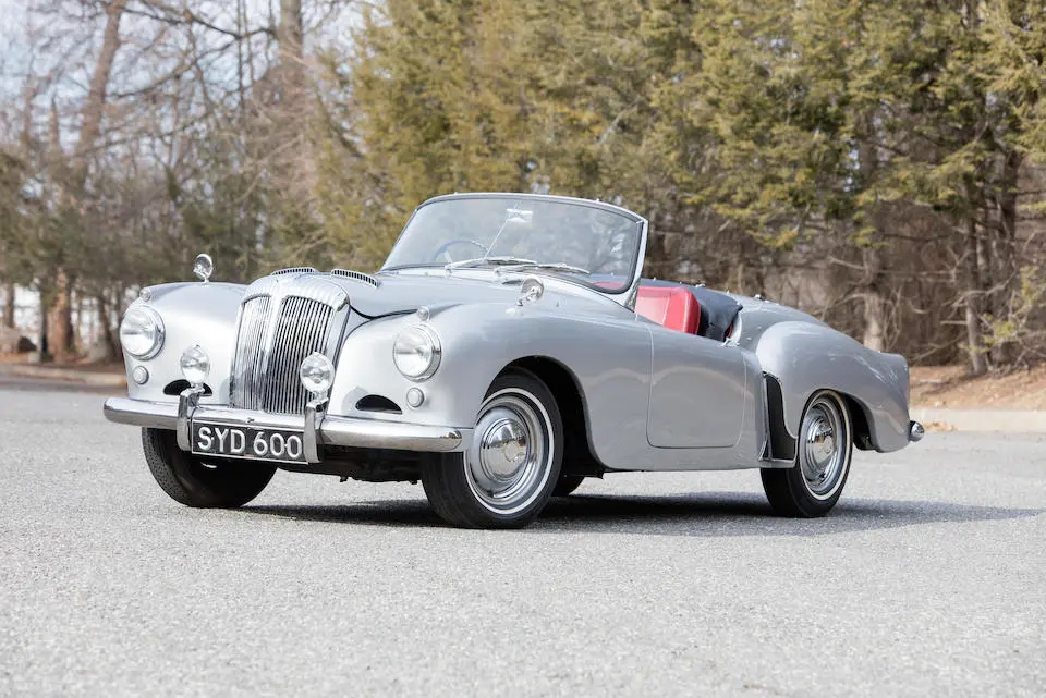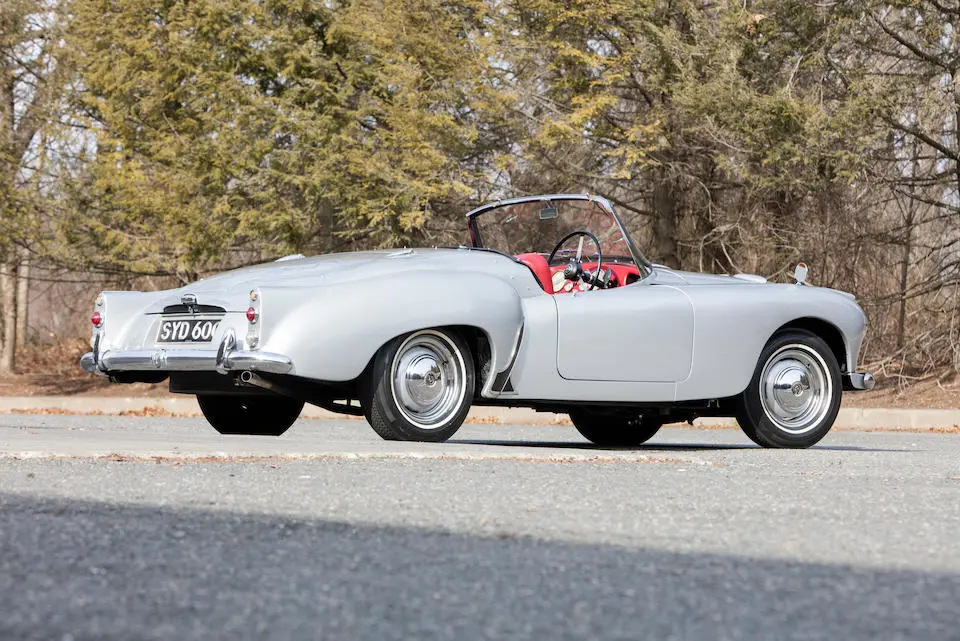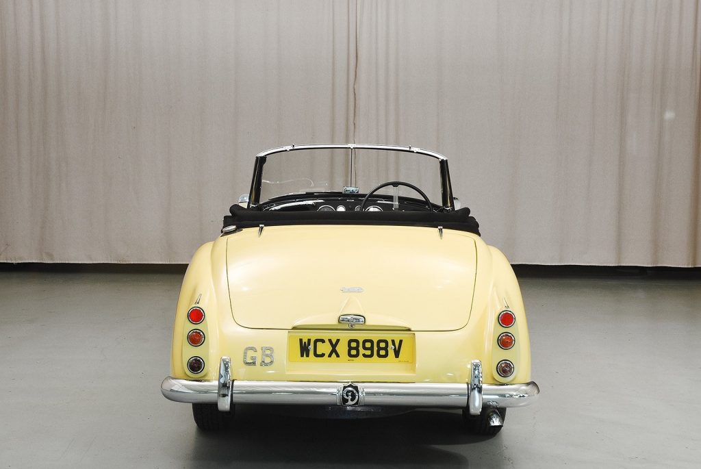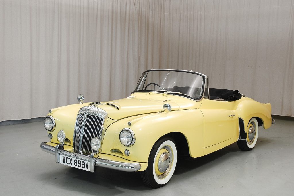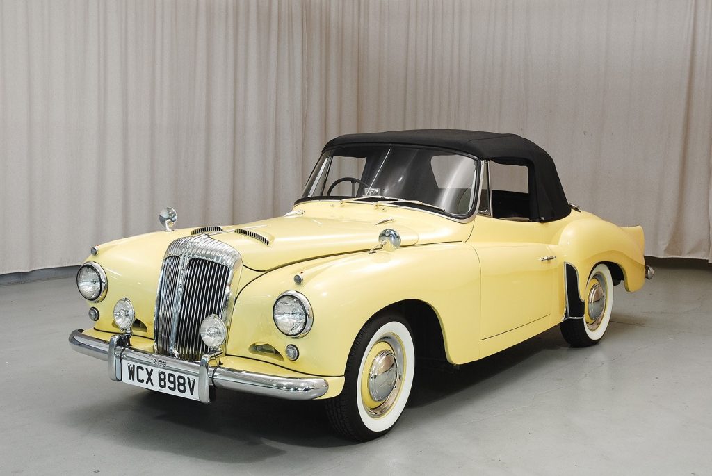 10/1955 : Salon de Londres, Earls Court (G-B) : Le Roadster est remplacé par la New Drophead Coupé avec 3e siège à l’arrière, capote, découpe de portières plus haute et plus angulaire, pare-brise encadré de deux déflecteurs latéraux. Carrosserie en acier jusqu’aux déflecteurs avant et aluminium pour le reste sauf les passages de roues arrières.