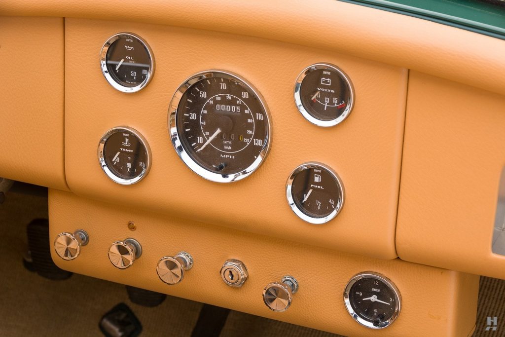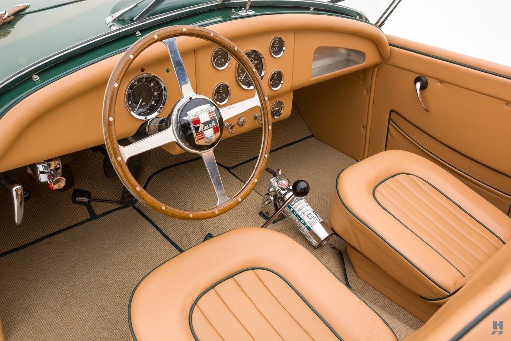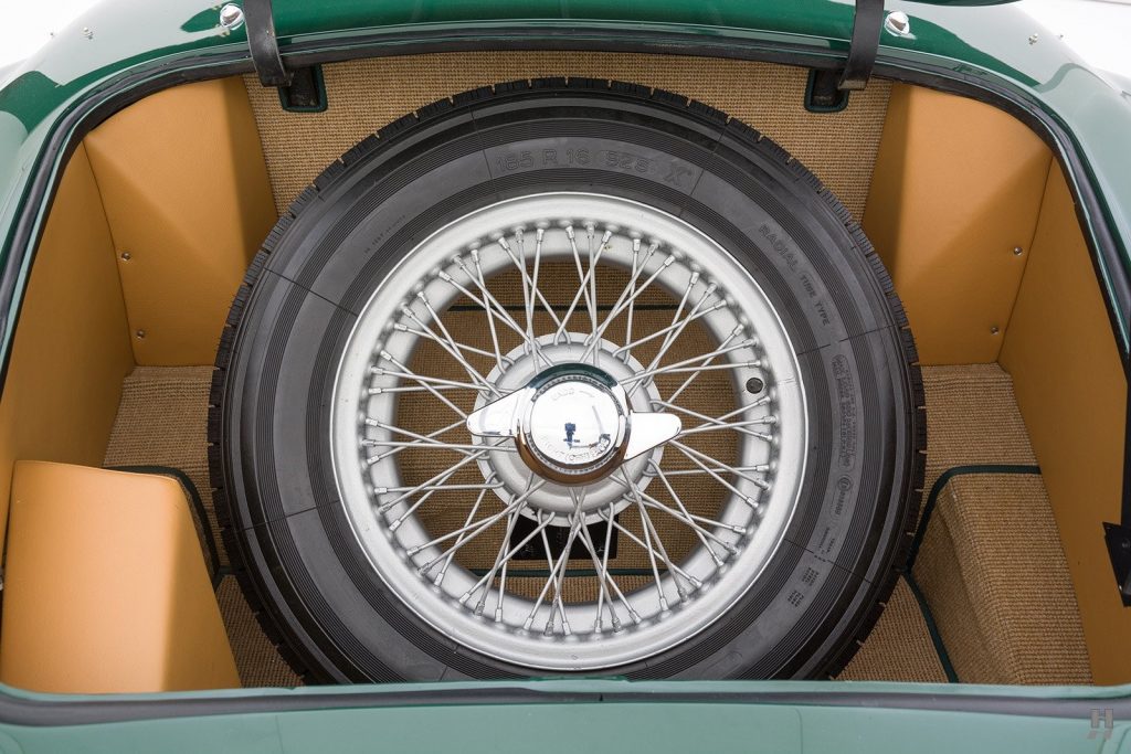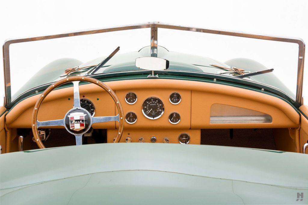 Carrosserie roadster 2 places entièrement en aluminium réalisée en Grande-Bretagne chez Panelcraft, pare-brise en V en 2 parties.