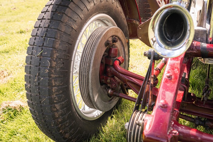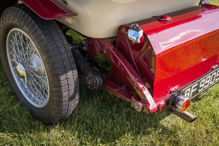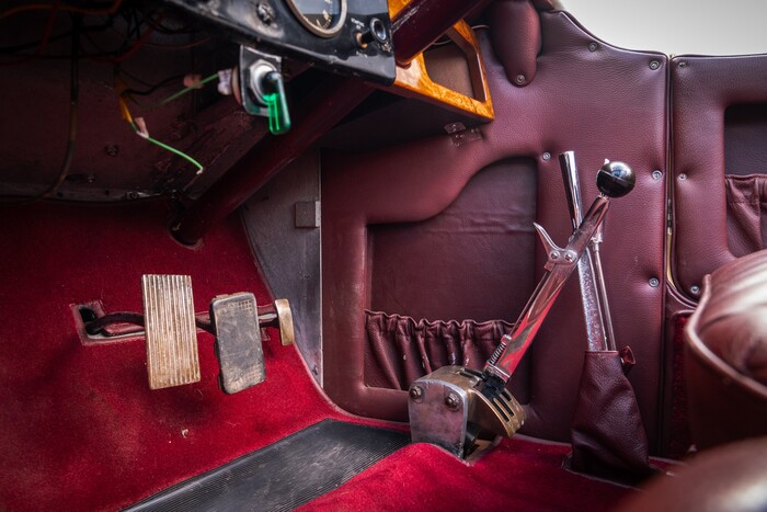 Le châssis est construit aux dimensions originales avec les mêmes matériaux. D’autres pièces sont reproduites aux formes et avec les matériaux utilisés à l’époque : volant, tableau de bord.