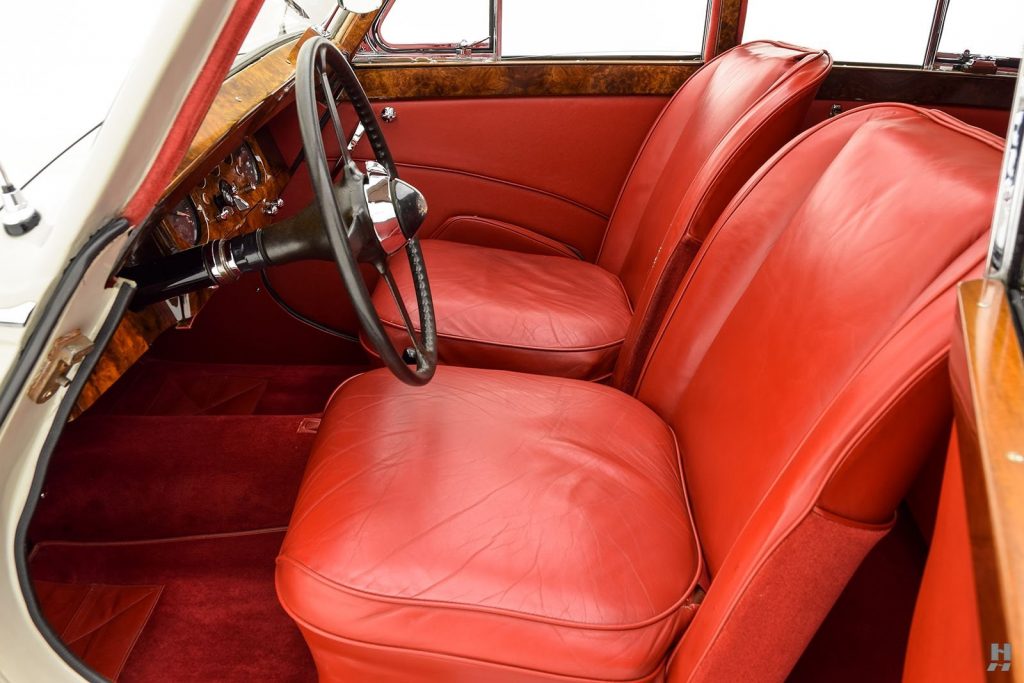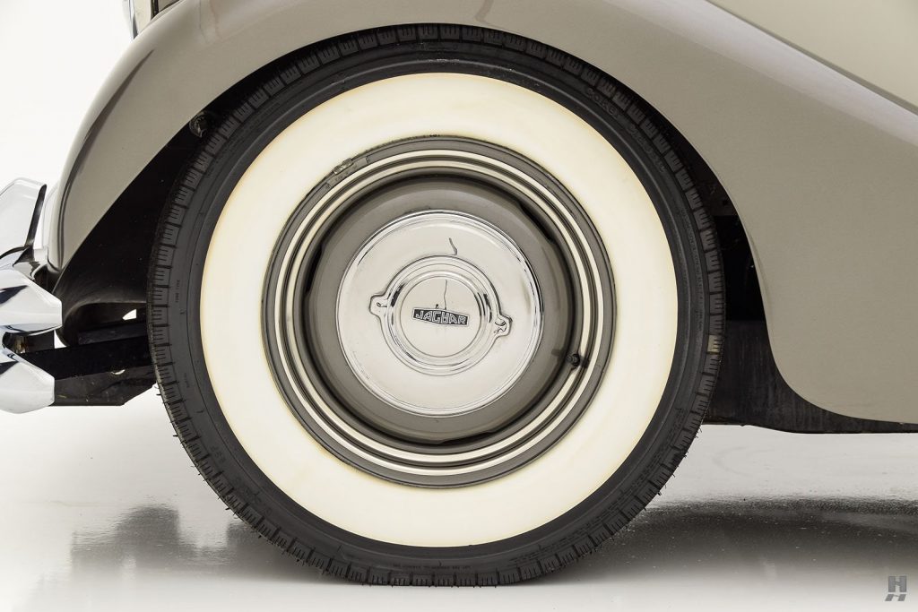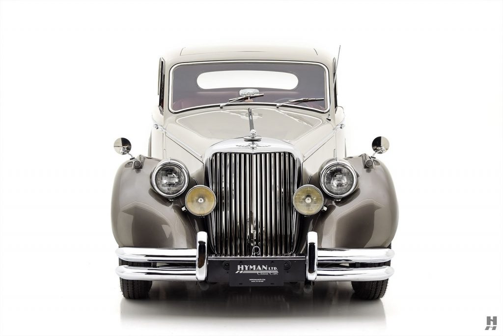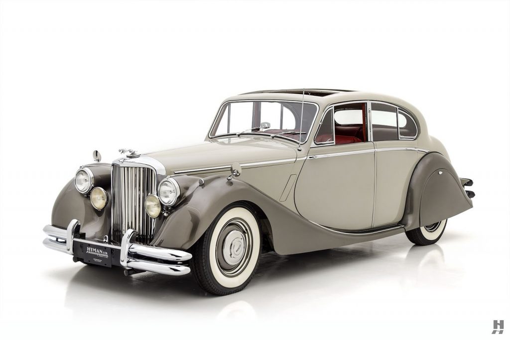 09/1948 : Présentation de la MK V en berline 4 portes et convertible 2 portes à Earl’s Court, Londres (G-B). Reprend le capot ouvrant en 2 parties et la haute calandre mais reçoit les phares tripodes de la XK120 en place des grosses optiques Lucas, disparition des gros montants de pare-brise et des roues à rayons. Nouveaux pare-chocs doubles homologués aux Etats-Unis.