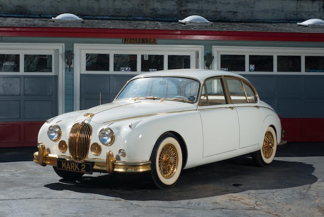 1960 : Jaguar présente la MK2 au salon de New-York City (USA). A cette occasion la firme fabrique une MK2 spéciale : The Golden Jaguar avec tous les éléments chromés intérieurs et extérieurs plaqués or (pare-chocs, calandre, poignées de portières, jantes, valves de pneus, embouts d’échappement, lève-glaces, contacteurs, cendriers …), la peinture est réalisée manuellement en blanc et l’intérieur garni de cuir blanc. La voiture est présentée par Dorothy Mc Donough qui reçoit une tenue adaptée : robe spécialement conçue en fils d’or 24 K, porte-jarretelles en or, de même que les chaussures, bijoux, y compris une tiare en or sertie de 1000 diamants, donnée par Napoléon à l’impératrice Joséphine, et prêtée par Van Cleef & Arpels.