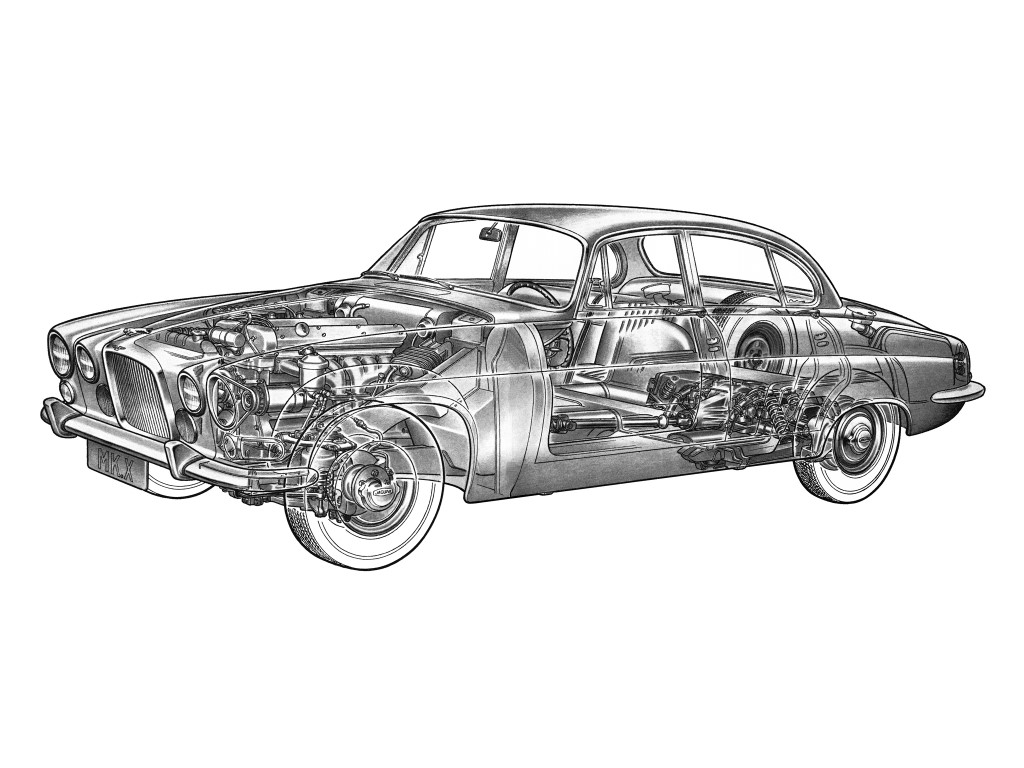 La ligne de la voiture est due à Sir William Lyons qui travaille sur un modèle grandeur nature et y fait introduire les modifications au fur et à mesure. Il dessine une nouvelle berline haut de gamme moderne rompant totalement avec les modèles précédents.