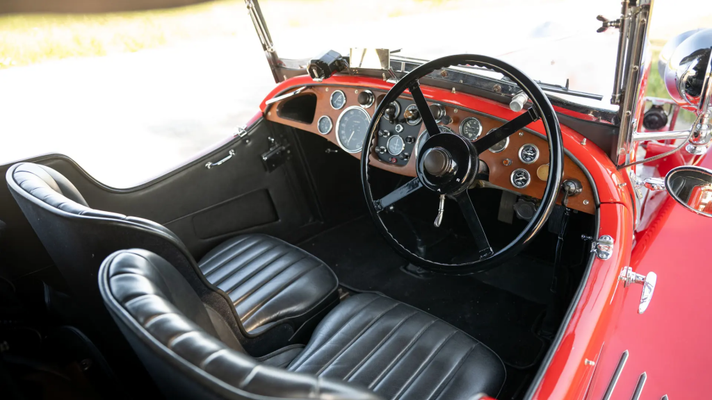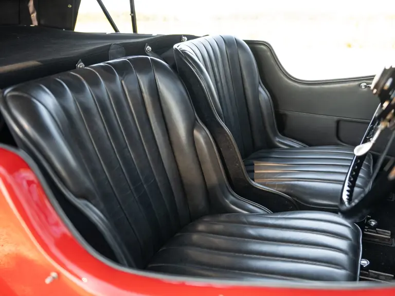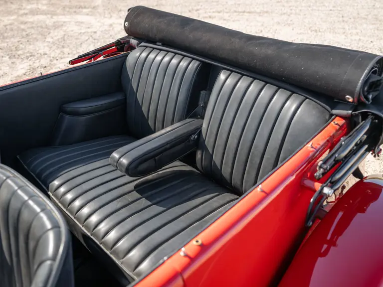 Z11165 : 1934, M45 Tourer T8, moteur 2915, jantes noires à rayons, pneus Dunlop Silent Tread, phares Lucas P100 Flamethrower, feu de route central, courroies de capot Amal, crics Blackhawk, 2 avertisseurs sonores, instrumentation Smith, volant Ashby, tableau de bord ronce, Noire, filet rouge, cuir Red Antique, capote noire.