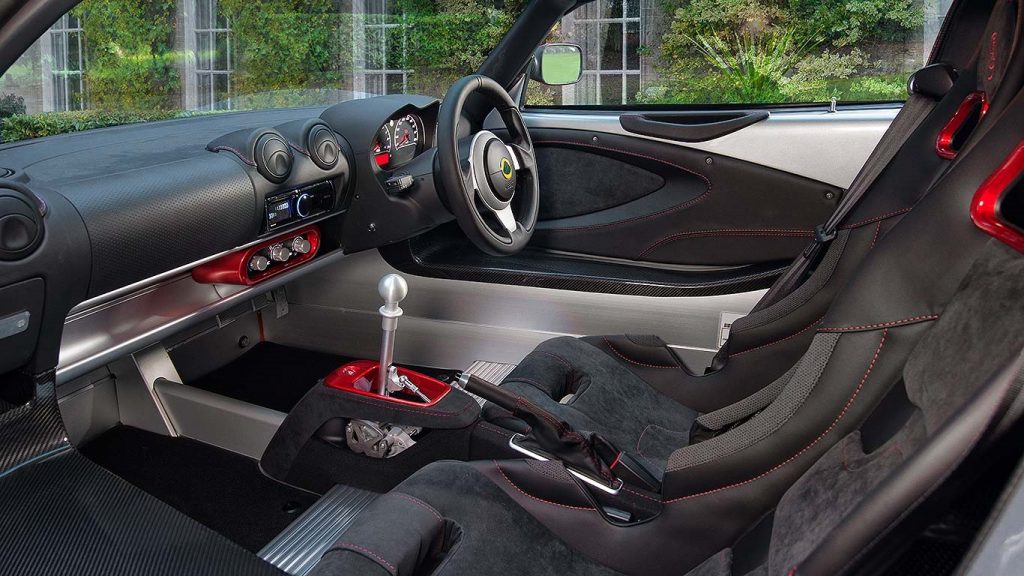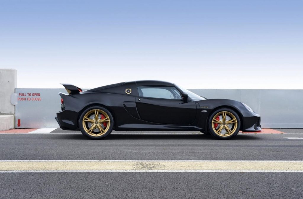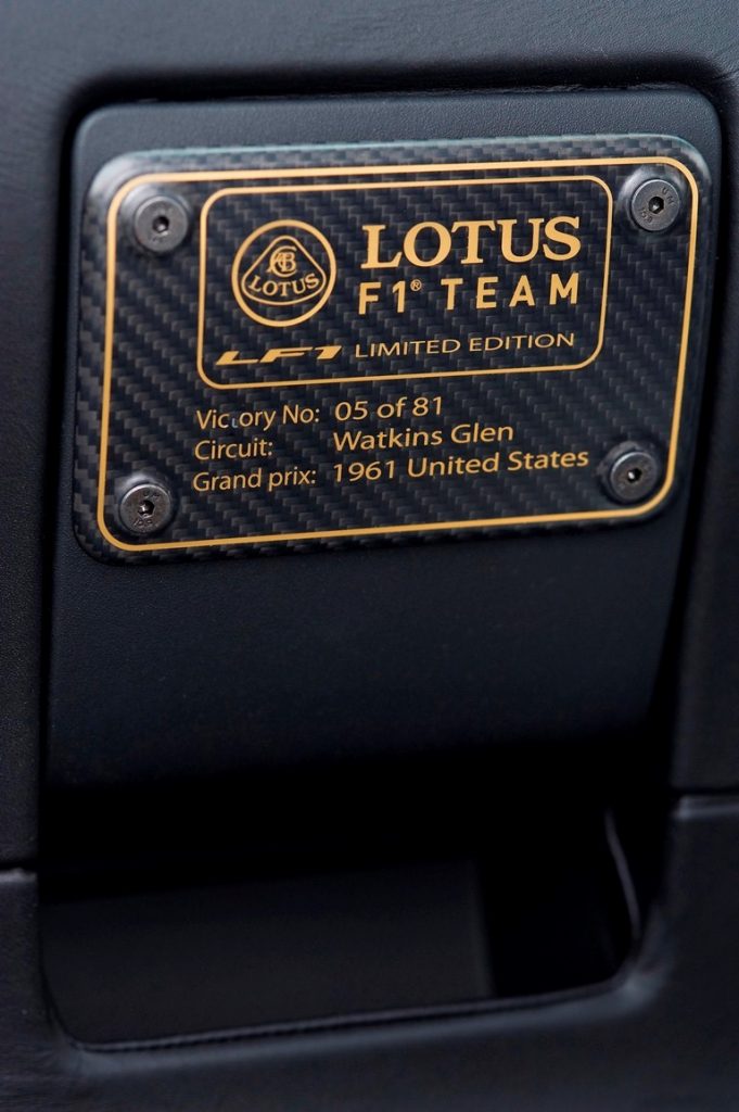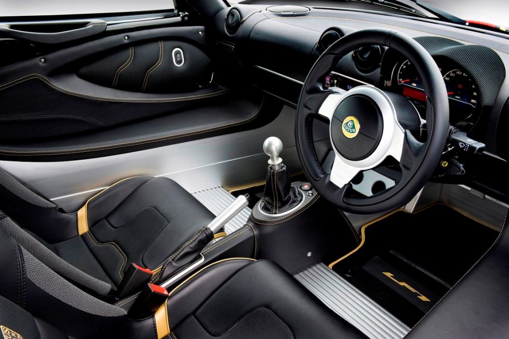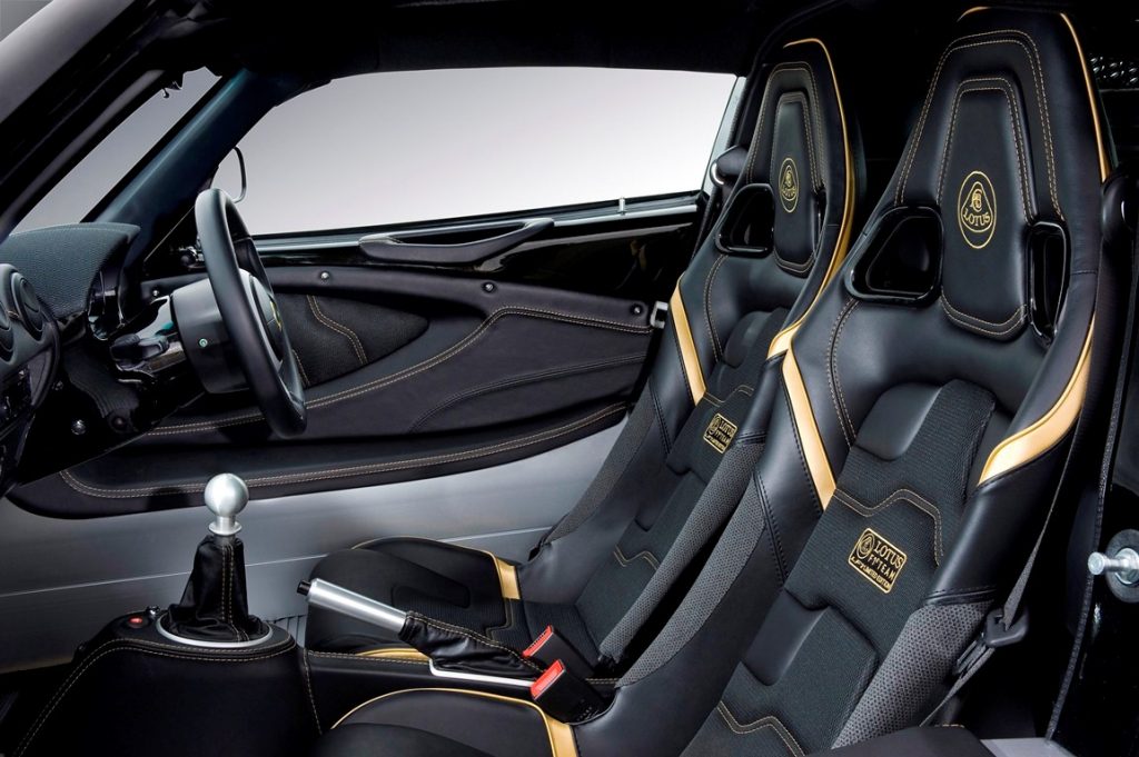 Freins à disques ventilés et rainurés AP Racing avec étriers 4 pistons, pneus Pirelli PZero Corsa, 1110 kg. L’Exige Cup est épaulée par une version compétition R non homologuée sur route. 2012 : Arrêt de la version Elise atmosphérique, la SC est rebaptisée S. 2014 : Lotus présente l’Exige S LF1 Limited Edition : Référence au passé de la firme en F1 Motorsport Black à filets rouge et or. Sièges baquet en cuir noir avec inserts en tissu noir et passepoils or, logo Lotus or brodé dans les appuie-tête et logo Lotis F1 Team au dos du siège, plaque moteur en carbone Lotus Performance, badges avant et cabochons de roues noir et or. Plaque commémorative indiquant la victoire correspondant à la voiture produite : # 1 : Monaco 1960 (1ère victoire Lotus en F1) à # 81 (GP Australie 2013). Race Pack de série avec Dynamic Launch Control à 4 lois (contrôle de la stabilité), suspensions optimisées, soupape de décharge à l’échappement. Premium Pack : climatisation.