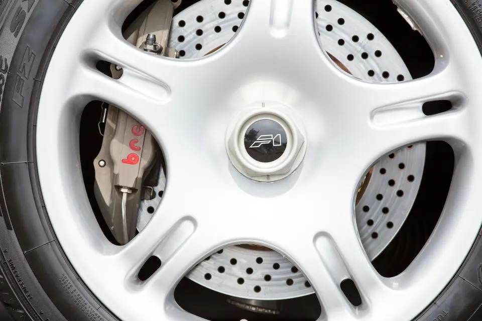 Disques en acier ventilés et rainurés à l’avant et à l’arrière fournis par Brembo, inspirés du système utilisé sur la Porsche 928, diamètre 13,07 inches à l’avant et 12,01 à l’arrière. Etriers à 4 pistons monoblocs en alliage léger.