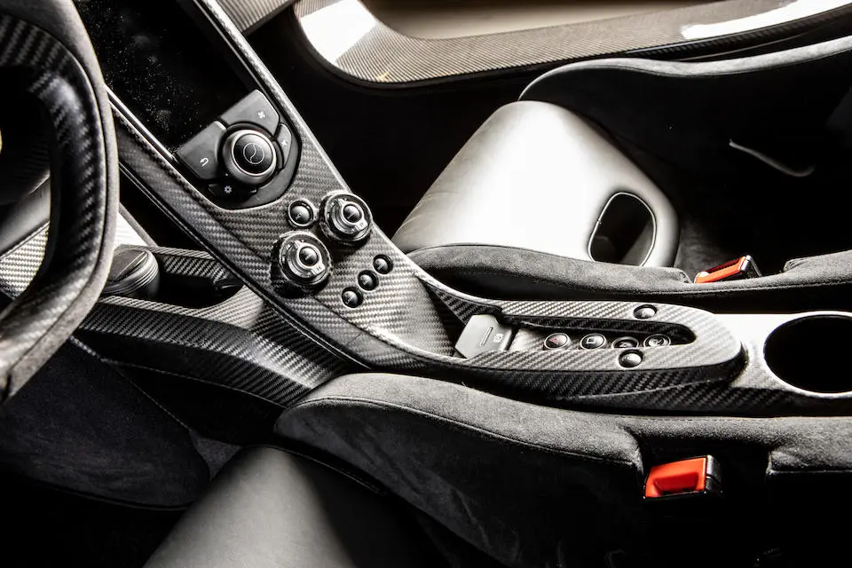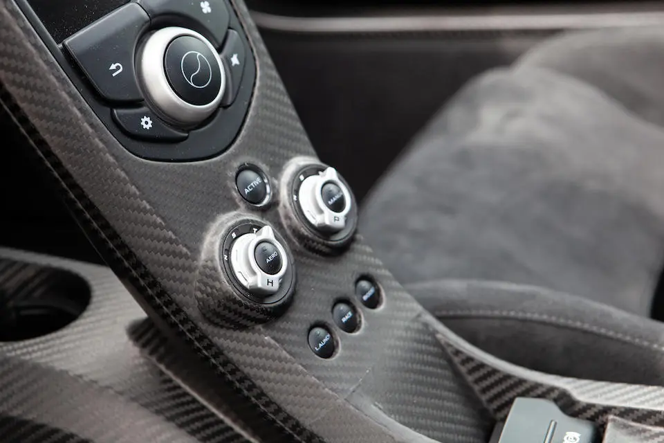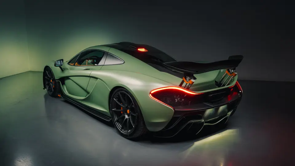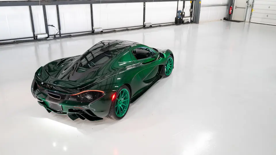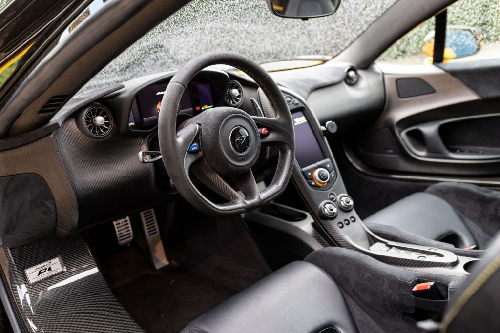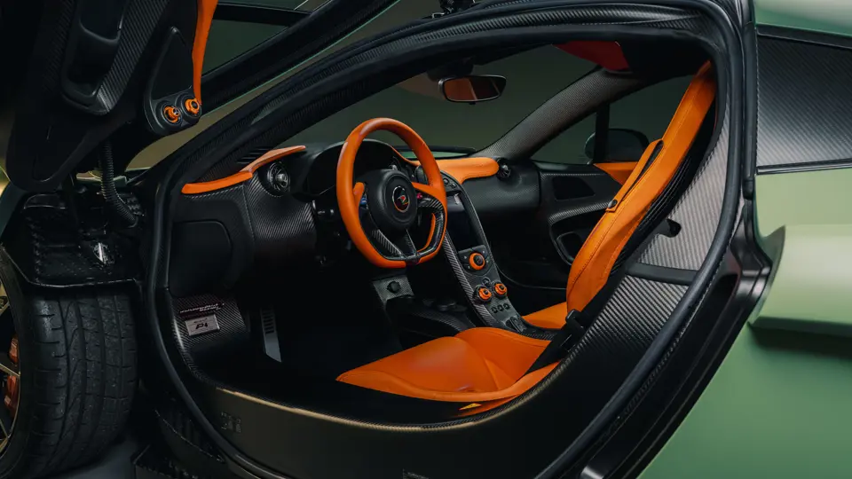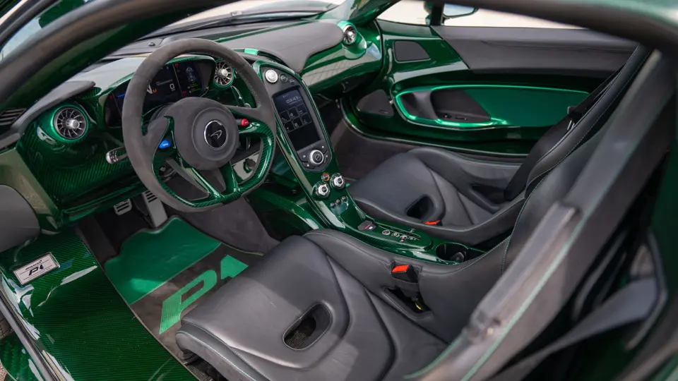 SBM12ABA5EW000002 : 2014, 1ère P1 vendue au public, carrosserie carbone, inserts carbone vert foncé au tableau de bord, console, panneaux de portes, Verte, intérieur vert à passepoils verts.