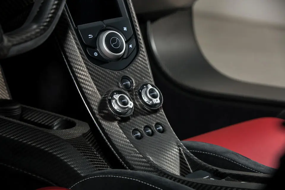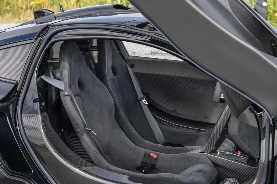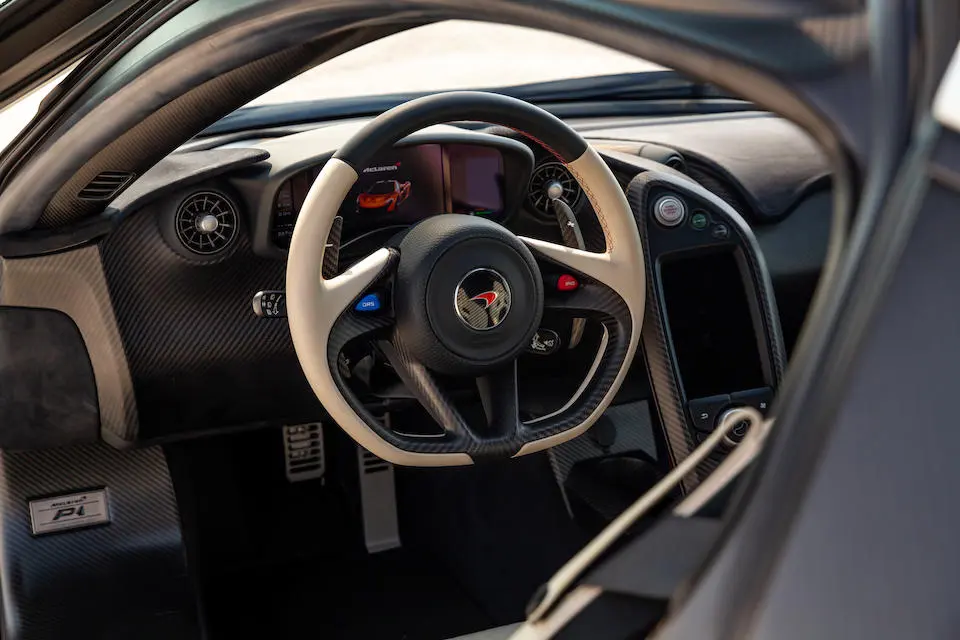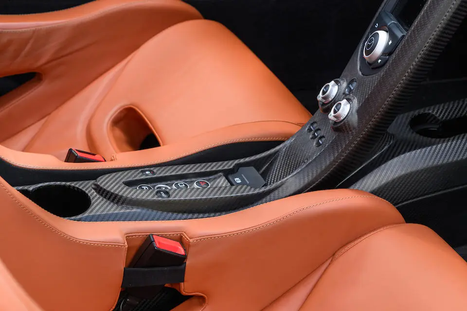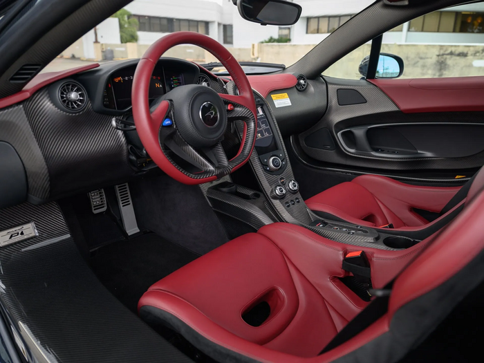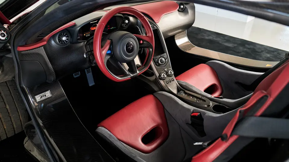 SBM12ABA7FW000343 : 10/2014, P1, siège conducteur agrandi, Supernova Silver, logos P1 brodés dans les sièges, harnais 6 points, Supernova Silver, sièges cuir Harissa Red, panneaux alcantara Carbon Black.