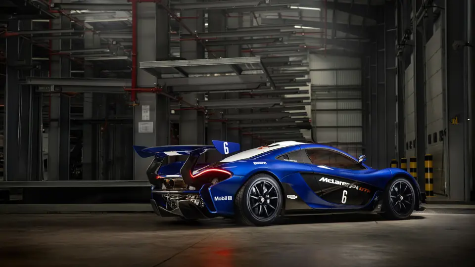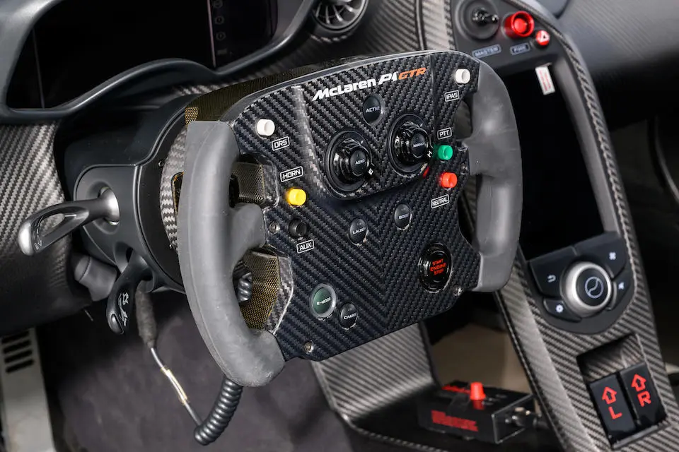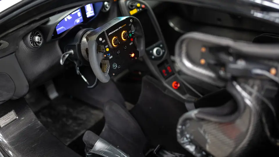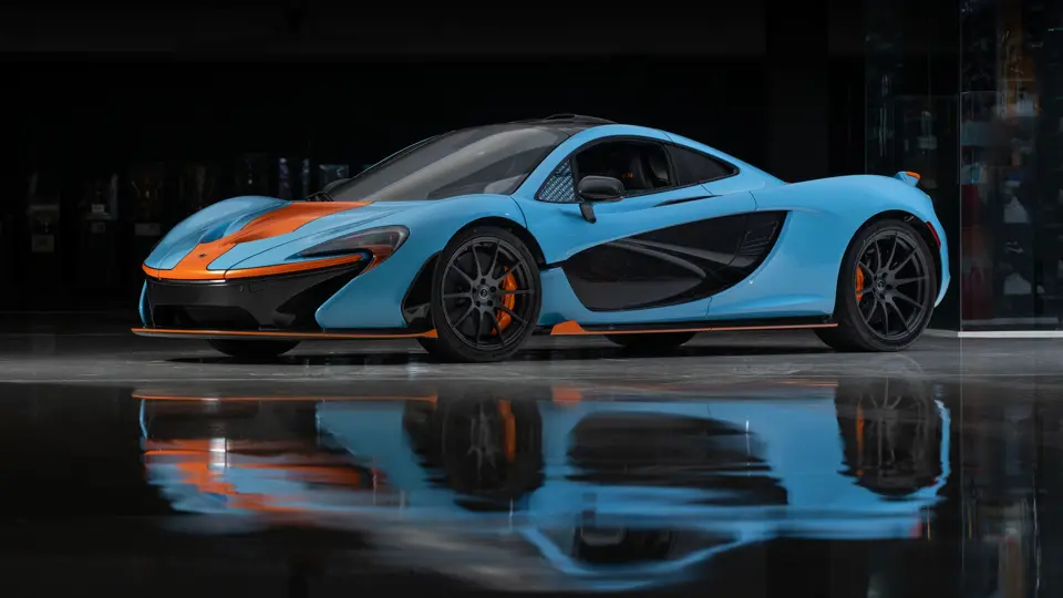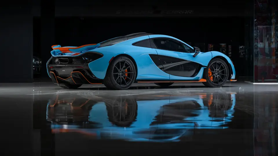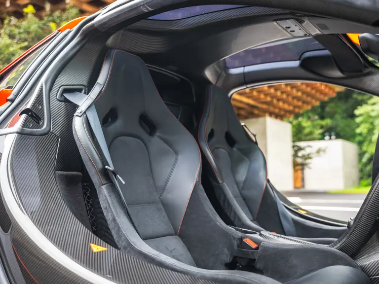 SBM12ABA8FW000108 : 2015, script P1 brodé dans les appuie-têtes, volant alcantara noir et orange, couleurs Gulf Oil, bleu clair, inserts et bande orange, cuir et alcantara Carbon Black à passepoils orange.