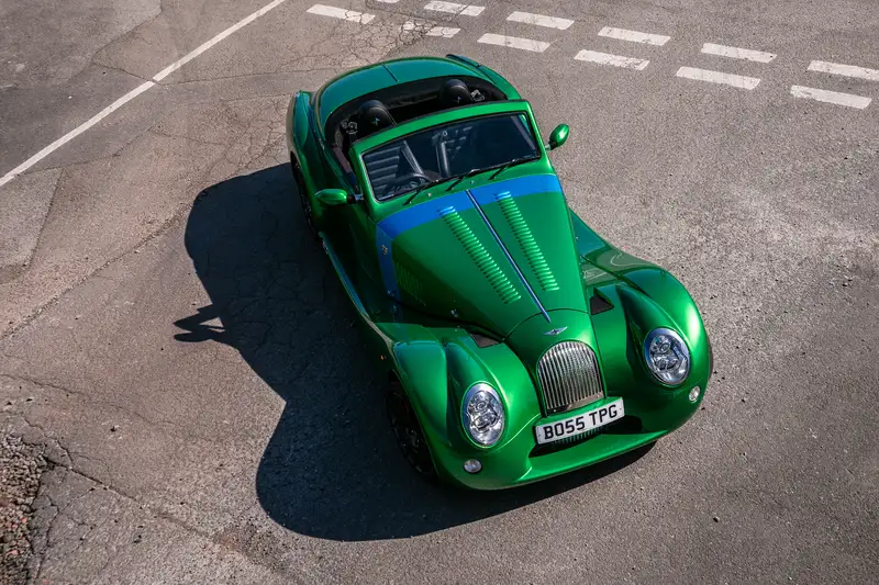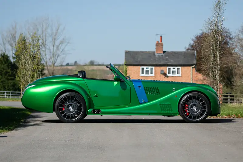 SA9EAABMTHE004124 : 2018, Aero 8 Série V, dernière de la série (caisse M149), moteur 10041818, Aero Racing Performance Pack, concole centrale et haut de contreportes ronce, sièges et garnitures de portes cuir façon sellier, sièges chauffants, climatisation, kit lumière d’ambiance, système de navigation avec 4 haut-parleurs, Premiere Metallic Blue/Green, ailes et ouïes latérales noires,