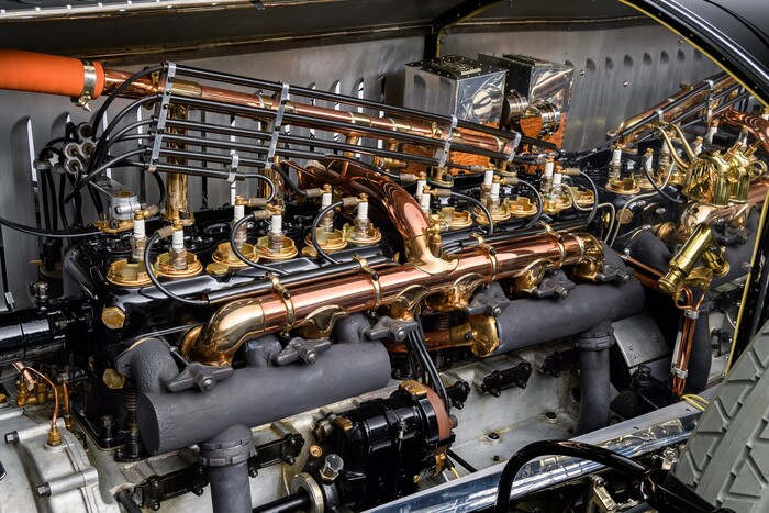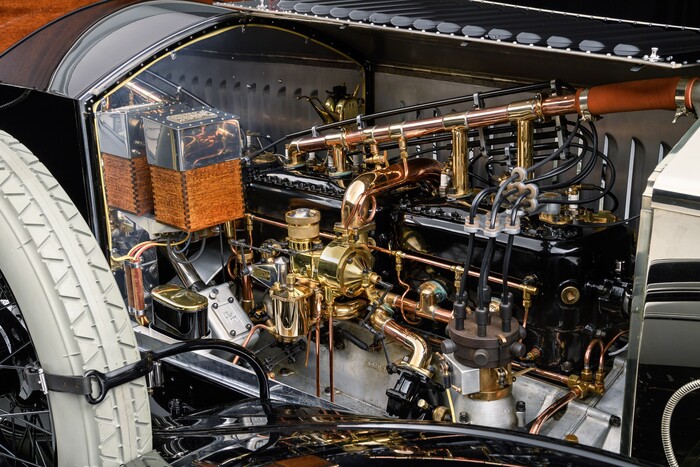 Refroidissement par radiateur en nid d’abeilles formé de 6000 tubes extrudés. L’eau circule à travers les espaces aménagés entre les tubes et non à l’intérieur. Boîte à eau et bords de radiateur accolés avec précision et brasés à l’argent, angles vifs et plaques au nickel-argent adoucis à la lime. Grille de radiateur en forme de temple grec avec lignes de fuite bombées pour que le regard ne perçoive que des angles parfaits.