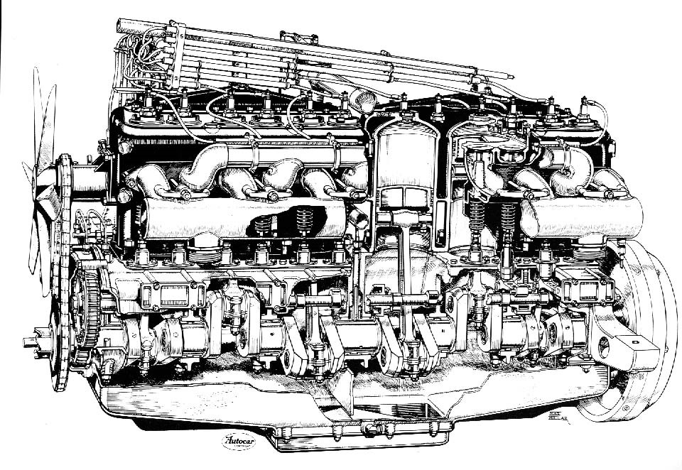 Vilebrequin tourillonnant sur 7 paliers, tolérance 0,00025 avec polissage final manuel., repris des dernières 30 HP avec supports de paliers usinés dans la partie supérieure du carter de manière à mieux répartir les contraintes. Lubrification sous pression.