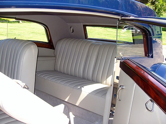 3 CM 85 : 1937, Limousine par Hooper (dessin 6443), moteur Y48E, ouïes de capot inclinées de 11°, enjoliveurs de roues Ace,roue de secours carénée sur l’aile AVD, séparation vitrée avancée de 2 1/2″, chauffage Clayton à l’arrière, Bleue/Noir, cuir bleu/drap beige.
