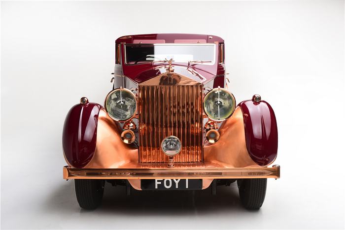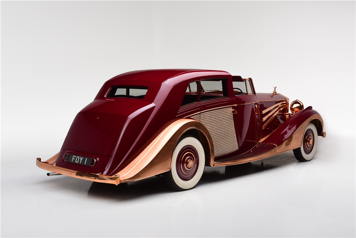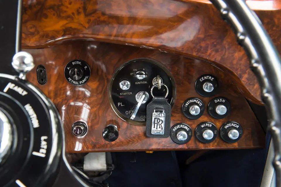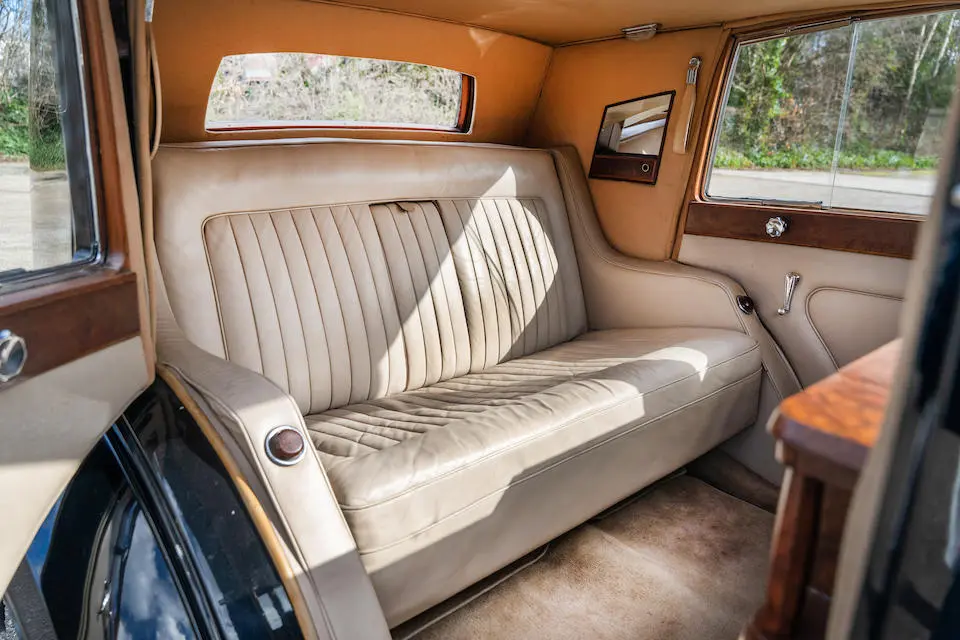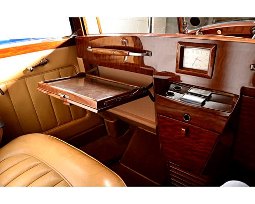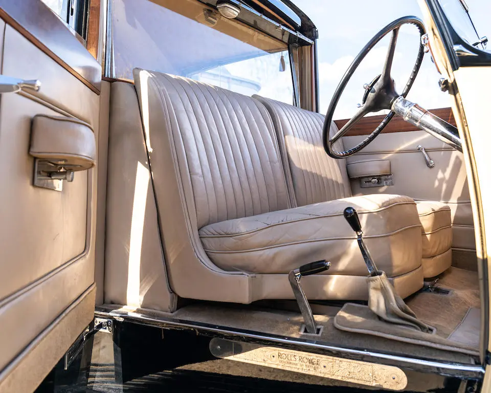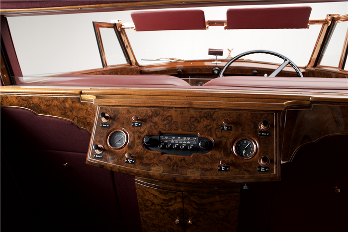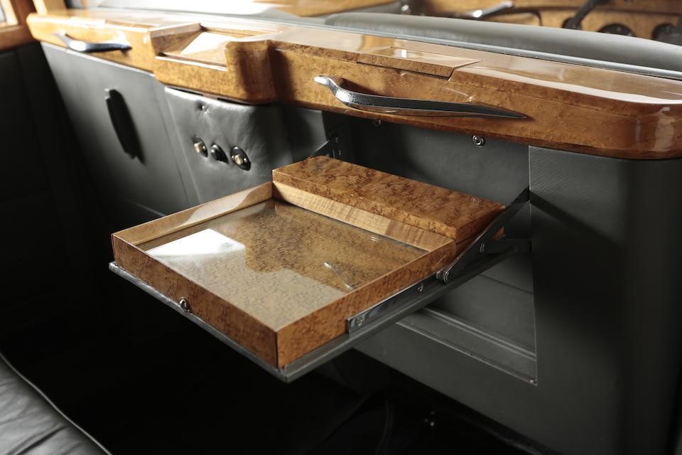 Recarrossée en Sedanca De Ville par Freestone & Webb, carrosserie en cuivre et acier, ailes avant et marchepieds en cuivre, baguettes latérales en cuivre poli, tous éléments chromés et volets thermostatiques de calandre en cuivre poli, , intérieur avec boiseries incrustées d’ivoire, Bordeaux avec cannage doré sur les potes arrières, cuir marron à l’avant, tissu West of England marron à passepoils ivoire à l’arrière.
