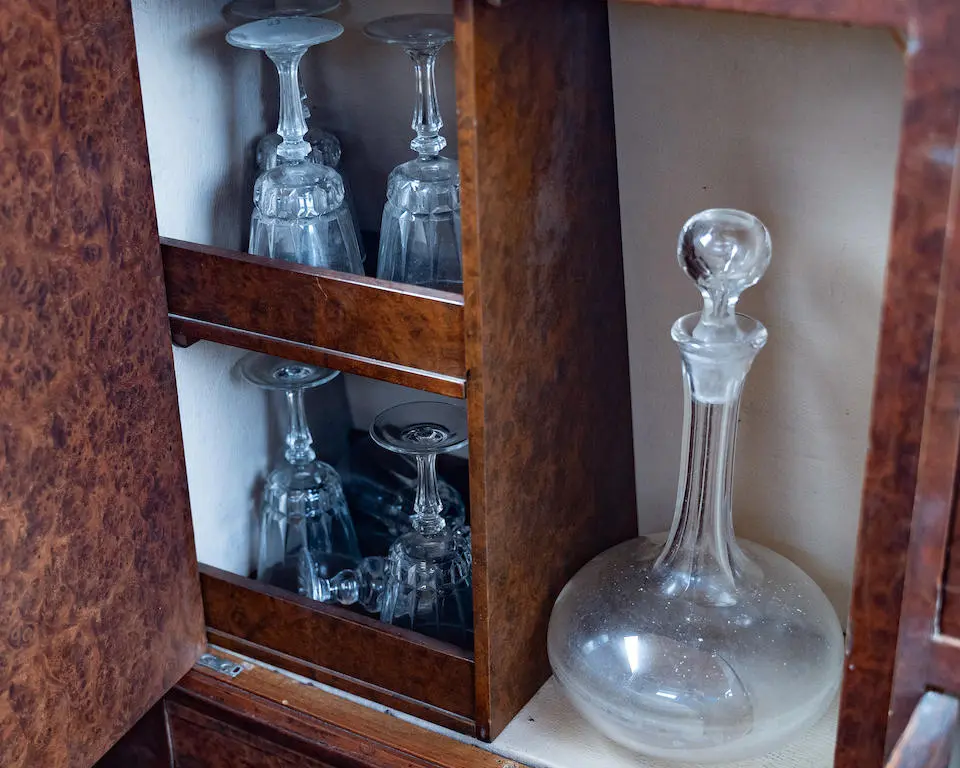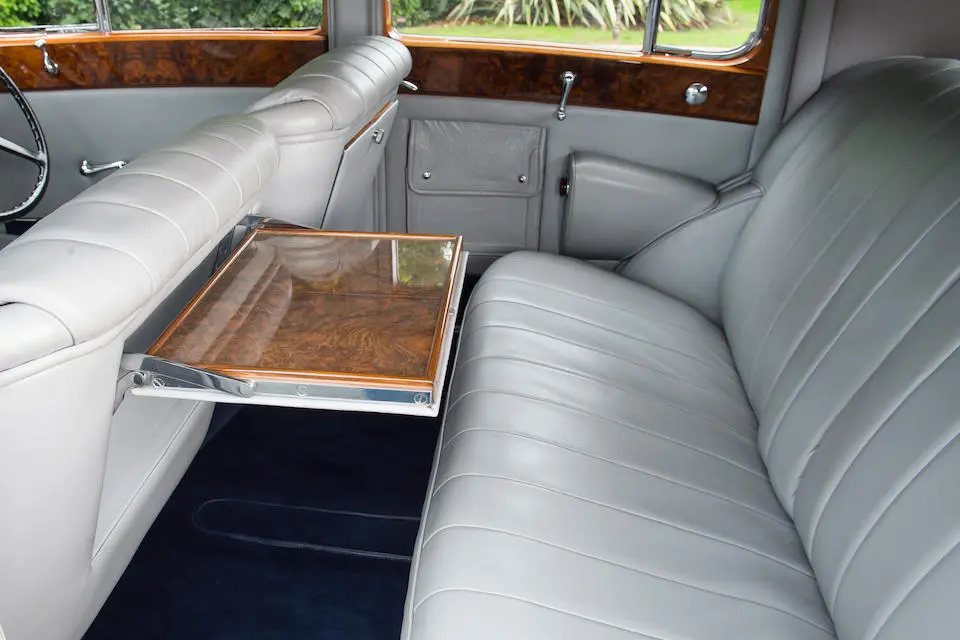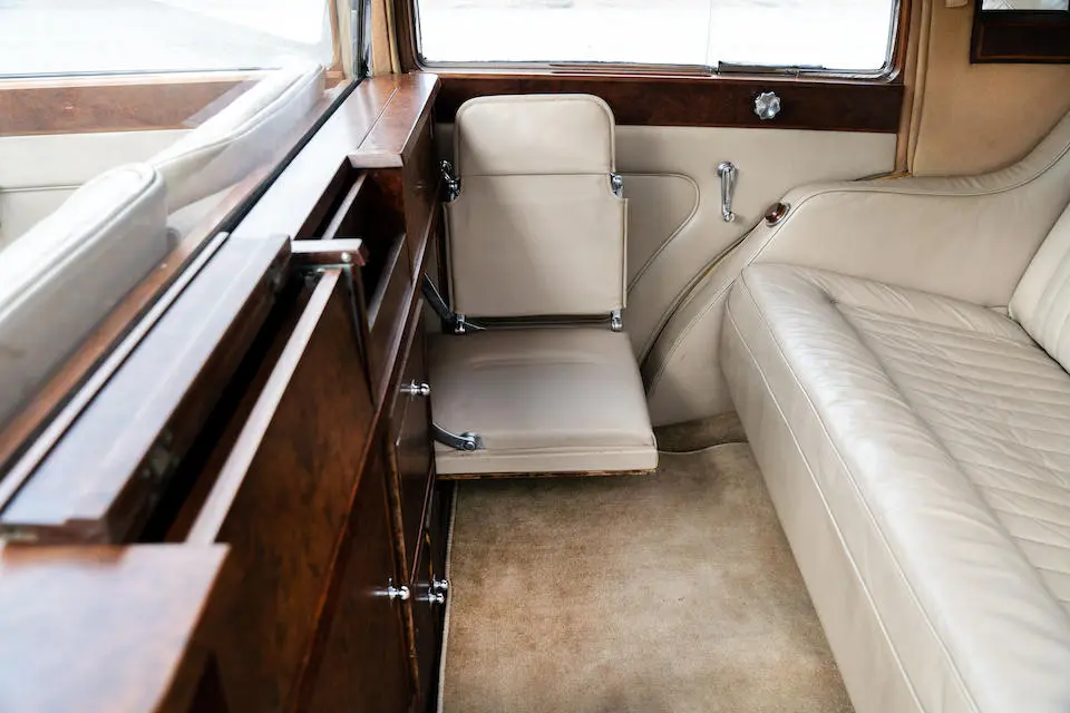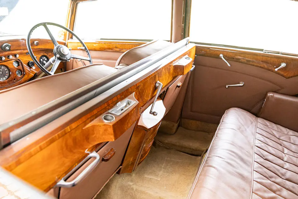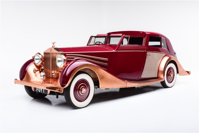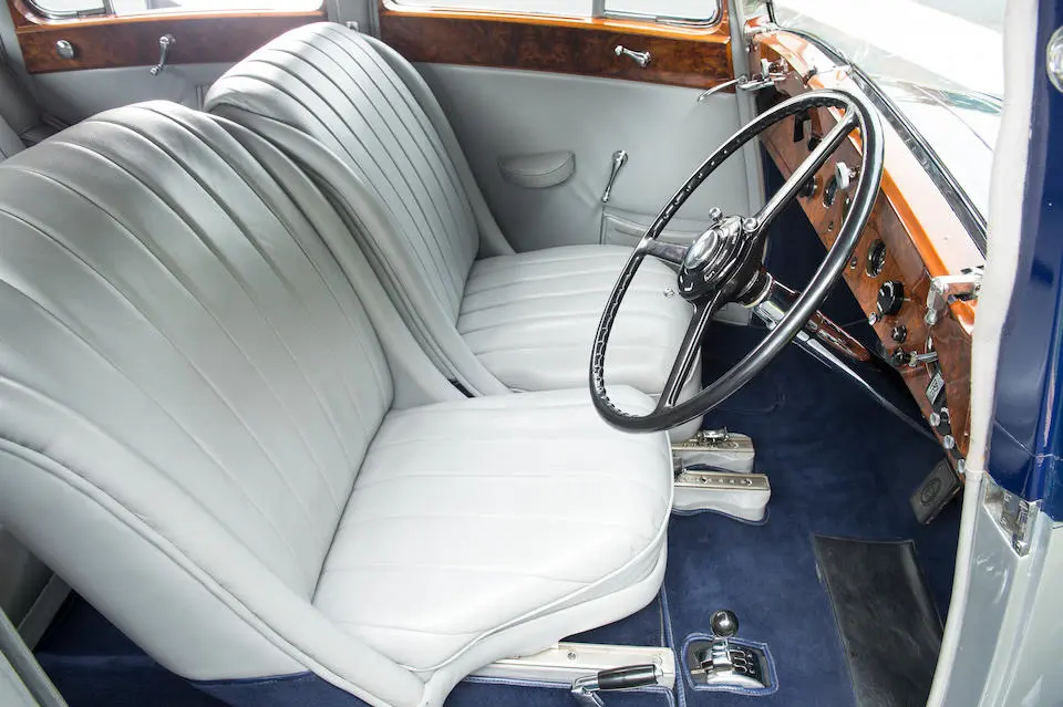 Recarrossée en Sedanca De Ville par Freestone & Webb, carrosserie en cuivre et acier, ailes avant et marchepieds en cuivre, baguettes latérales en cuivre poli, tous éléments chromés et volets thermostatiques de calandre en cuivre poli, , intérieur avec boiseries incrustées d’ivoire, Bordeaux avec cannage doré sur les potes arrières, cuir marron à l’avant, tissu West of England marron à passepoils ivoire à l’arrière.