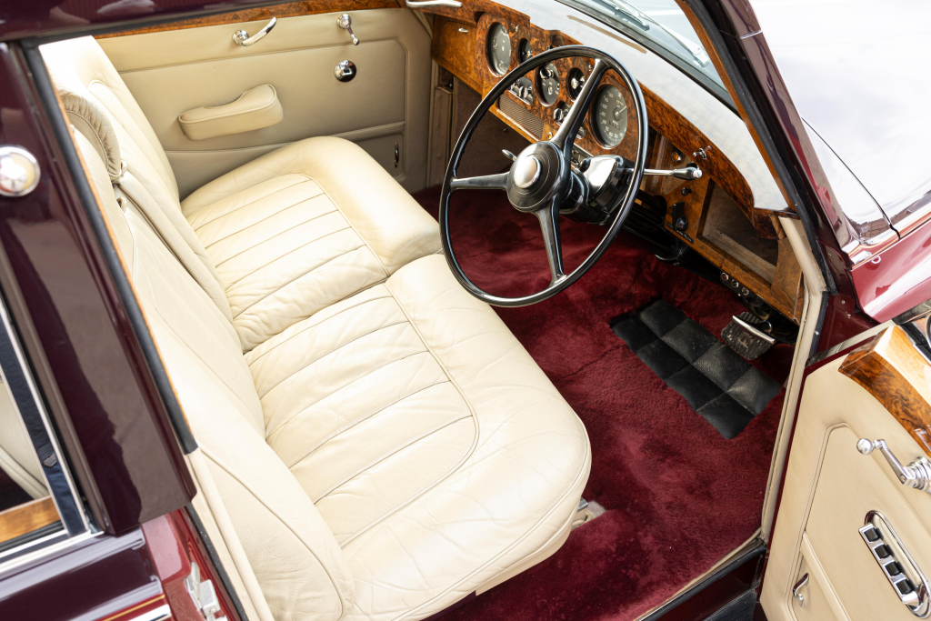 L CEL 53 : 1965, Silver Cloud III LWB, CAG, moteur CL26E, pneus flancs blancs Dunlop, séparation, vitres teintées à commande électrique, radio avec antenne électrique, Shell Grey, cuir Scarlet.