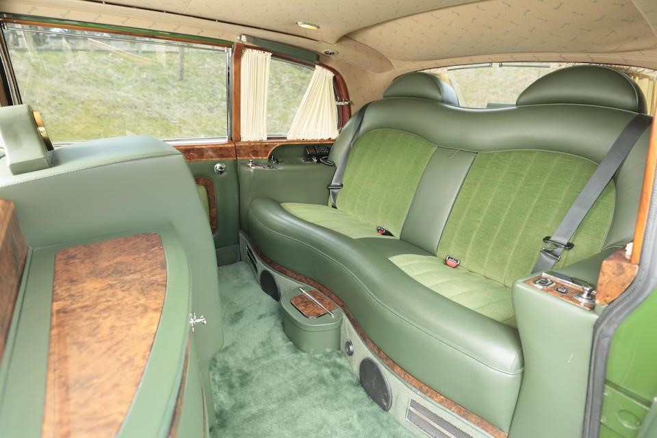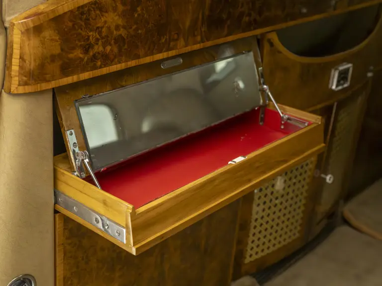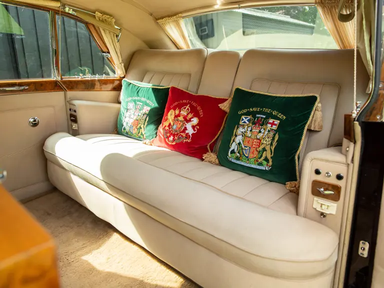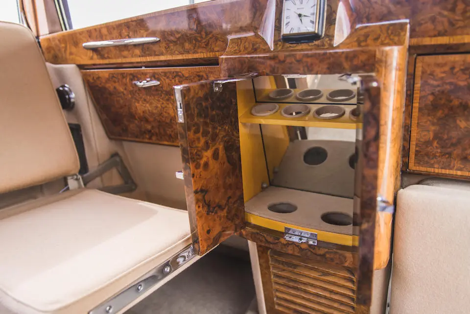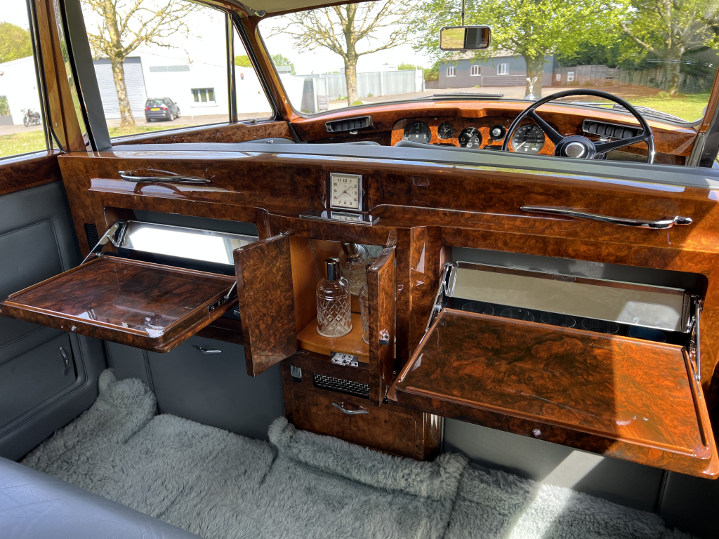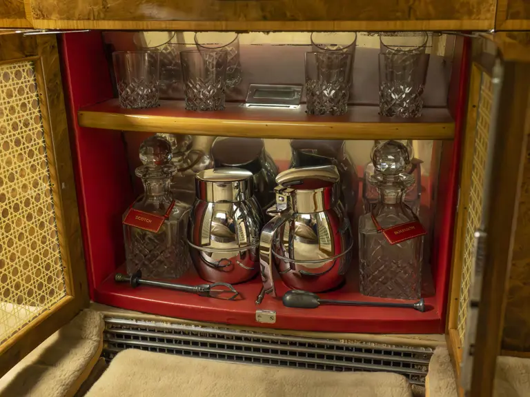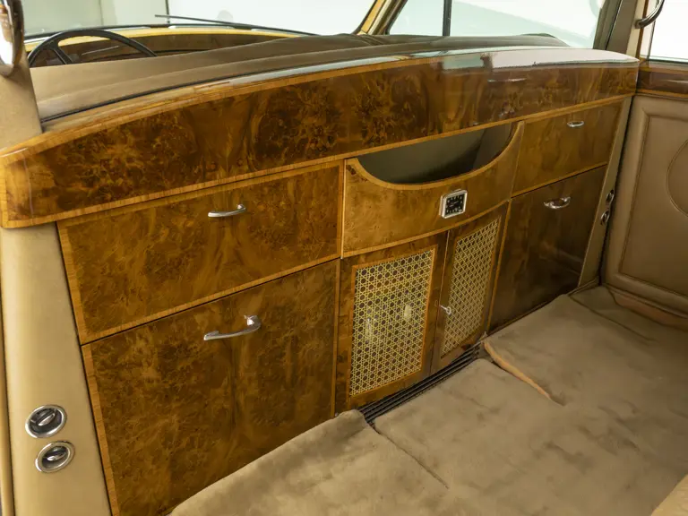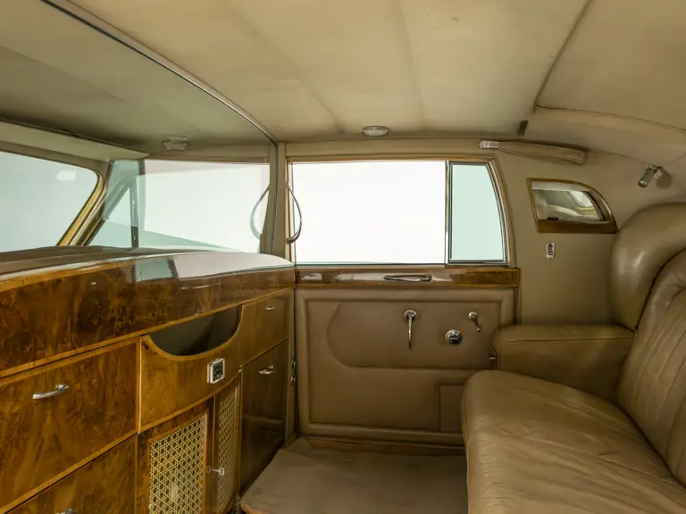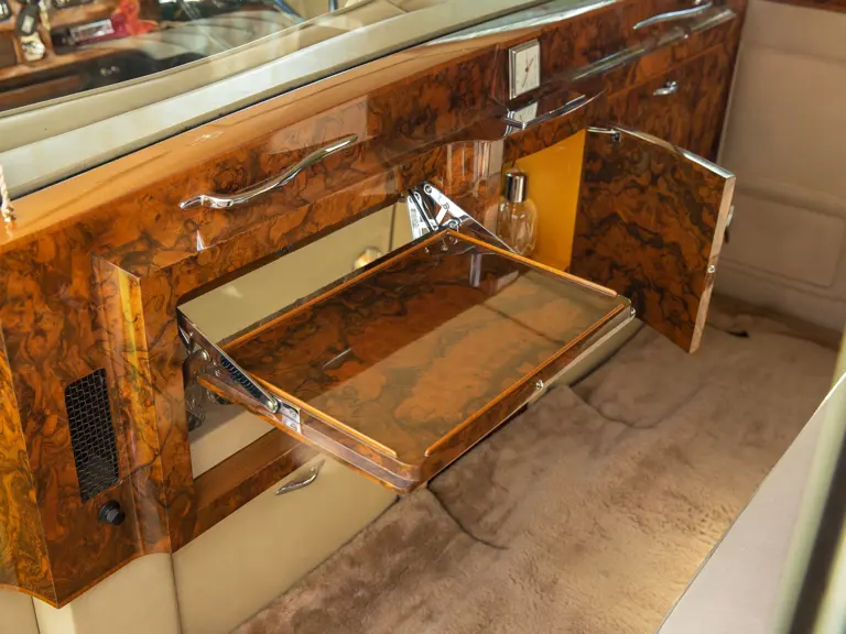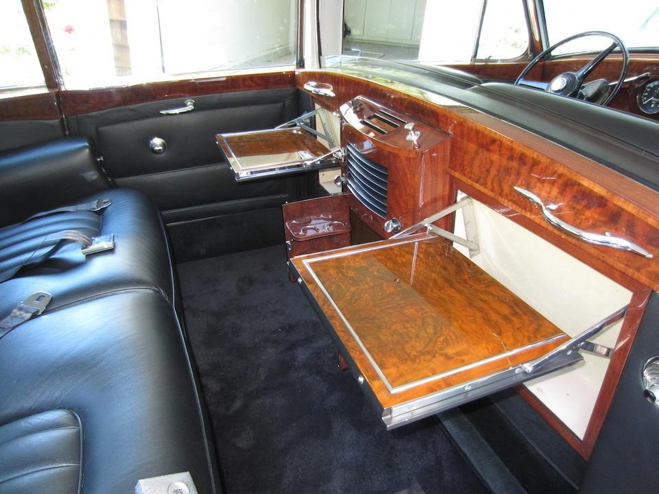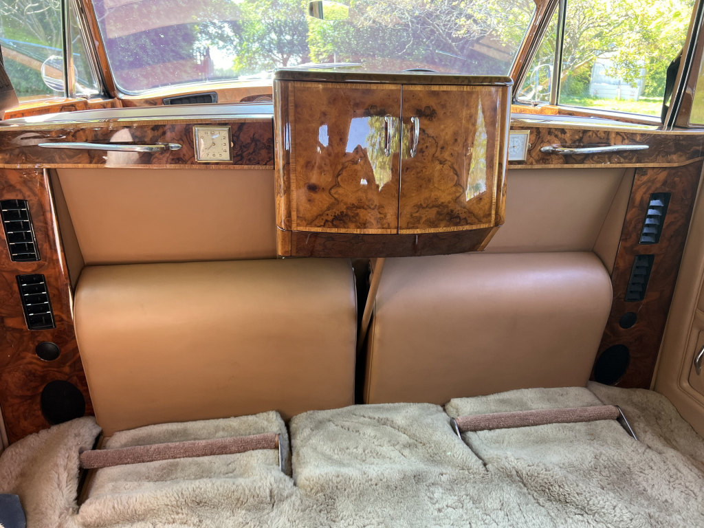 5 L VB 19 : 1964, Touring Limousine par James Young, radio AM/FM, altimètre sur la boîte à gant, climatisation séparée av./arr., séparation à commande électrique, repose-pieds arrières, sièges occasionnels repliables, vases sur les montants de custode arrière, liseuses, montre Smiths à l’arrière, picnic tables, cocktail cabinet avec verrerie et carafes en cristal.