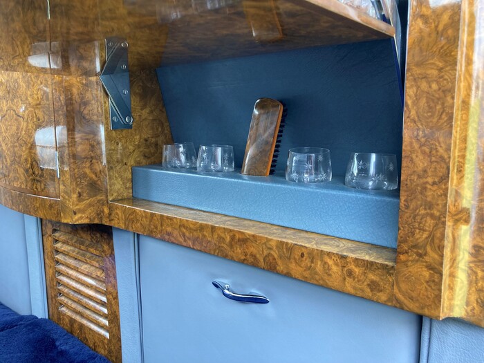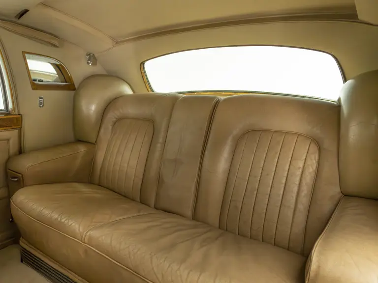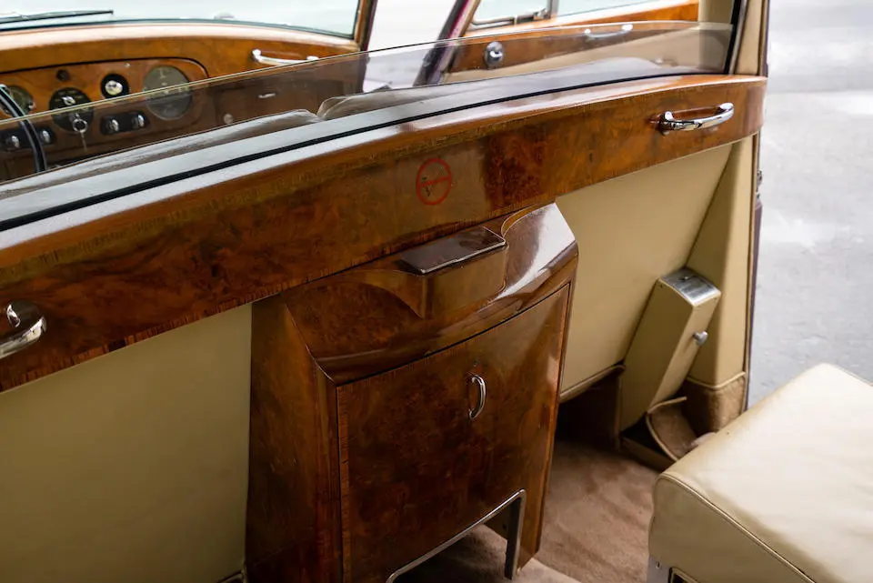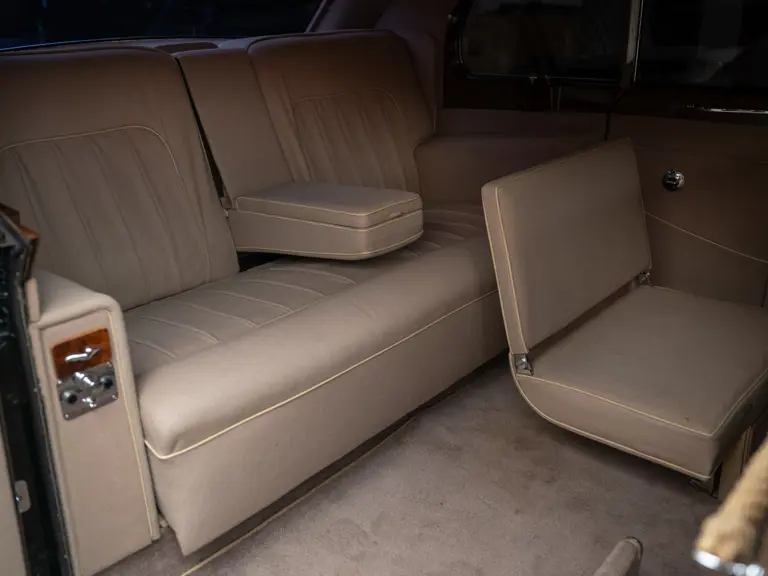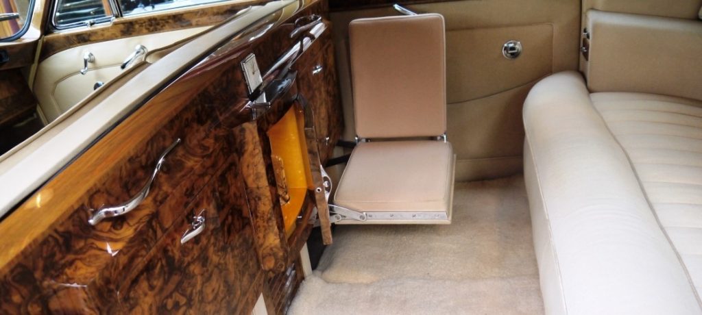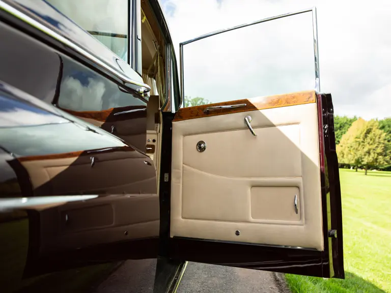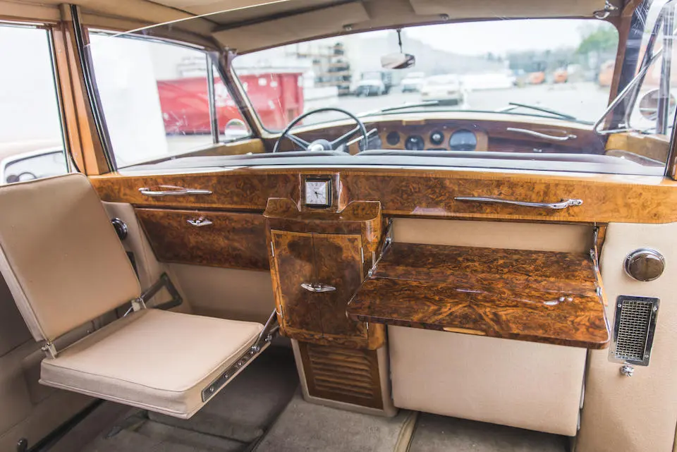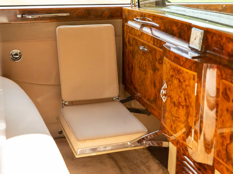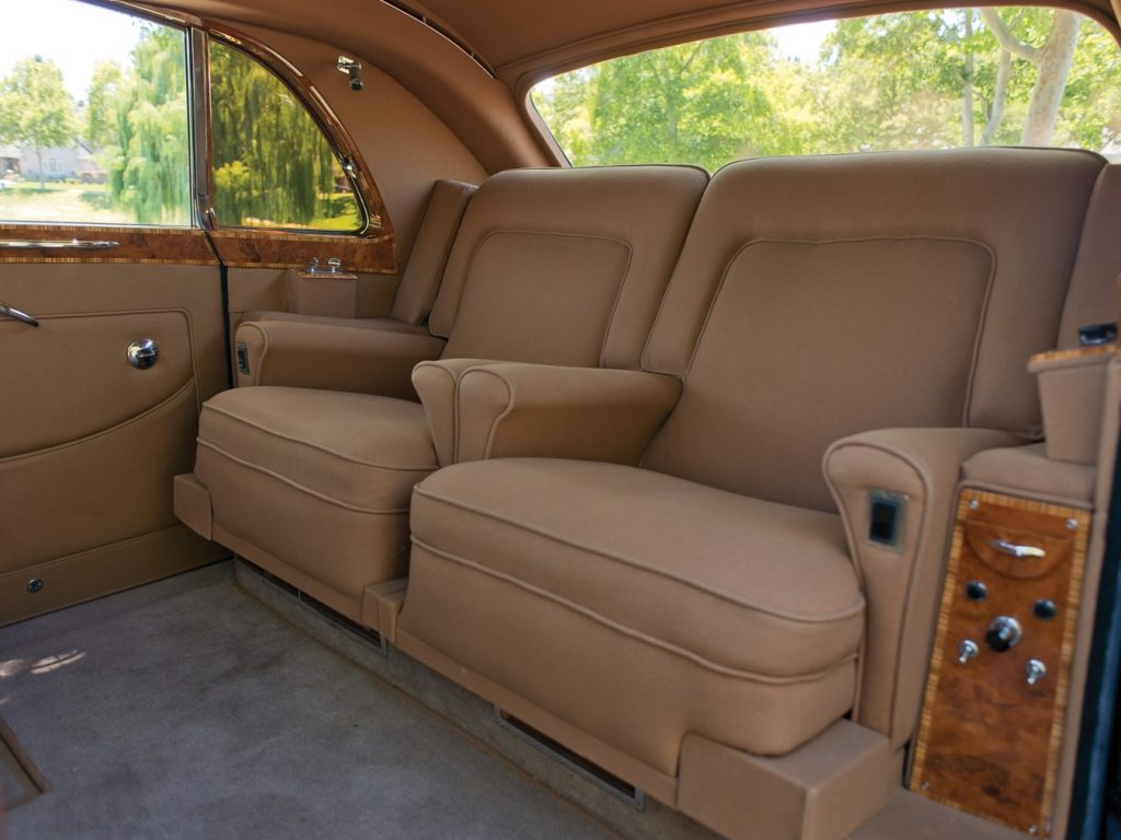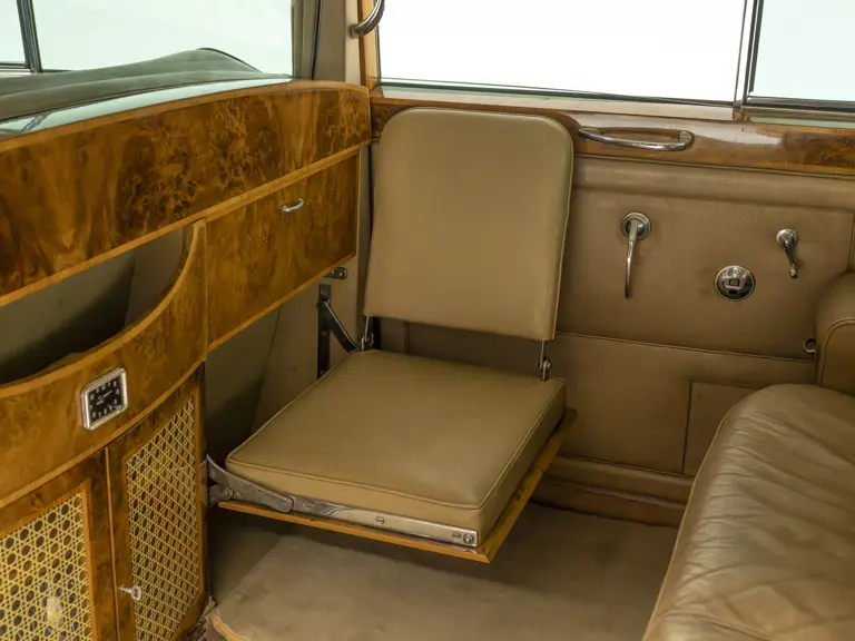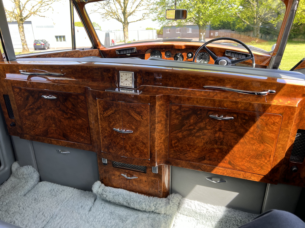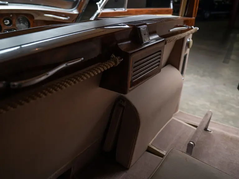 5 L VB 19 : 1964, Touring Limousine par James Young, radio AM/FM, altimètre sur la boîte à gant, climatisation séparée av./arr., séparation à commande électrique, repose-pieds arrières, sièges occasionnels repliables, vases sur les montants de custode arrière, liseuses, montre Smiths à l’arrière, picnic tables, cocktail cabinet avec verrerie et carafes en cristal.