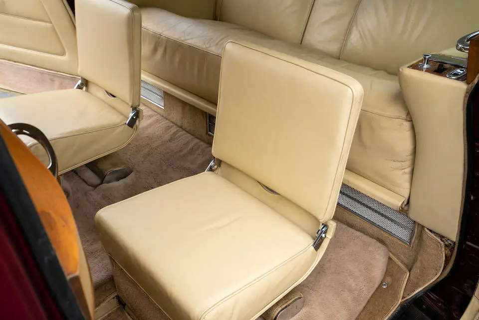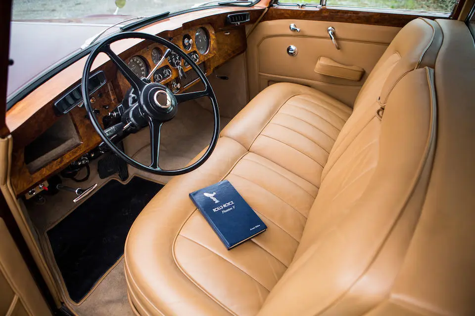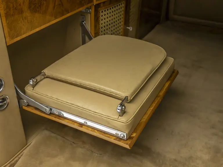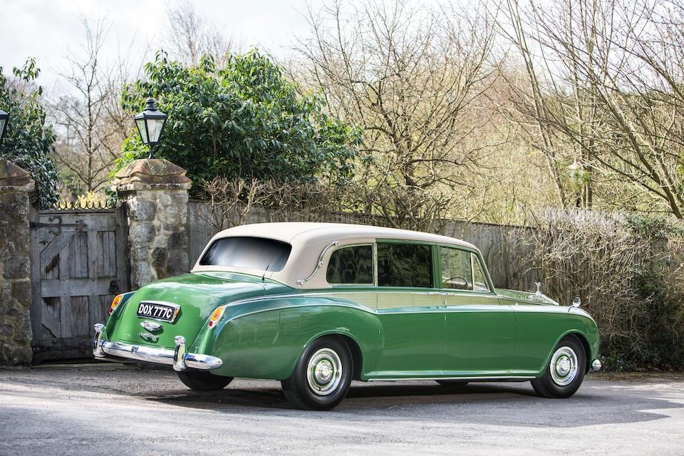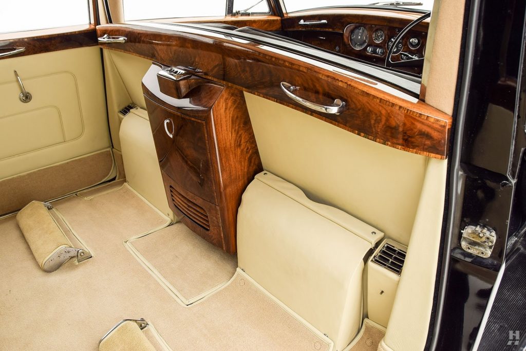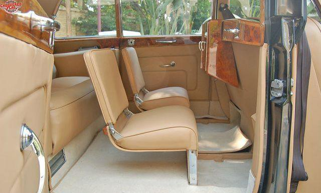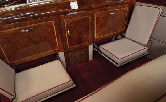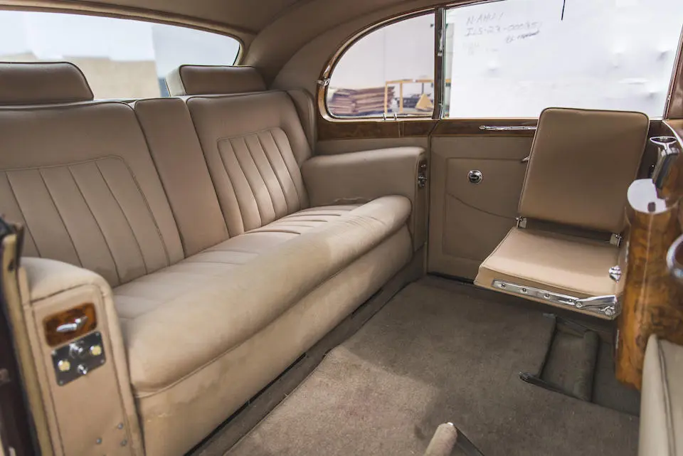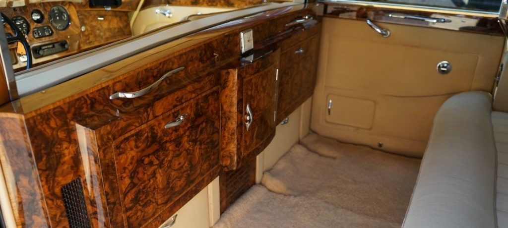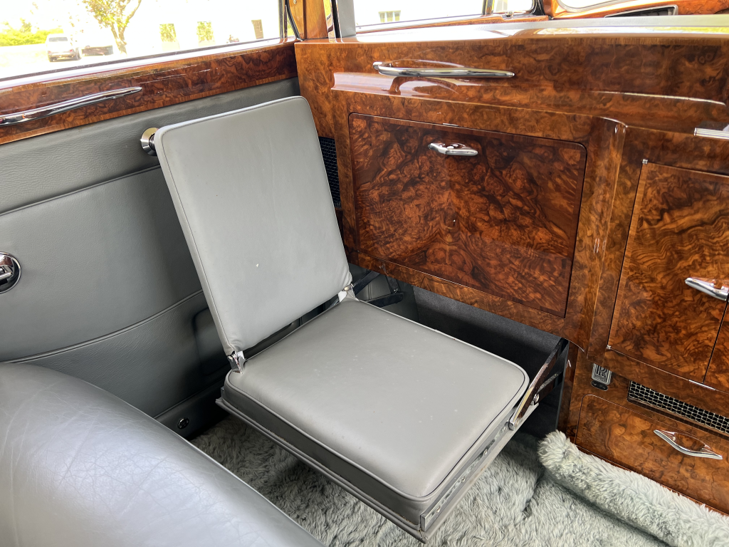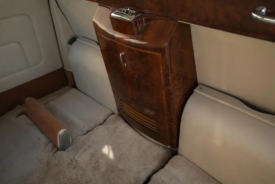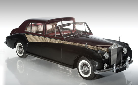 5 L VB 19 : 1964, Touring Limousine par James Young, radio AM/FM, altimètre sur la boîte à gant, climatisation séparée av./arr., séparation à commande électrique, repose-pieds arrières, sièges occasionnels repliables, vases sur les montants de custode arrière, liseuses, montre Smiths à l’arrière, picnic tables, cocktail cabinet avec verrerie et carafes en cristal.