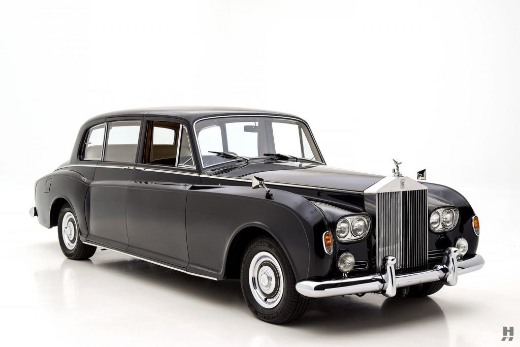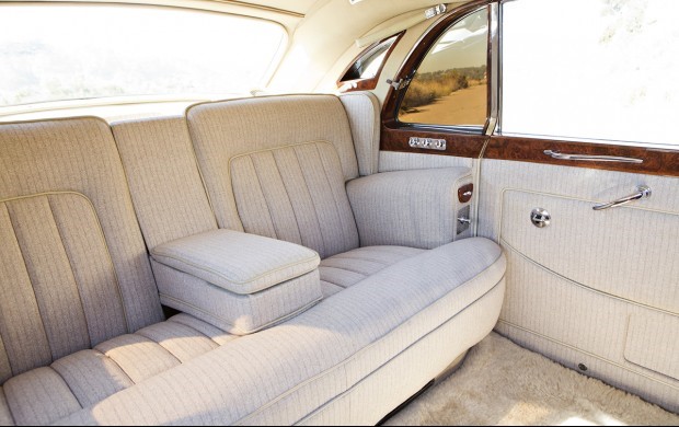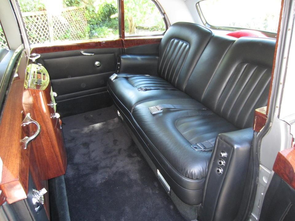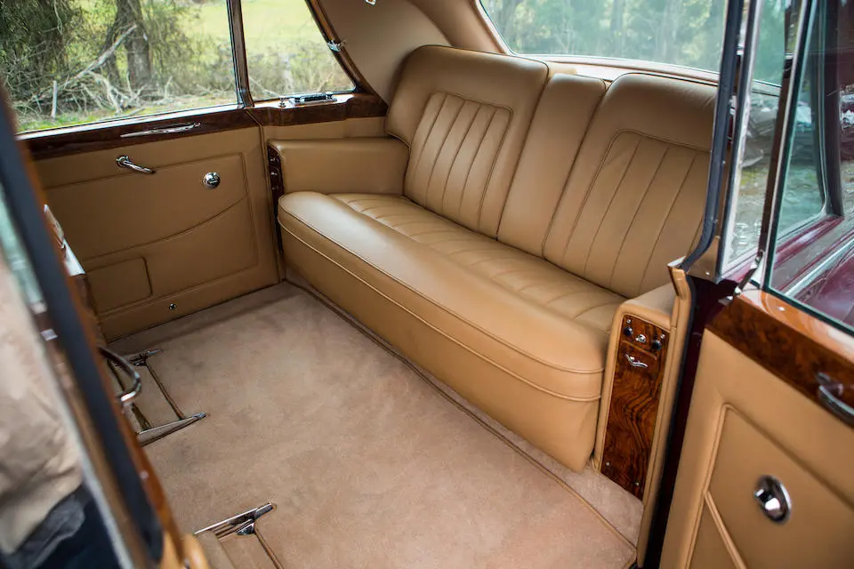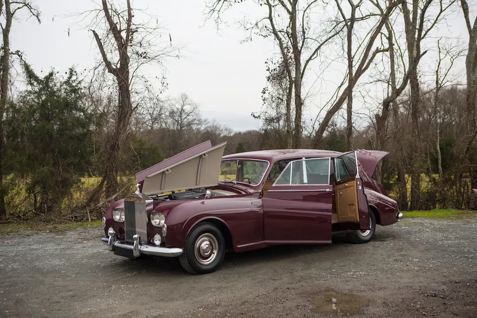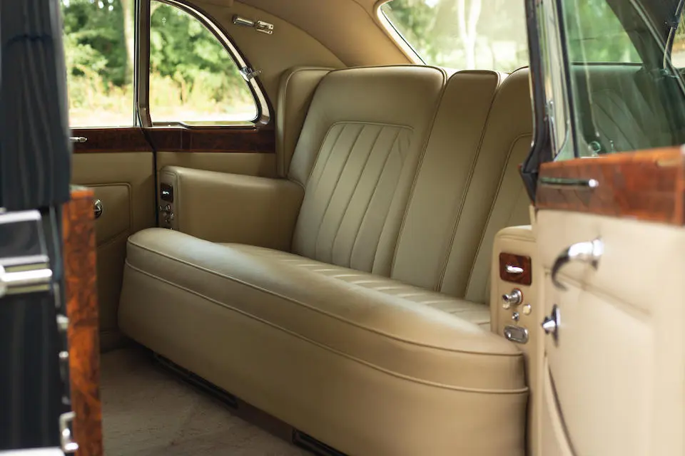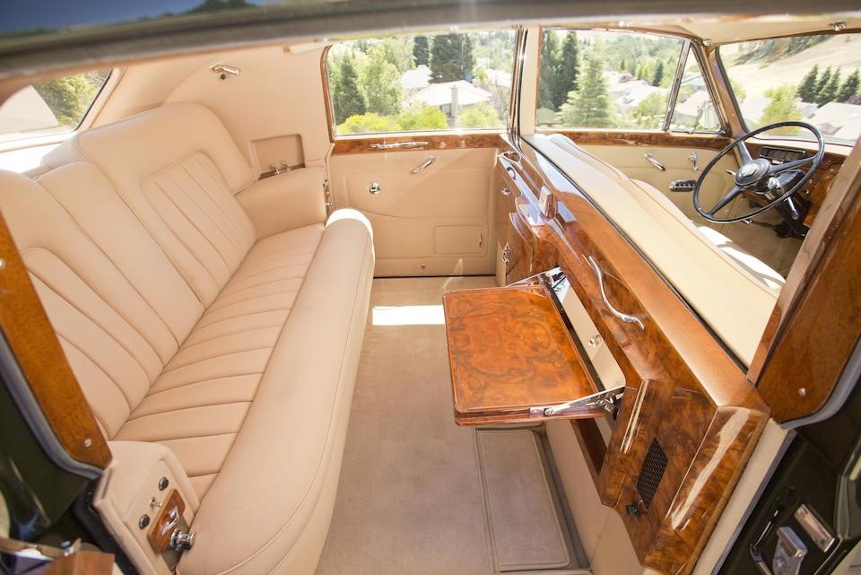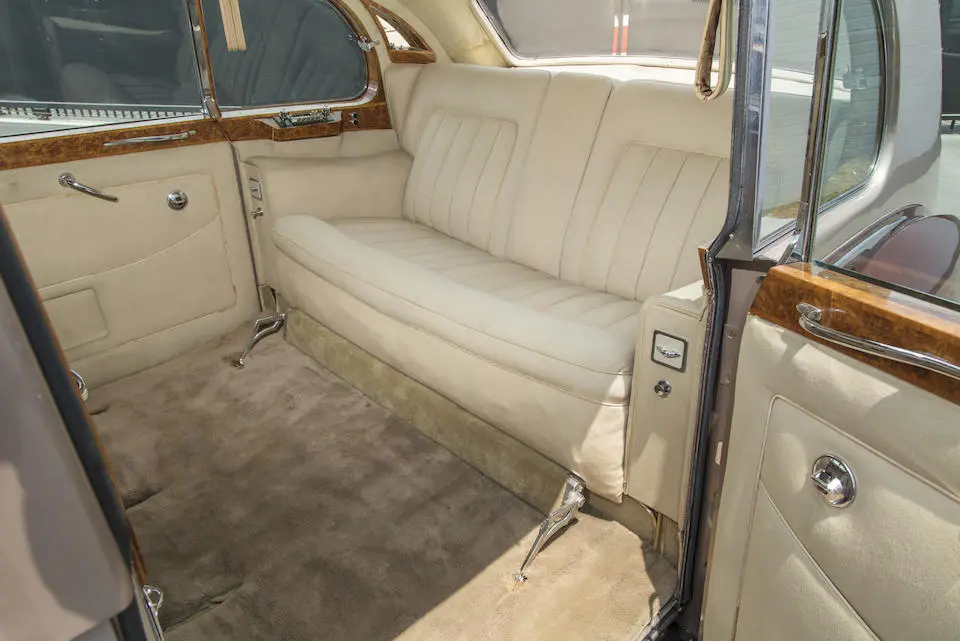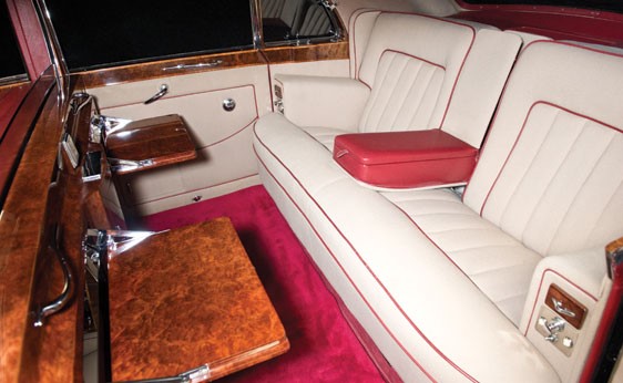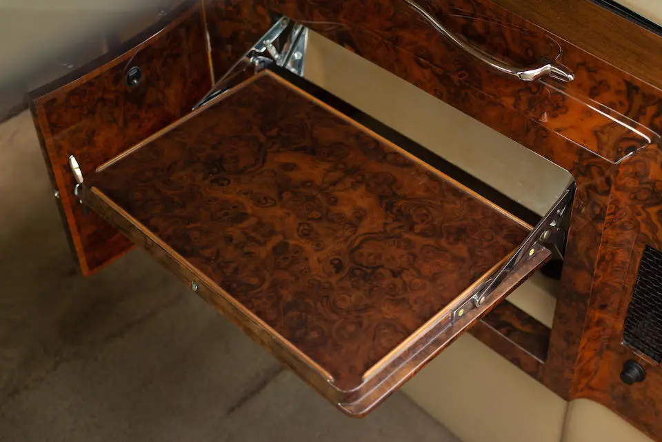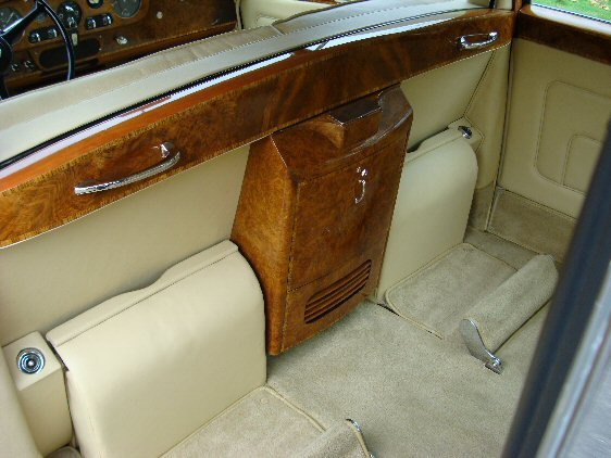 5 L VB 19 : 1964, Touring Limousine par James Young, radio AM/FM, altimètre sur la boîte à gant, climatisation séparée av./arr., séparation à commande électrique, repose-pieds arrières, sièges occasionnels repliables, vases sur les montants de custode arrière, liseuses, montre Smiths à l’arrière, picnic tables, cocktail cabinet avec verrerie et carafes en cristal.
