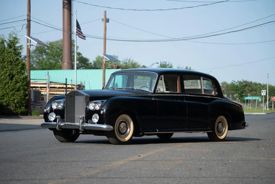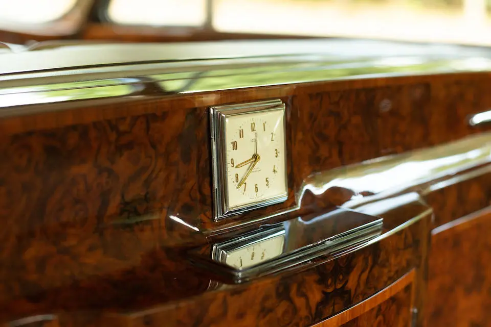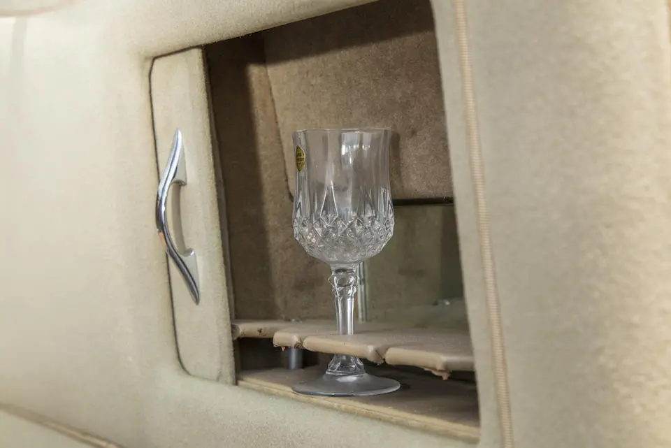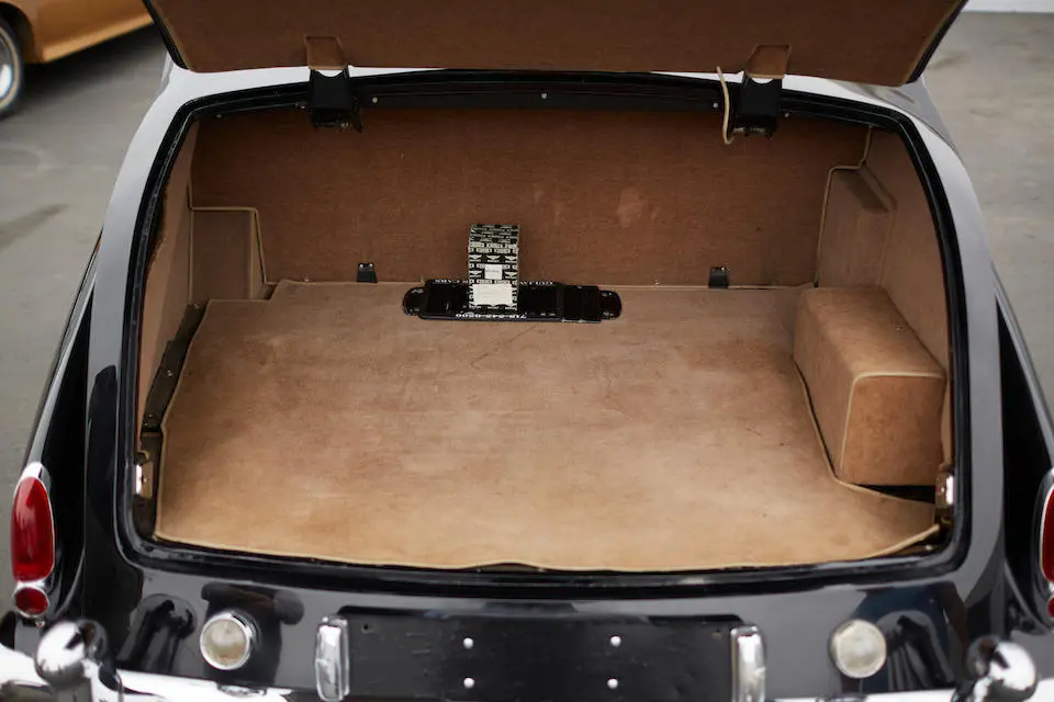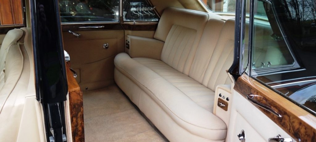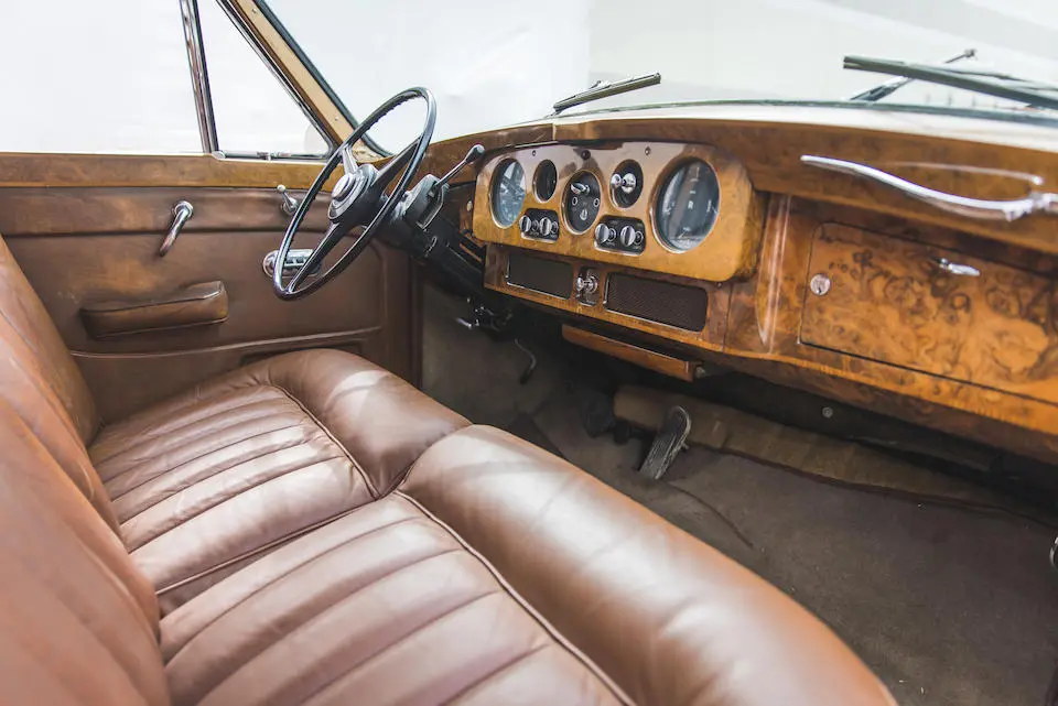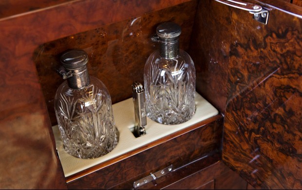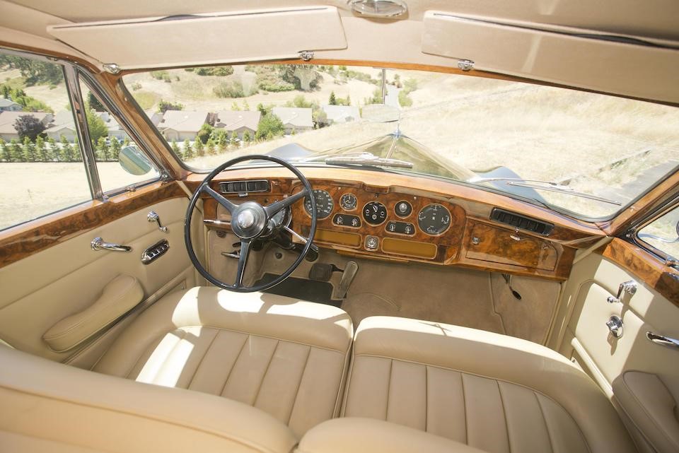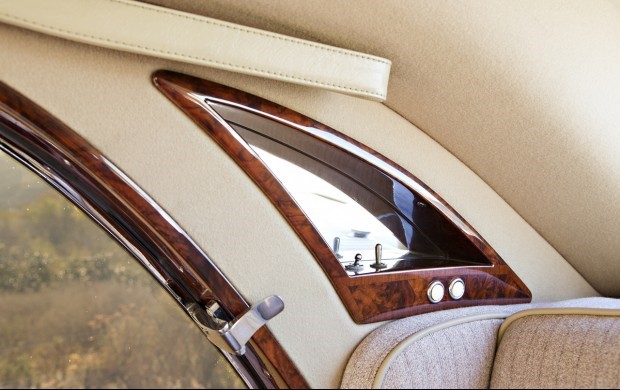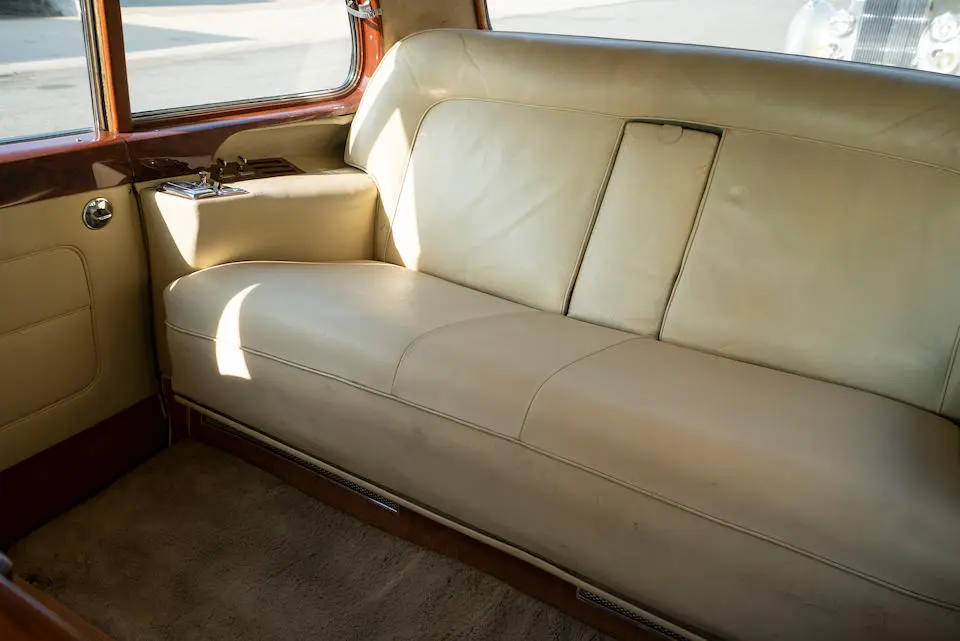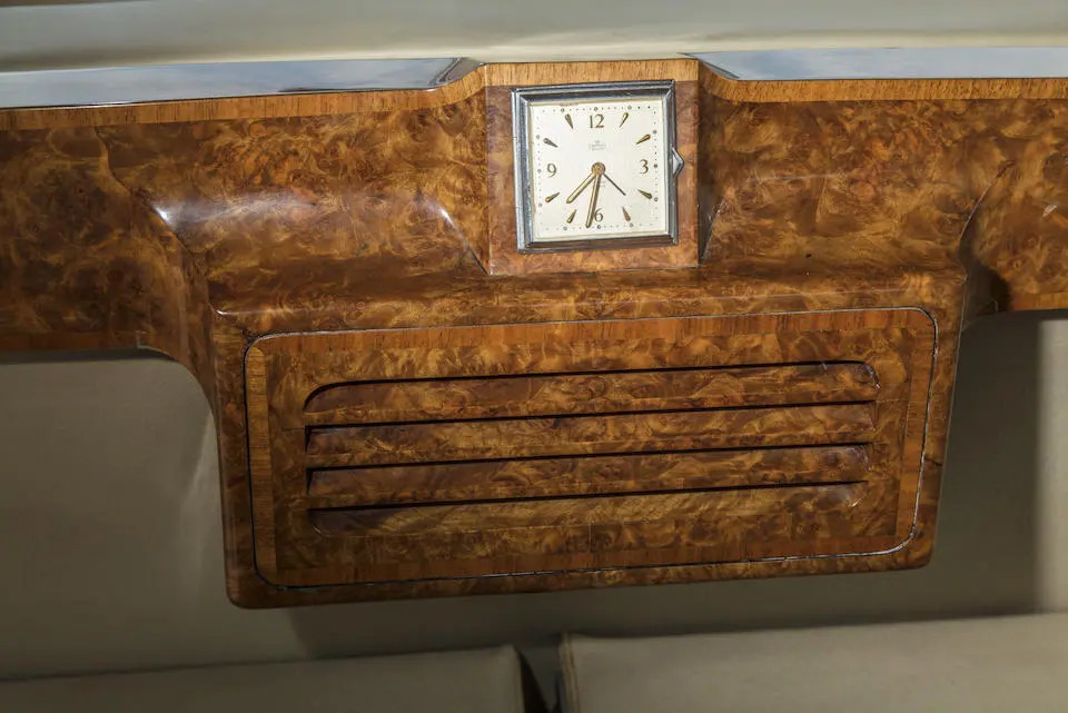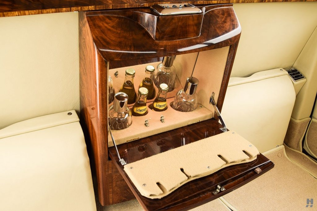5 L VB 19 : 1964, Touring Limousine par James Young, radio AM/FM, altimètre sur la boîte à gant, climatisation séparée av./arr., séparation à commande électrique, repose-pieds arrières, sièges occasionnels repliables, vases sur les montants de custode arrière, liseuses, montre Smiths à l’arrière, picnic tables, cocktail cabinet avec verrerie et carafes en cristal.