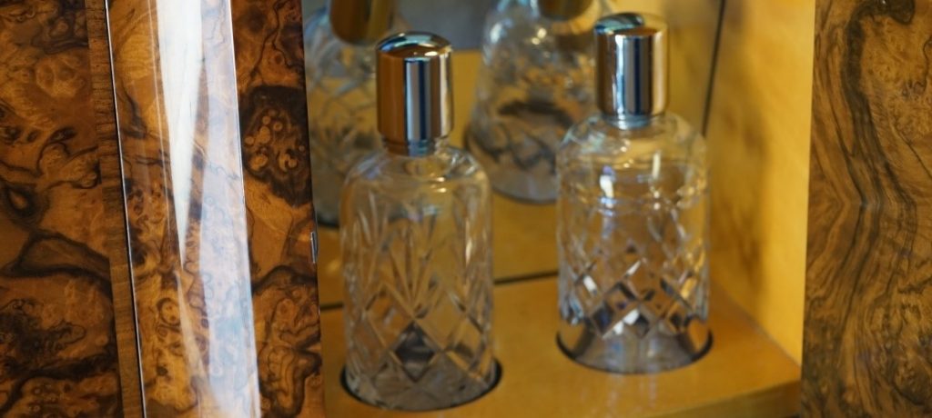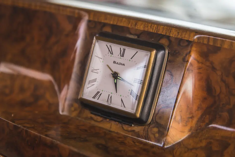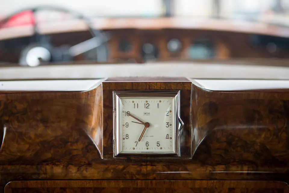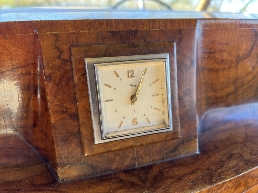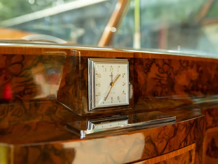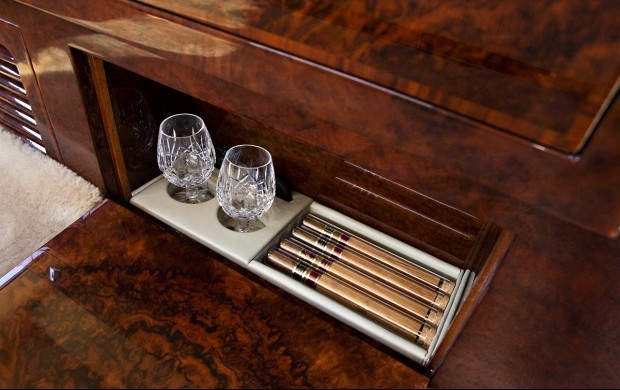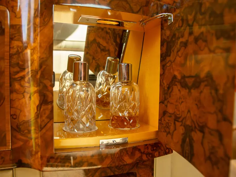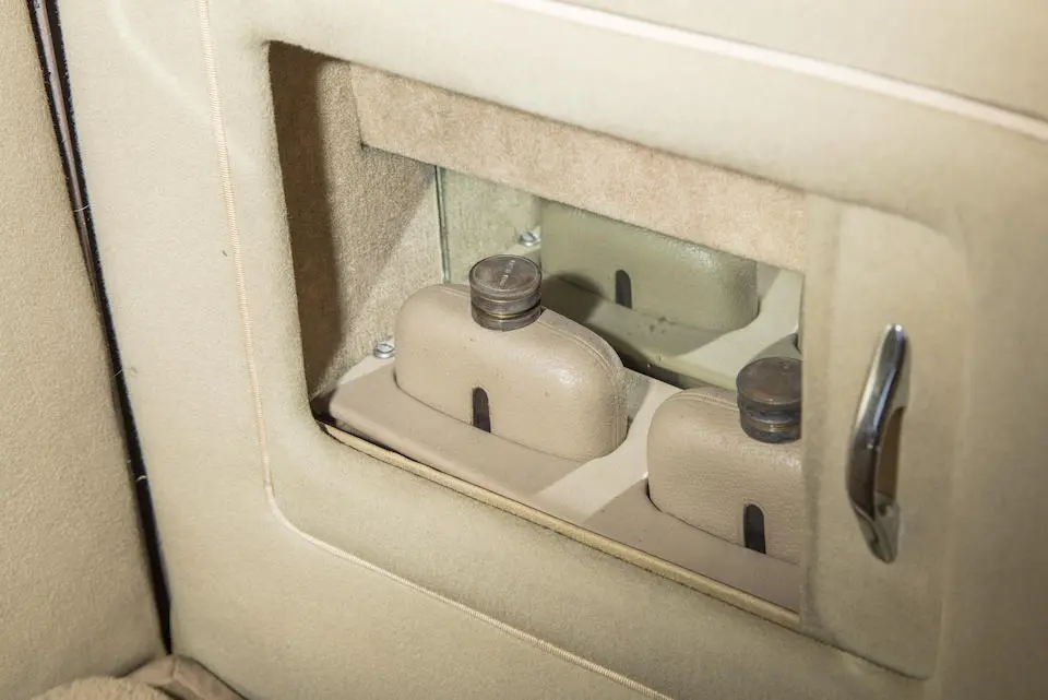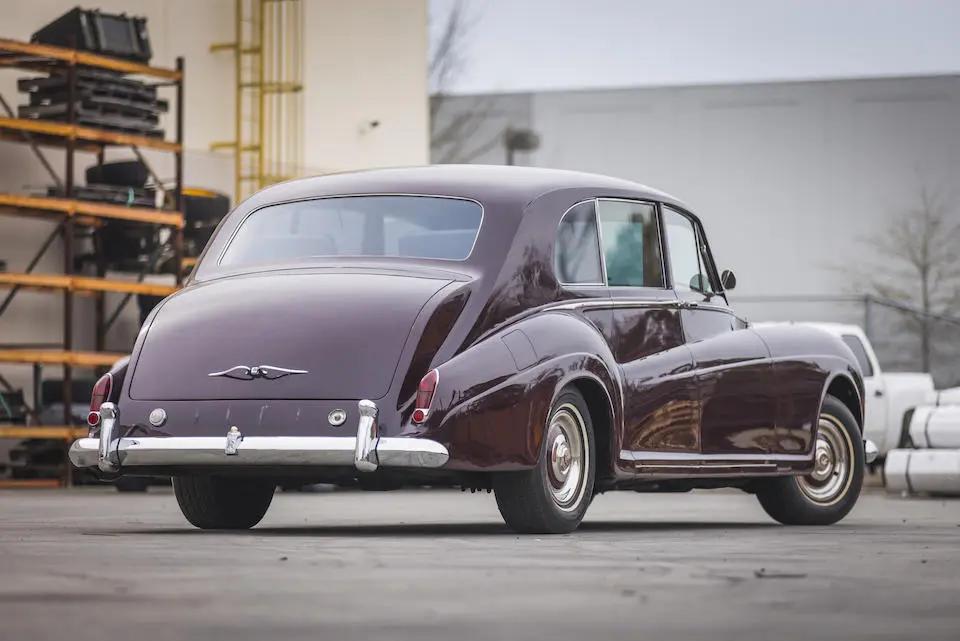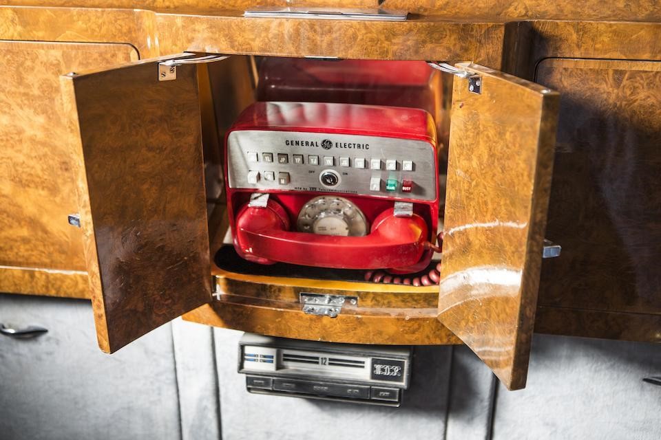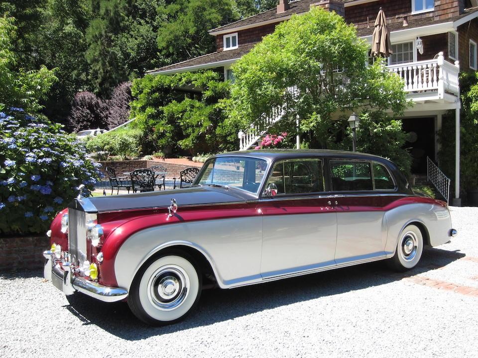 5 L VB 19 : 1964, Touring Limousine par James Young, radio AM/FM, altimètre sur la boîte à gant, climatisation séparée av./arr., séparation à commande électrique, repose-pieds arrières, sièges occasionnels repliables, vases sur les montants de custode arrière, liseuses, montre Smiths à l’arrière, picnic tables, cocktail cabinet avec verrerie et carafes en cristal.