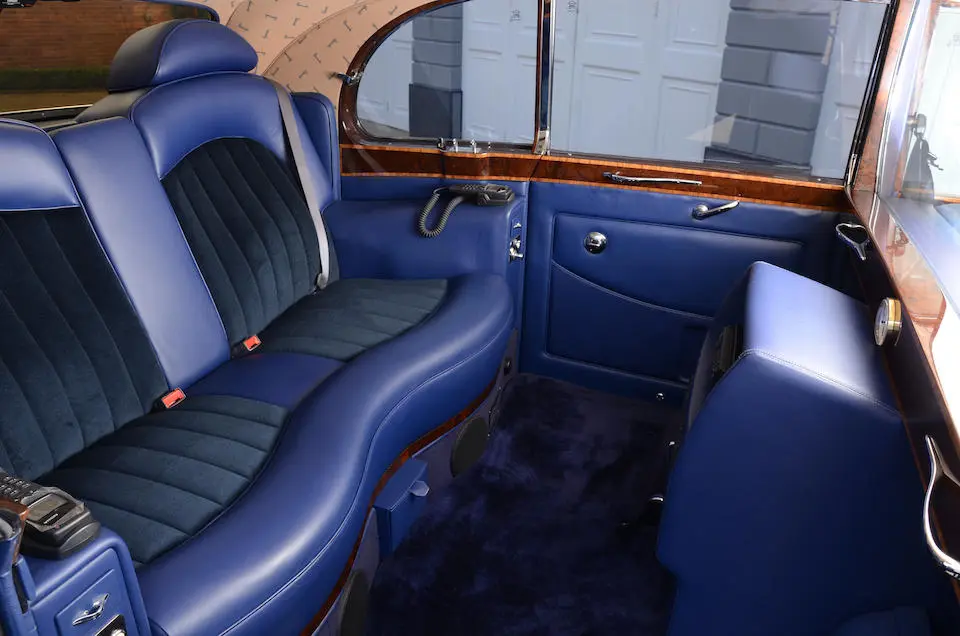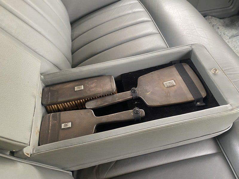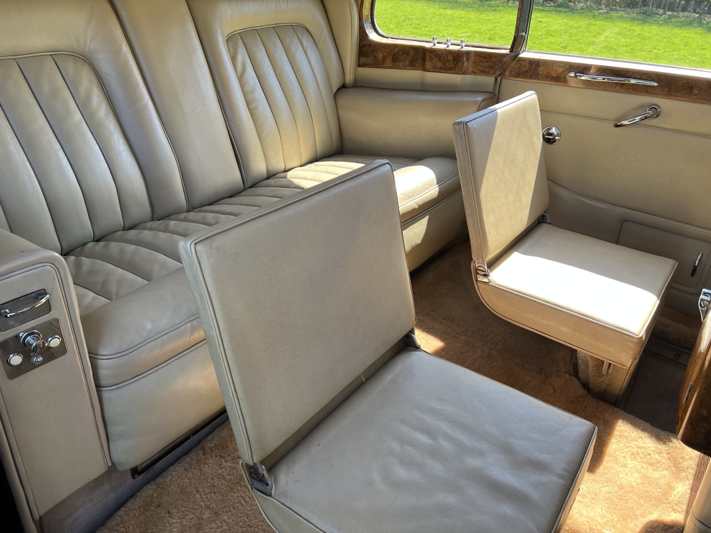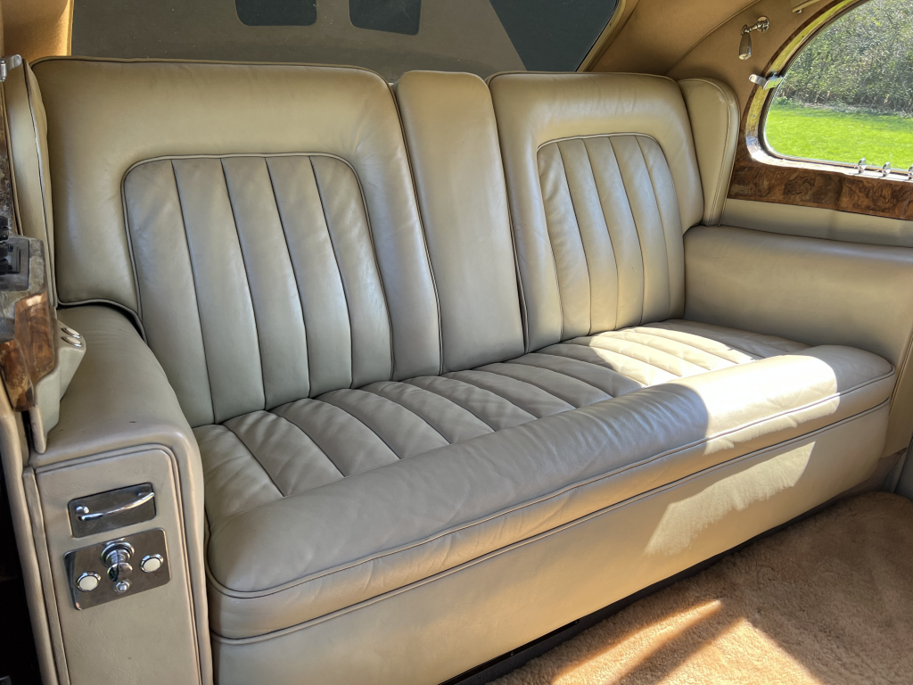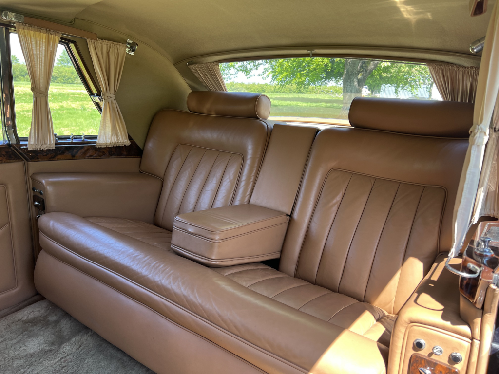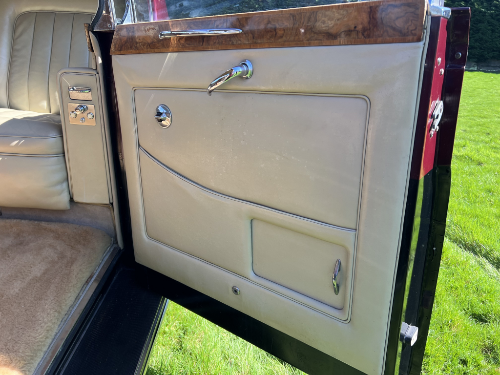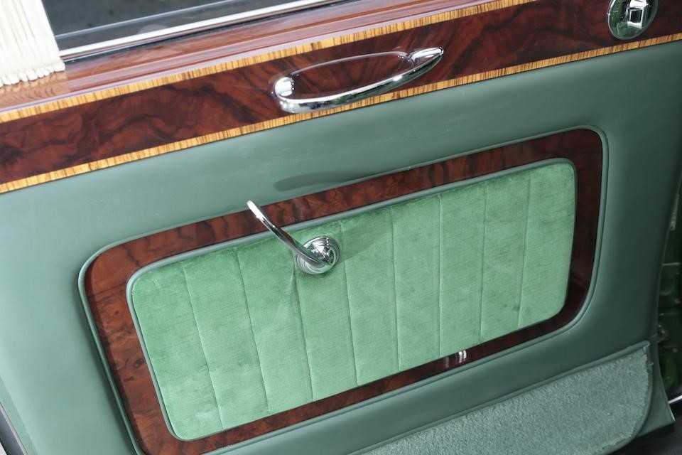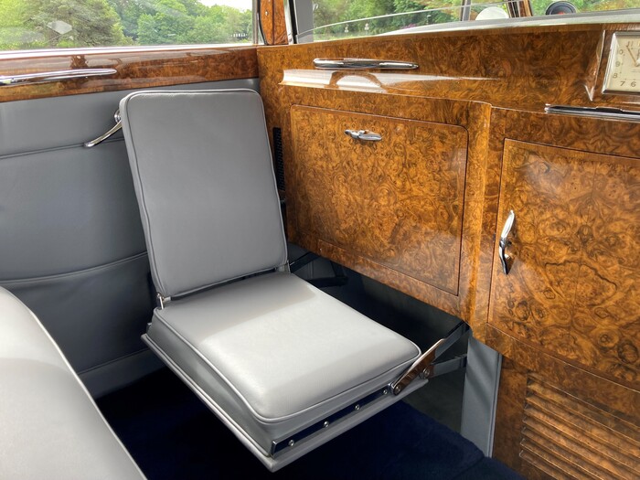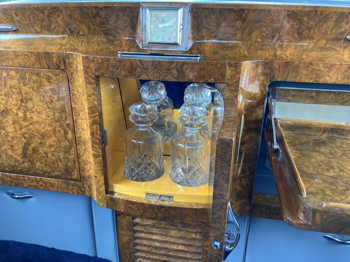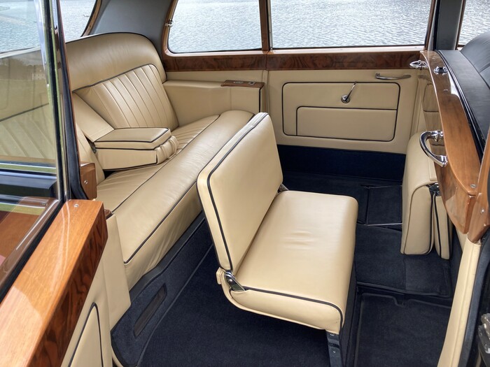 5 AT 76 : 1961, Sedanca de Ville par James Young (caisse 9117), moteur PV88A, bleu marine filets blancs (James Young Midnight Blue), cuir Connolly beige à l’avant (VM 3210), drap beige William Playne à l’arrière, moquettes en laine grise, pas de sièges supplémentaires remplacés par 2 cocktail cabinet avec verrerie en cristal et nécessaire de fumeur, 2 picnic tables, accoudoir avec miroir garni de cuir boîte à cigarettes et briquet, calepin avec stylo et brosse, immatriculation ET 36.
