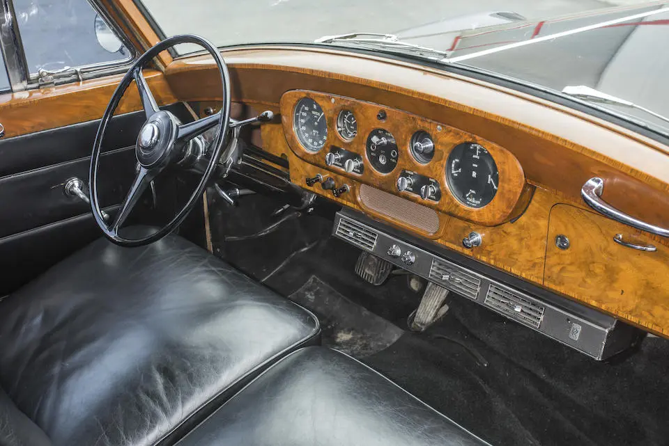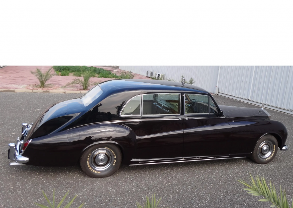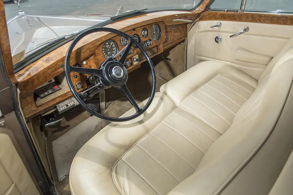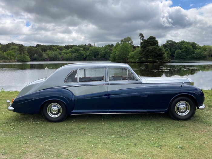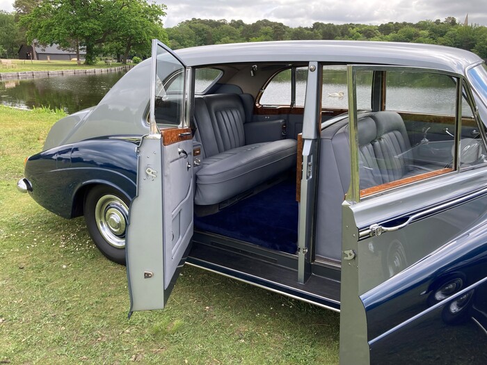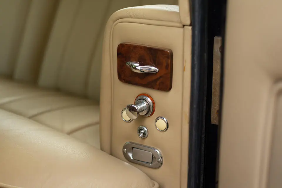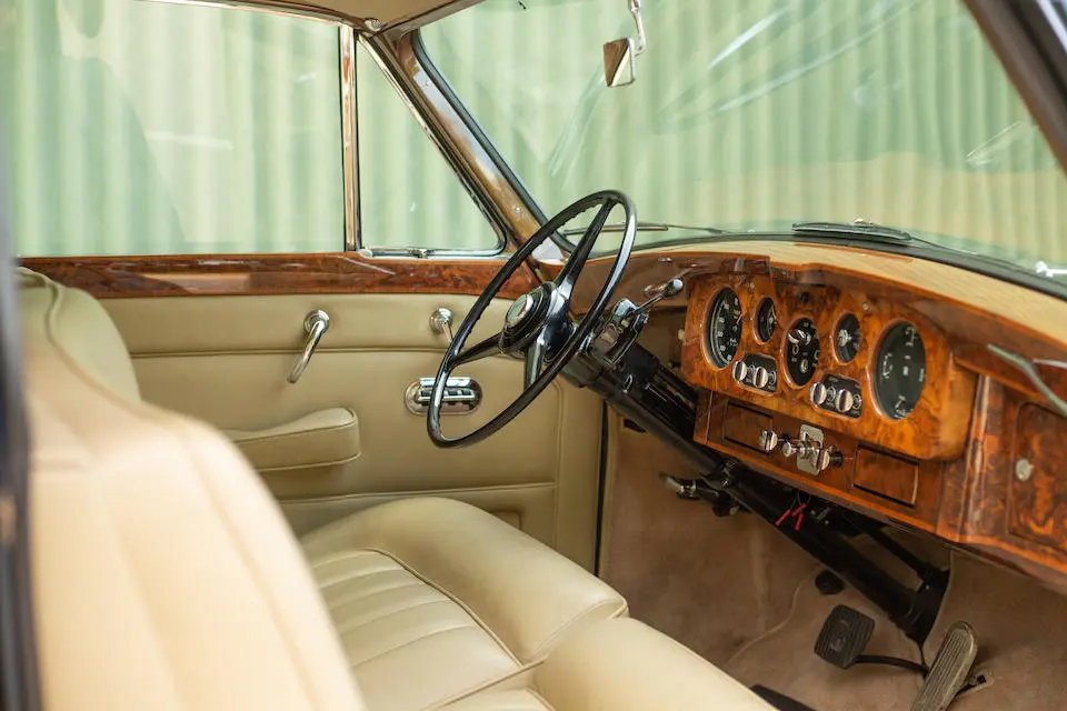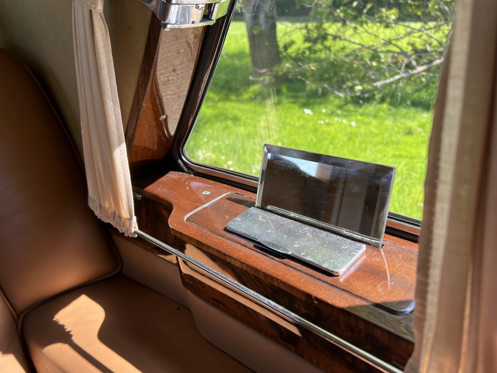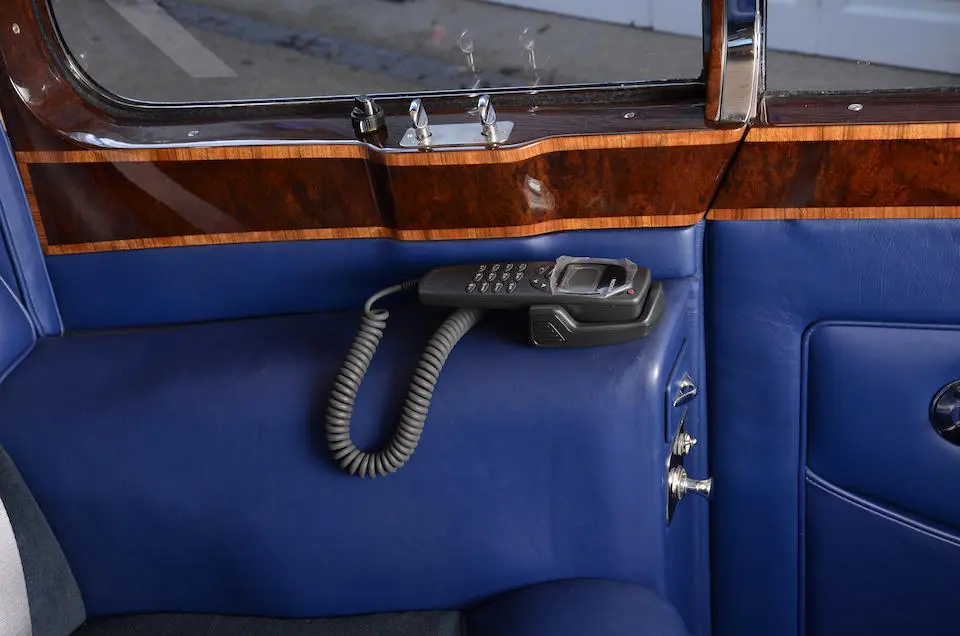 5 AT 76 : 1961, Sedanca de Ville par James Young (caisse 9117), moteur PV88A, bleu marine filets blancs (James Young Midnight Blue), cuir Connolly beige à l’avant (VM 3210), drap beige William Playne à l’arrière, moquettes en laine grise, pas de sièges supplémentaires remplacés par 2 cocktail cabinet avec verrerie en cristal et nécessaire de fumeur, 2 picnic tables, accoudoir avec miroir garni de cuir boîte à cigarettes et briquet, calepin avec stylo et brosse, immatriculation ET 36.
