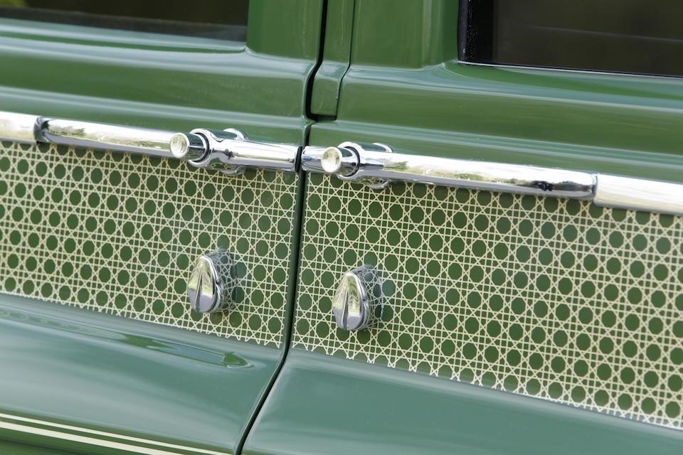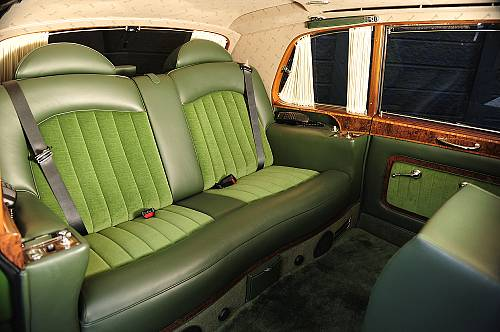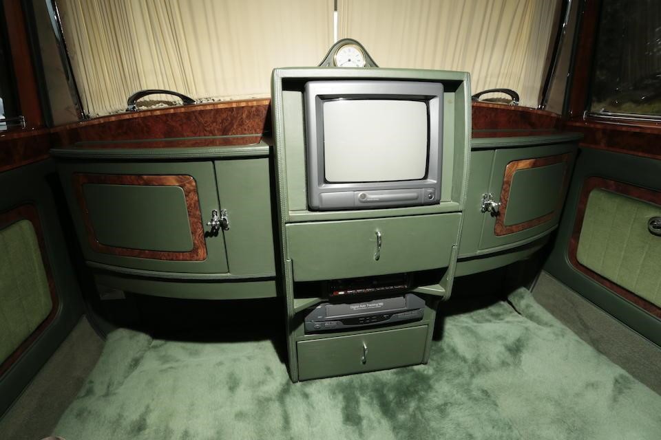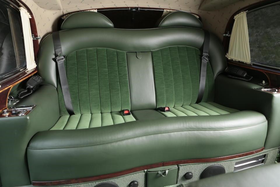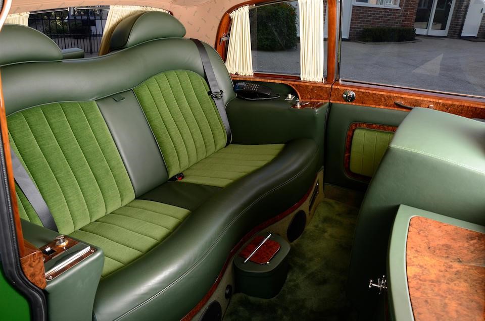 Harrods Green, cannage latéral, cuir vert, logo Harrods dans le ciel de toit, compartiment arrière avec télévision, fax, lecteur vidéo, 3 téléphones, cocktail cabinet et réfrigérateur.