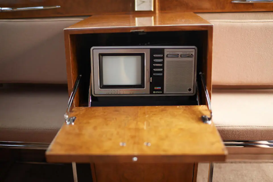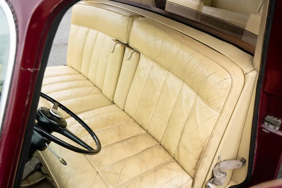 Rouge, filet or, initiales RC sur les portes, cuir naturel, radio AM/FM.
