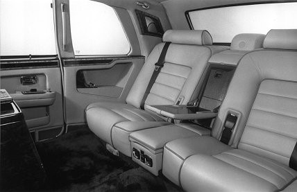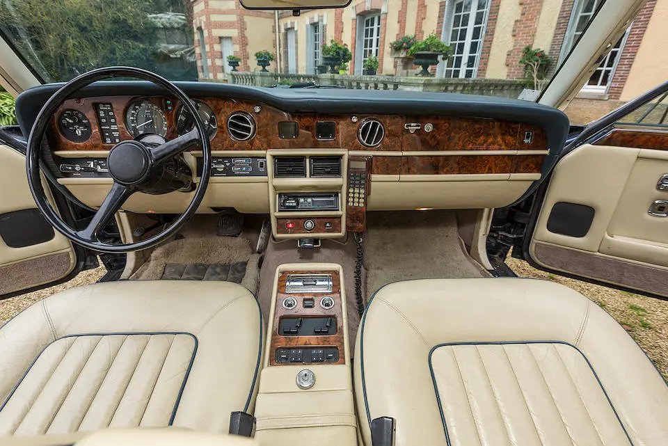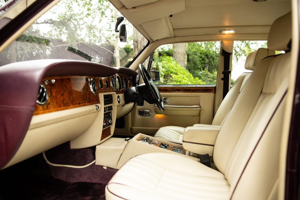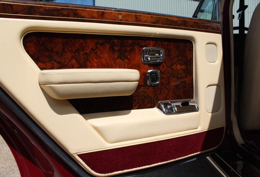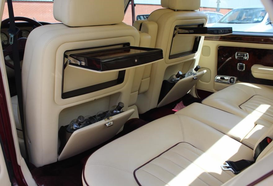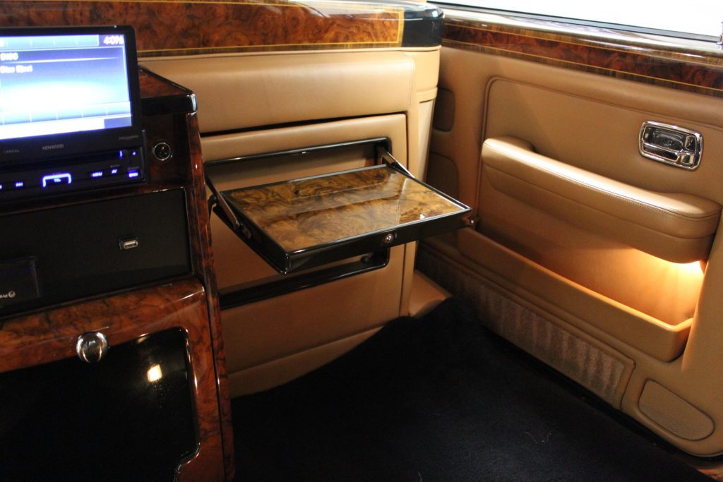 Boiseries en ronce de noyer d’Amérique avec inserts et monogrammes RR en argent. Réfrigérateur à l’arrière entre les sièges pouvant contenir 2 bouteilles de 1 l, cocktail cabinets sous les picnic tables des dossiers de sièges avant, contenant des verres et des carafes en cristal Royal Daulton, marqués MPW, accoudoir central conducteur avec rangement pour pièces et vide-poches, accoudoir passager avant avec téléphone cellulaire Motorola. Accoudoir central arrière avec connectique pour téléphone contenant un carnet de note en cuir et un stylo en argent, picnic table de gauche contenant un nécessaire à écrire avec stylo en argent Cross, celui de droite avec humidificateur garni de liège et coupe-cigare en argent Dunhill. Liseuses chromées et éclairage sur le montant de custode arrière, carnet d’entretien relié cuir magnolia dans la boîte à gants qui reçoit aussi une plaque commémorative. Système audio avec amplificateur 2×100 W dans le coffre et lecteur CD 6 disques et 10 HP dans l’habitacle. Ciel de toit plein cuir.