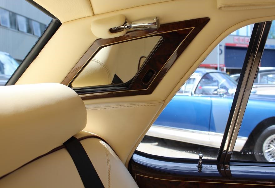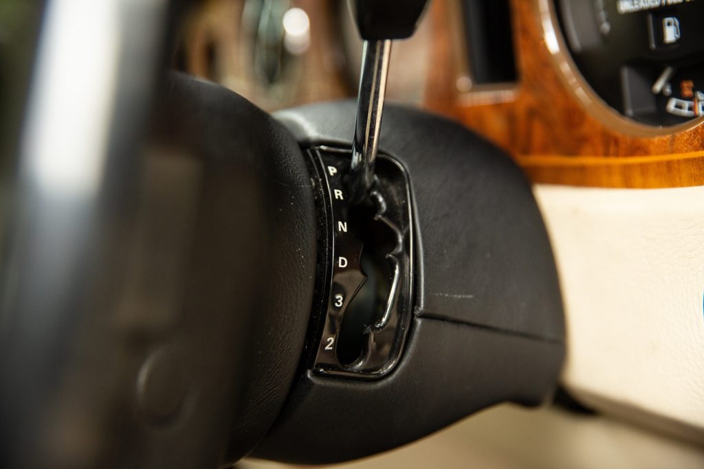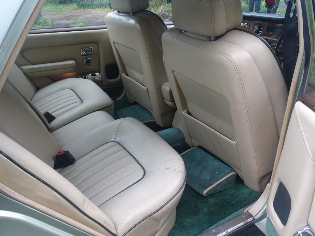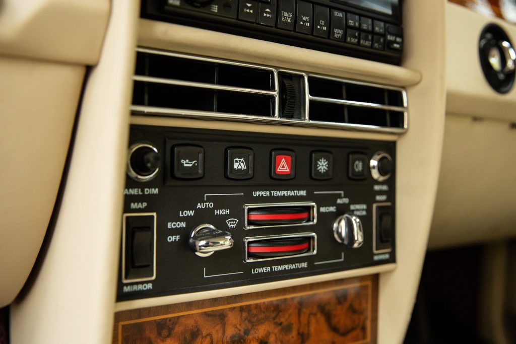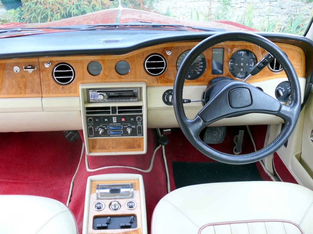 Boiseries en ronce de noyer d’Amérique avec inserts et monogrammes RR en argent. Réfrigérateur à l’arrière entre les sièges pouvant contenir 2 bouteilles de 1 l, cocktail cabinets sous les picnic tables des dossiers de sièges avant, contenant des verres et des carafes en cristal Royal Daulton, marqués MPW, accoudoir central conducteur avec rangement pour pièces et vide-poches, accoudoir passager avant avec téléphone cellulaire Motorola. Accoudoir central arrière avec connectique pour téléphone contenant un carnet de note en cuir et un stylo en argent, picnic table de gauche contenant un nécessaire à écrire avec stylo en argent Cross, celui de droite avec humidificateur garni de liège et coupe-cigare en argent Dunhill. Liseuses chromées et éclairage sur le montant de custode arrière, carnet d’entretien relié cuir magnolia dans la boîte à gants qui reçoit aussi une plaque commémorative. Système audio avec amplificateur 2×100 W dans le coffre et lecteur CD 6 disques et 10 HP dans l’habitacle. Ciel de toit plein cuir.