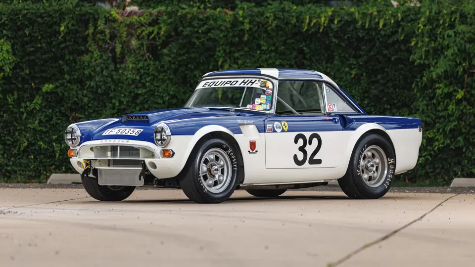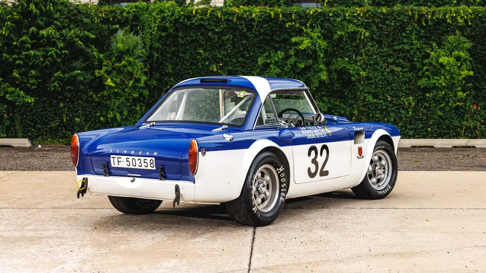 B 9102730/OD/HRO : 14/01/1961, Coupé Série II modifications Harrington, Wedgwood Blue, toit fibre de verre avec ouïes de ventilation au-dessus de la lunette arrière, avant profilé (dessin par Clifford Harrington), ouvrants en aluminium, vitres en Perspex. Overdrive revu sur le 4e rapport, rapport de pont allongé, gros réservoir d’essence derrière les sièges avec goulotte de remplissage style Aston Martin au niveau de la vitre ARD, sièges baquet Microcell, volant Colotti à cerclage bois, moteur n° EXP 421 avec culasse EXP 1, préparé par le département compétition de Rootes, Ryton (G-B) sous la direction de Norman Garrard avec le soutien de Mike Parkes, 100 ch +.