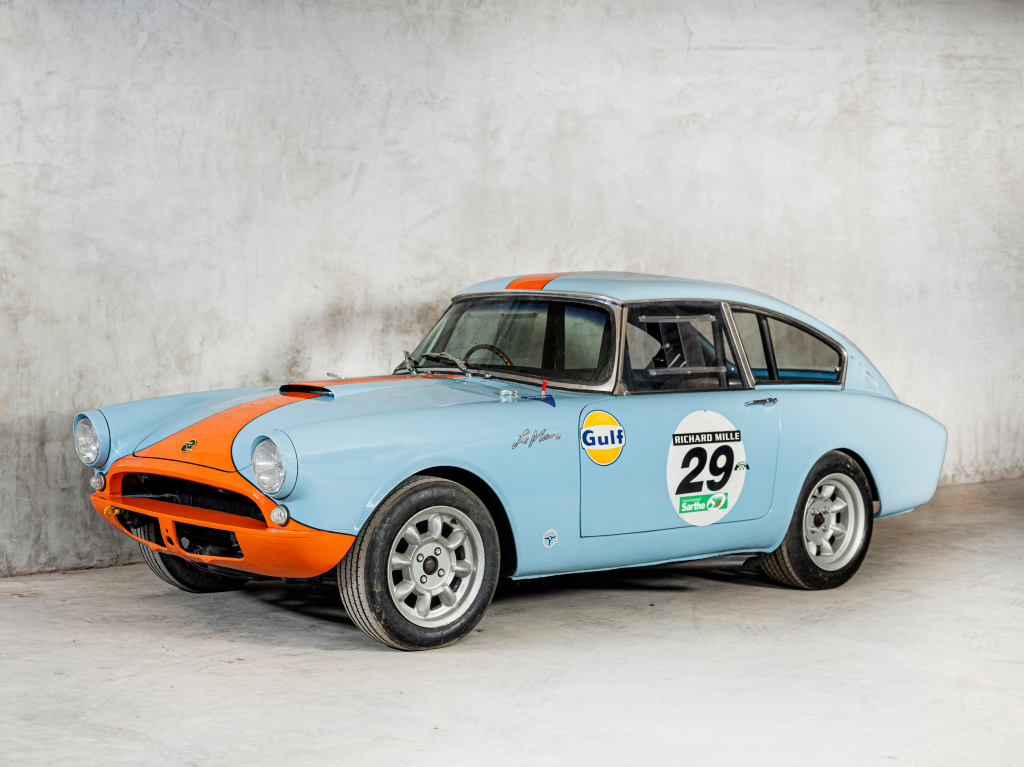 B 9102730/OD/HRO : 14/01/1961, Coupé Série II modifications Harrington, Wedgwood Blue, toit fibre de verre avec ouïes de ventilation au-dessus de la lunette arrière, avant profilé (dessin par Clifford Harrington), ouvrants en aluminium, vitres en Perspex. Overdrive revu sur le 4e rapport, rapport de pont allongé, gros réservoir d’essence derrière les sièges avec goulotte de remplissage style Aston Martin au niveau de la vitre ARD, sièges baquet Microcell, volant Colotti à cerclage bois, moteur n° EXP 421 avec culasse EXP 1, préparé par le département compétition de Rootes, Ryton (G-B) sous la direction de Norman Garrard avec le soutien de Mike Parkes, 100 ch +.