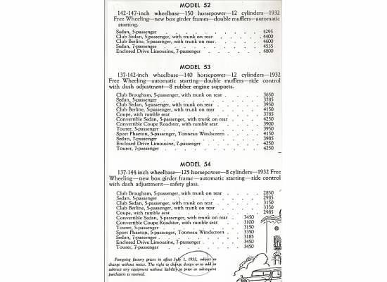 1933 : 7572 cm3, soupapes à commande hydraulique à rattrapage de jeu hydraulique. collecteur admission agrandi, 1 carburateur double corps avec starter automatique, taux de compression : 6,0 :1, 7573 cm3, 175 ch.