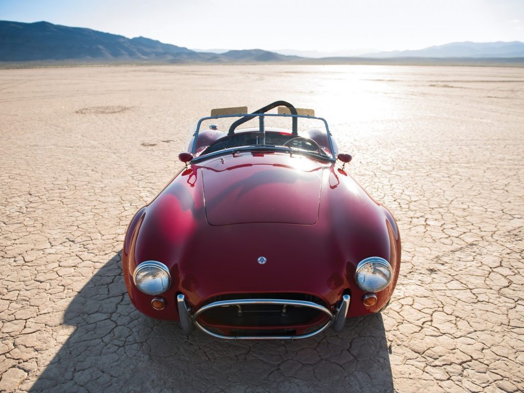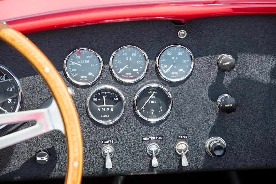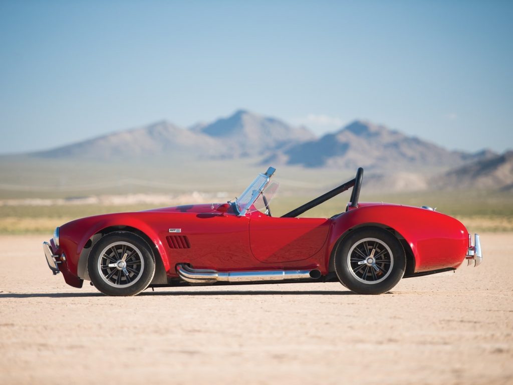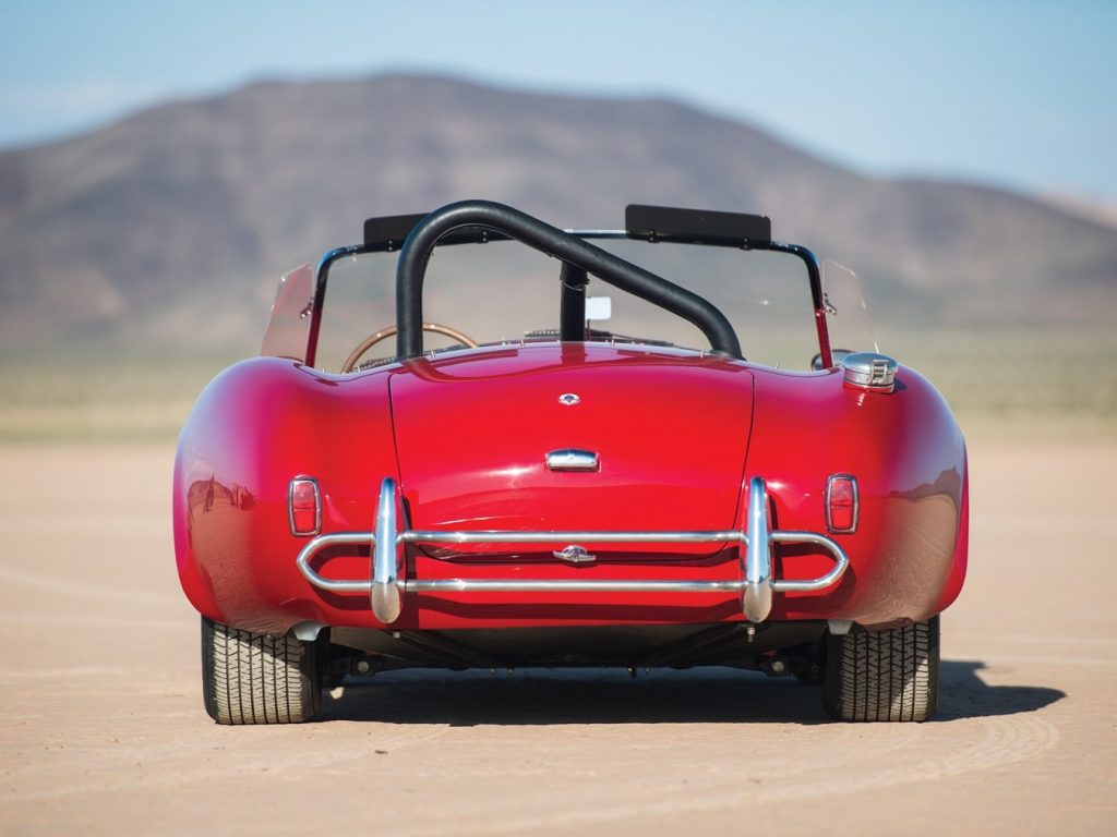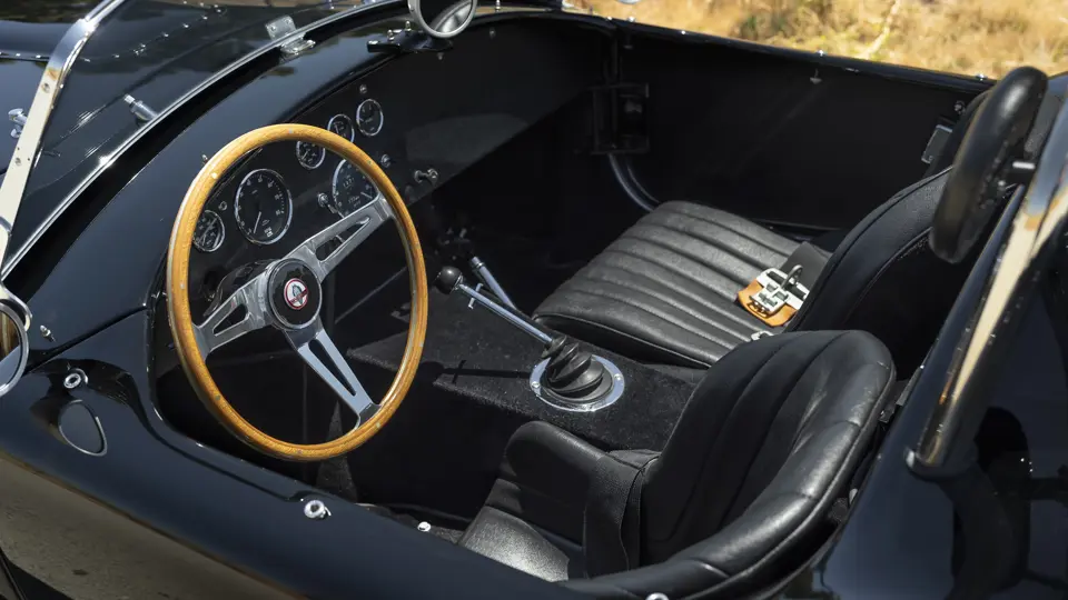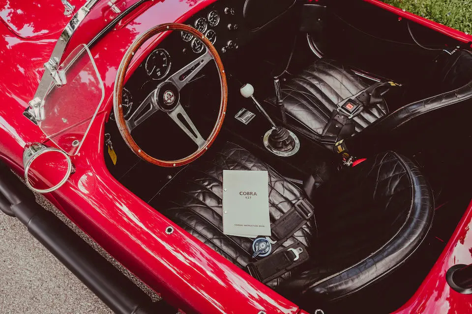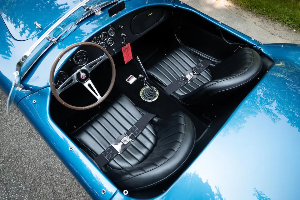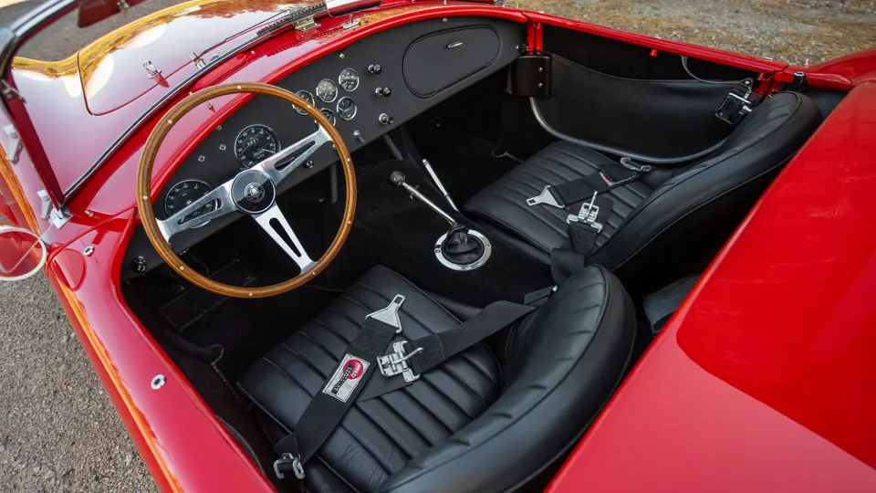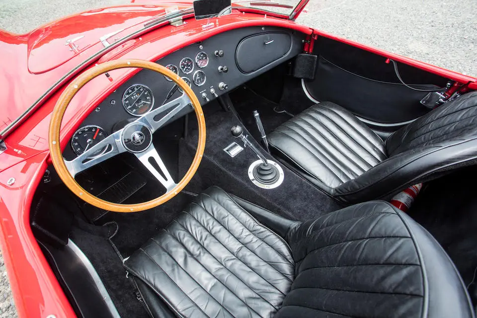 Mise en configuration S/C, échappements latéraux chromés, arceau noir, prise d’air de capot, réservoir 36 gallons avec goulotte de remplissage d’essence à ouverture rapide, jantes Hallibrand à fixation centrale, pneus BF Goodrich T/A Comp., étriers de freins à 4 pistons, amortisseurs Koni, culasse aluminium, radiateur d’huile, carburateur Holley 715-CFM, caisse aluminium par Brian Angliss, Sussex (G-B), volant cerclé bois avec emblème central AC, rétroviseur Talbot Yorck, Rouge.