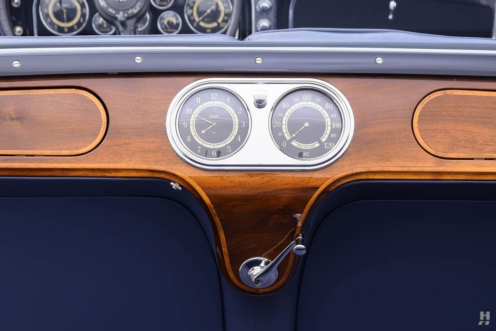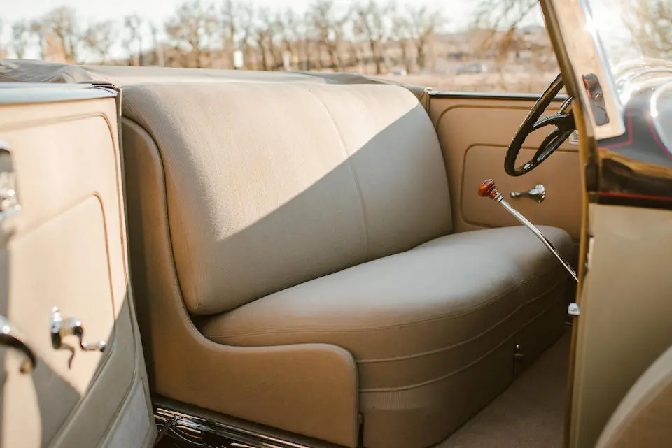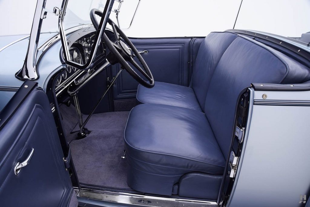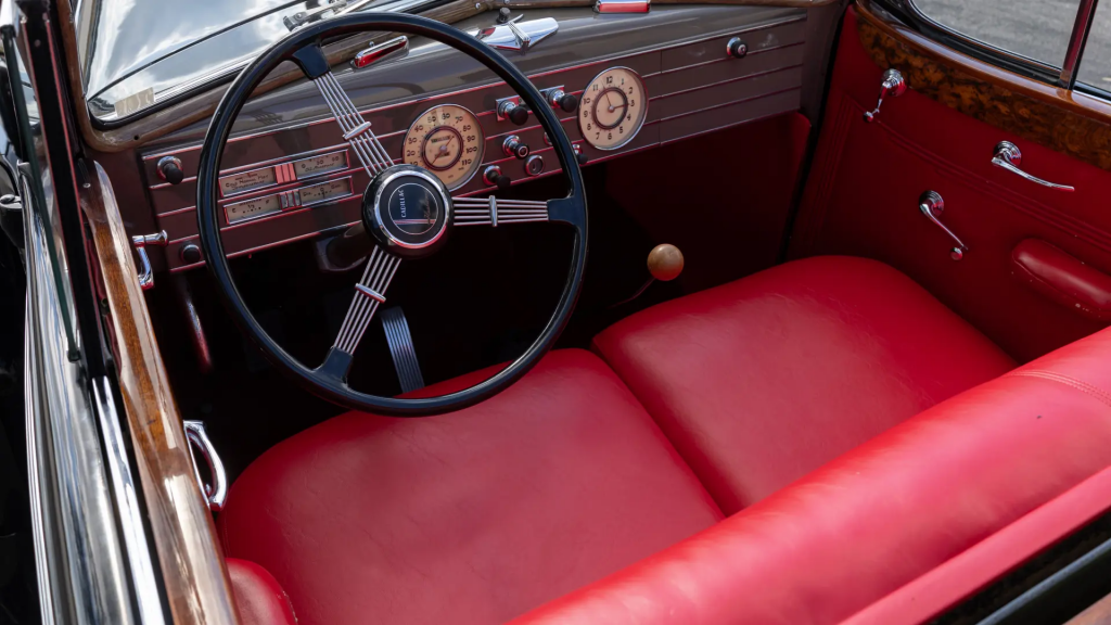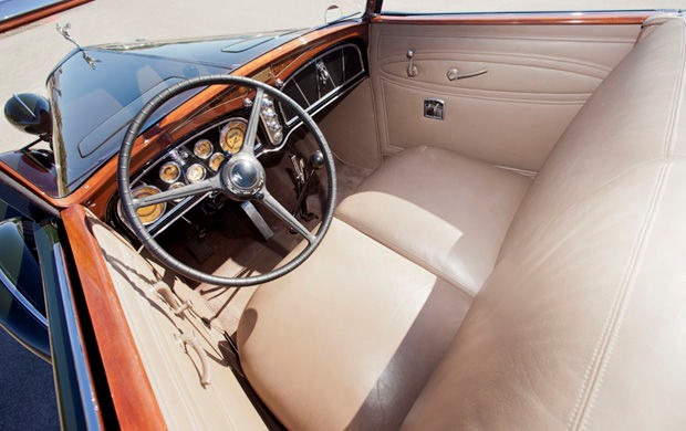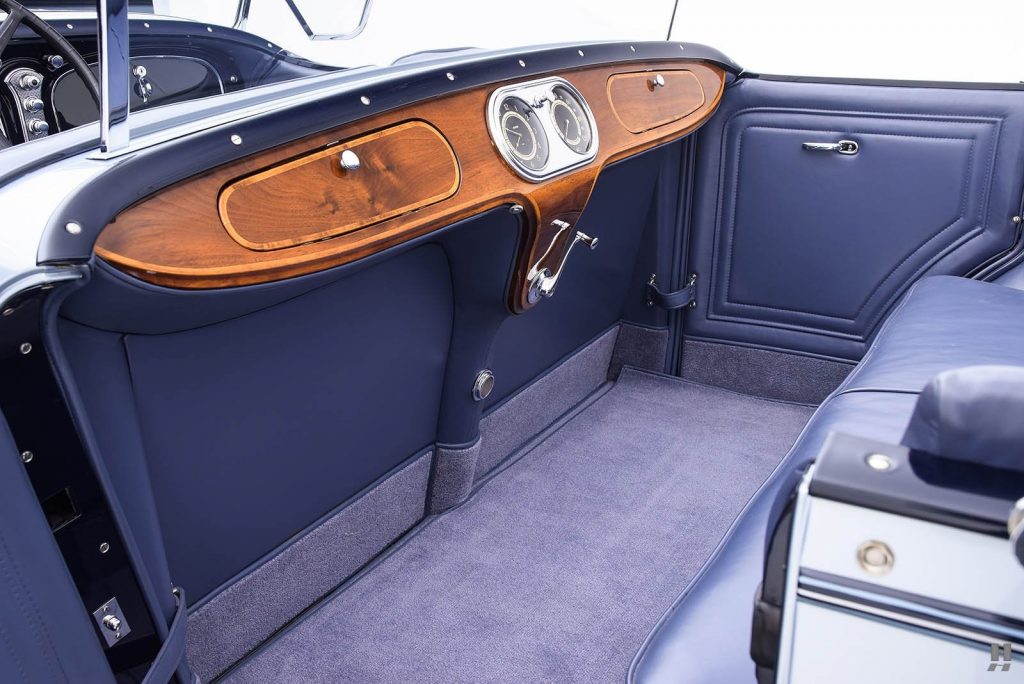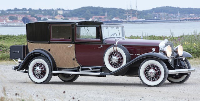 Style 4212 : Transformable Town car cabriolet 4 portes, pare-brise plat incliné de 7°. Boiseries en noyer avec incrustations ébène, montre 8 jours Jaeger, séparation, interphone, pré-équipement radio, repose-pieds arrières, accoudoir central escamotable arrière, sièges arrières réglables, stores en soie. Toit recouvert cuir avec faux compas arrière, pas de vitres de custode arrière.