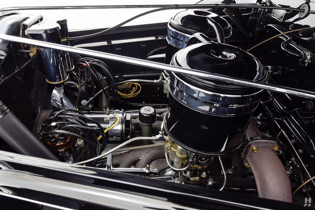Tous les éléments périphériques du moteur sont doublés à l’exception de la dynamo. Cadillac travaille aussi l’esthétique du moteur en cachant les fils de l’allumage et des bougies sous des carters peints et monte un cache-culbuteur en acier chromé.