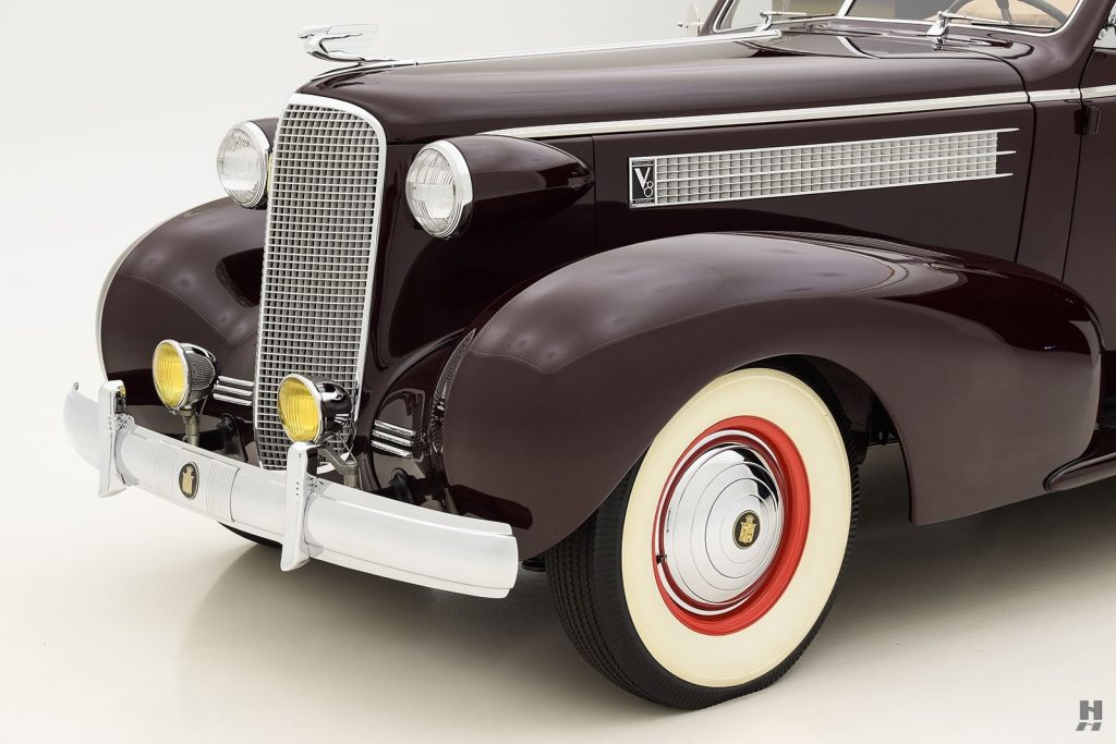 1937 : Nouvelle calandre, 3 barrettes chromées entre les ailes et la calandre, ailes avant redessinées en forme d’obus, sigle V8 sur le haut de la calandre, à droite. Les modifications sont dues à Harley J. Earl.