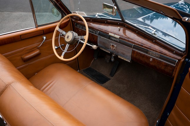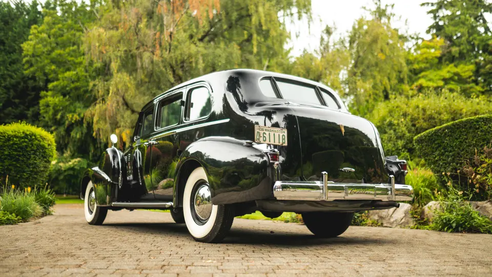 3320622 : 1940, Série 75 Formal Sedan, noire, cuir brun à l’avant, roues de secours sur les ailes, microphone passagers/chauffeur, radio Motorola et montre dans le compartiment arrière.