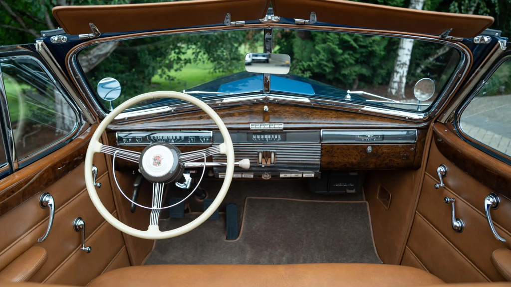 3320622 : 1940, Série 75 Formal Sedan, noire, cuir brun à l’avant, roues de secours sur les ailes, microphone passagers/chauffeur, radio Motorola et montre dans le compartiment arrière.