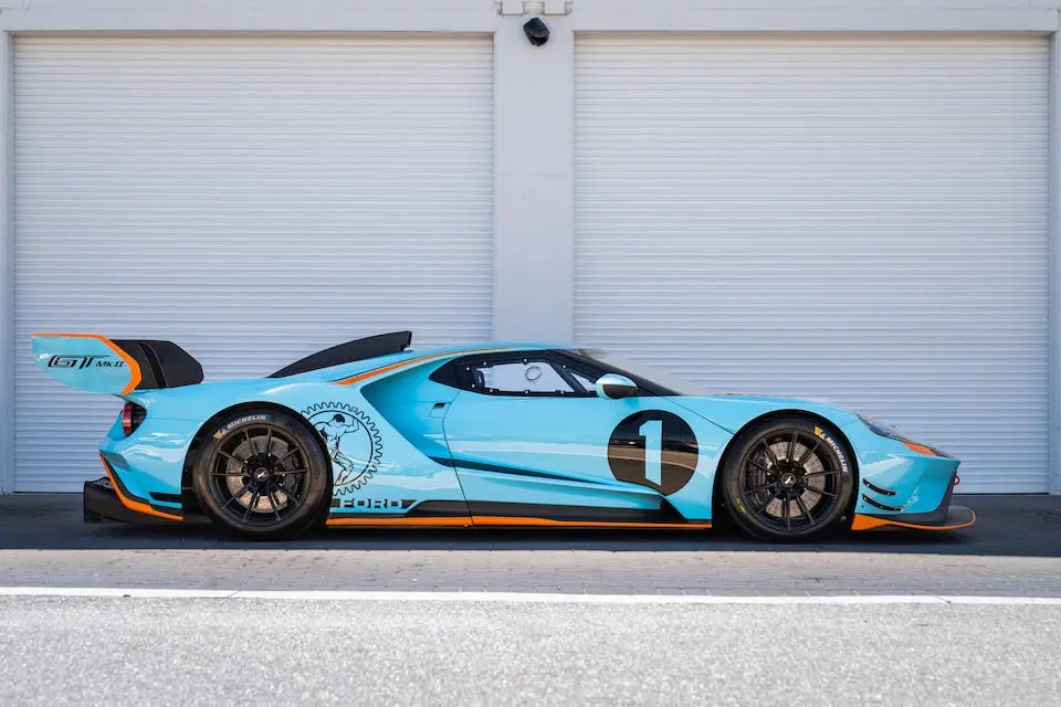 FP-MM-MKII-018 : 2020, GT MKII/Comp., crics pneumatiques, sièges Sparco, harnais 6 points, arceau-cage, radio et intercom, caméra arrière, Gulf Heritage Blue, inserts Epic Gulf Orange/noir,