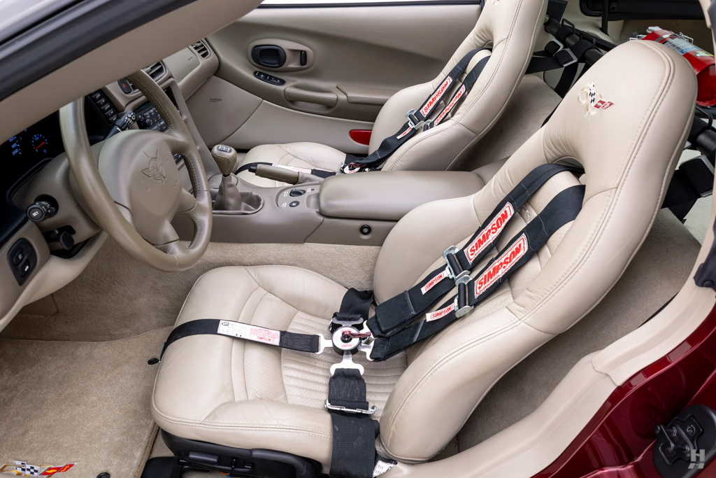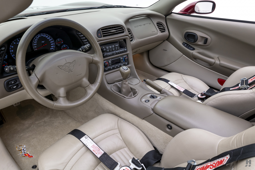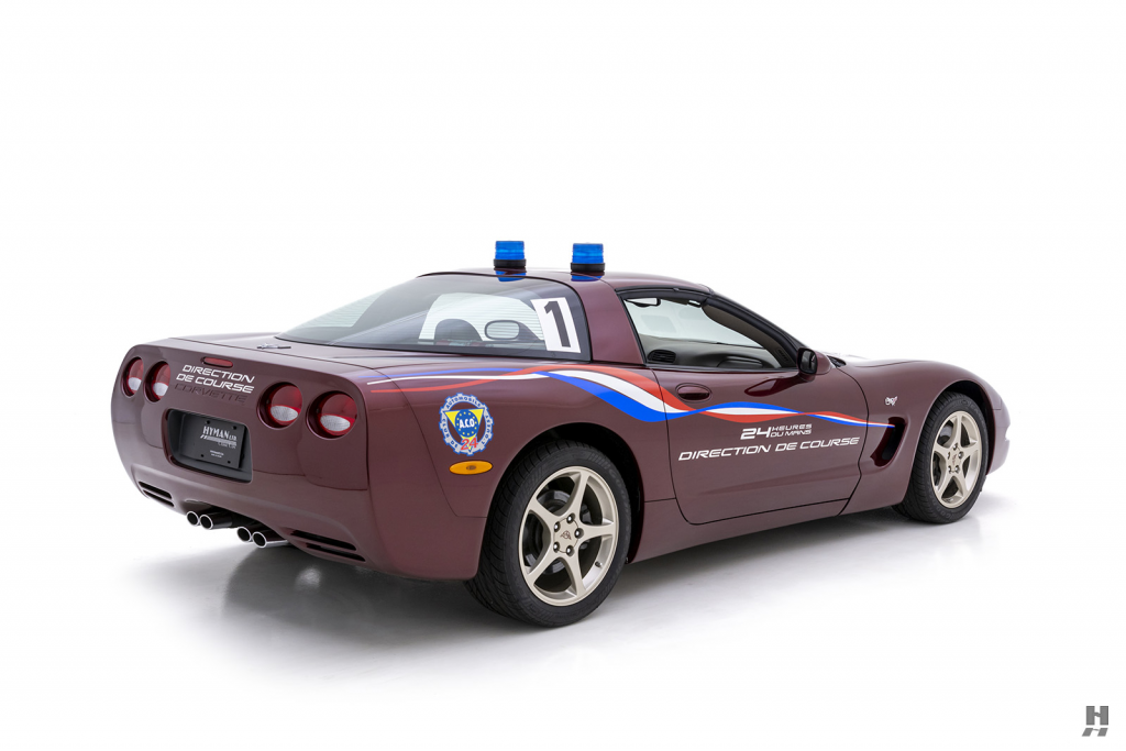 1G1YY22G635100007 : 2003, Corvette Coupé, Pace Car des 24 Heures du Mans 2003, boîte de vitesses manuelle, échappement Borla, 2 gyrophares sur le toit, configuration 50th anniversary, jantes aluminium Champagne, harnais 5 points Simpson conducteur et passager, extincteur derrière les sièges, Anniversary Red (94),